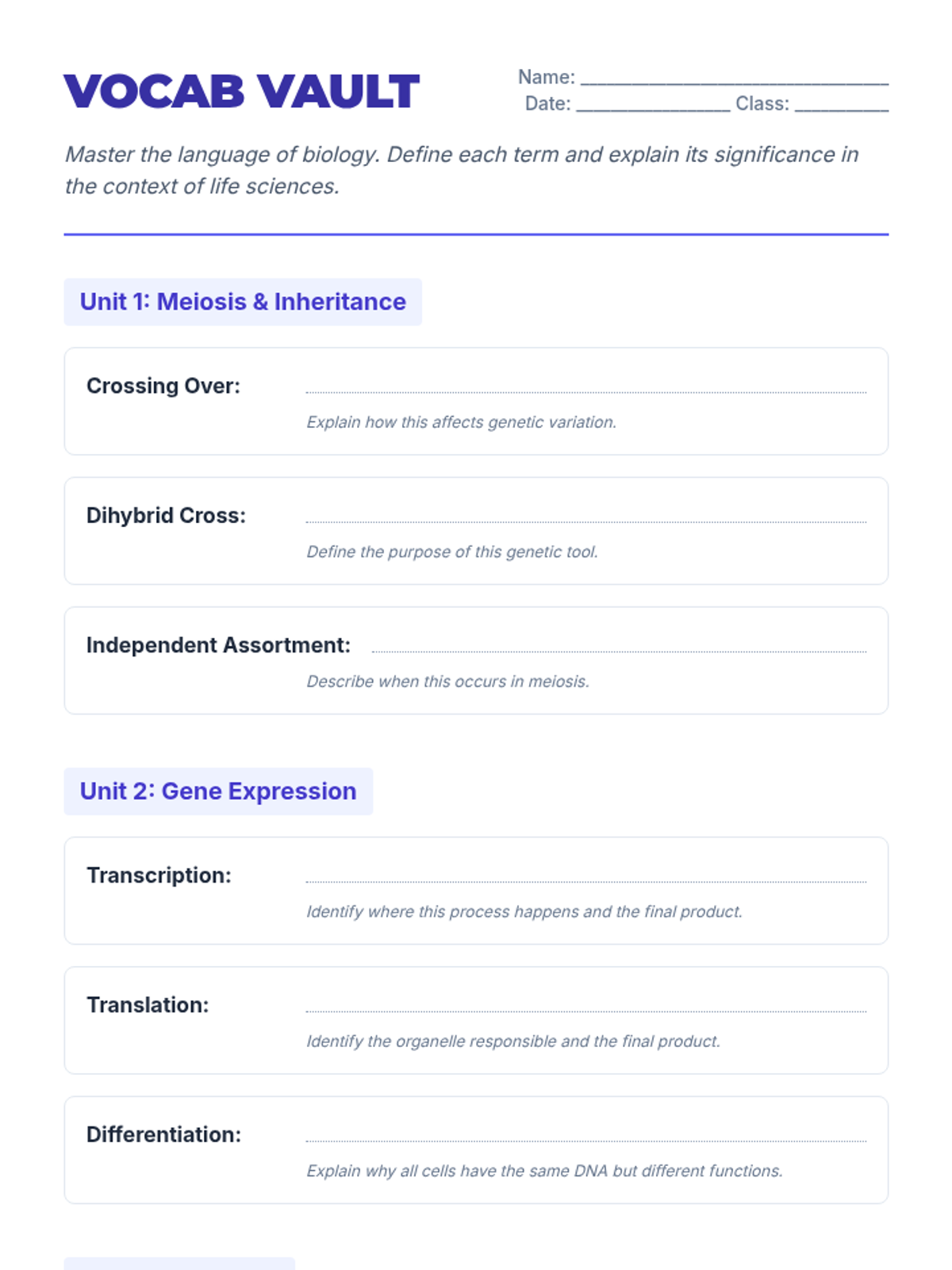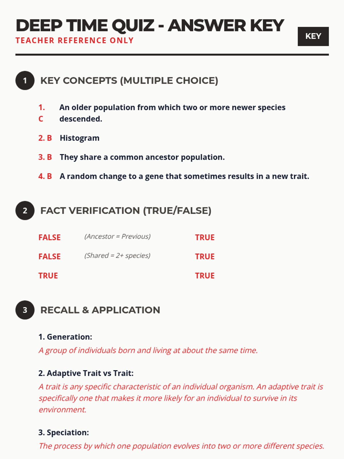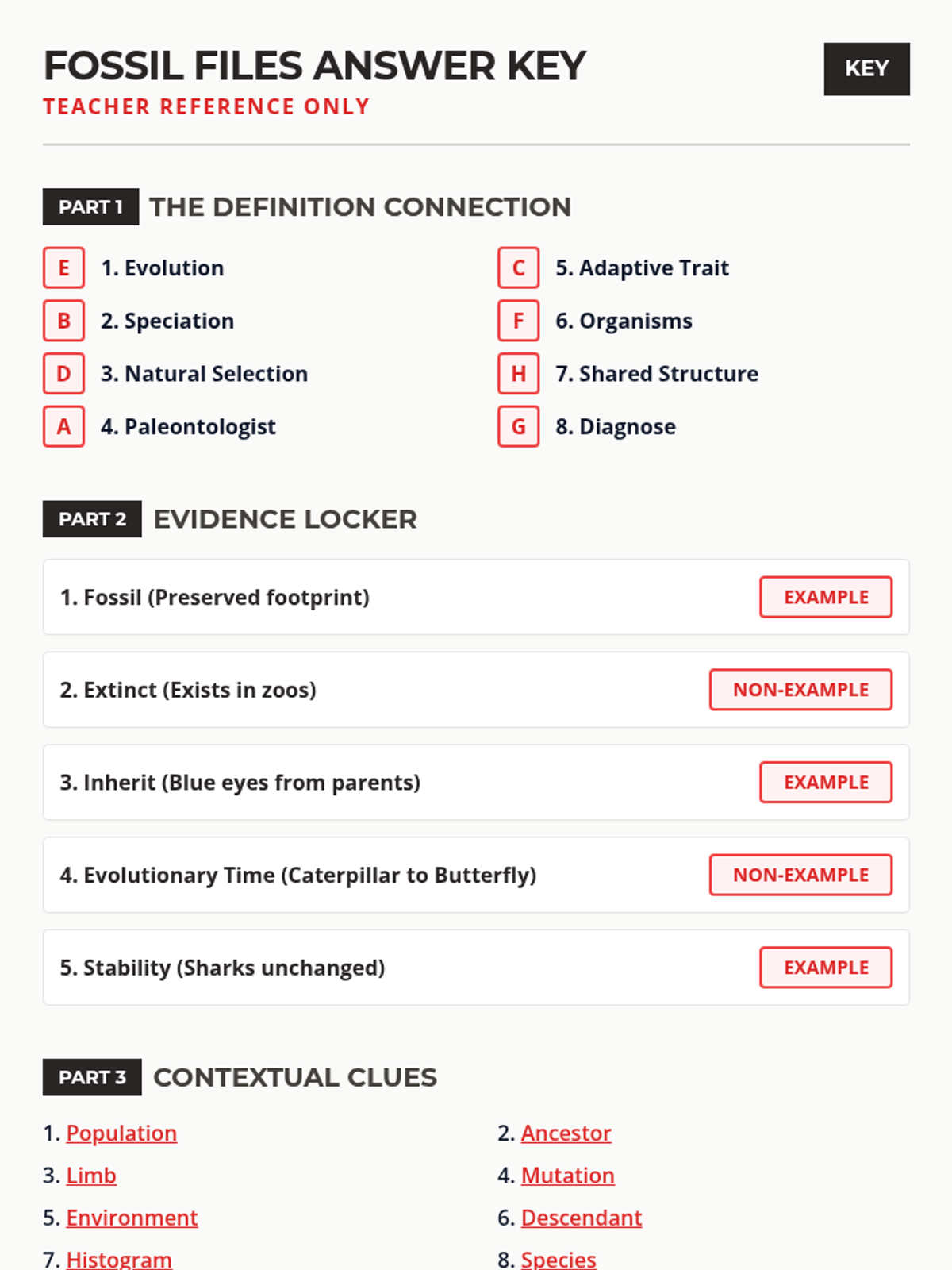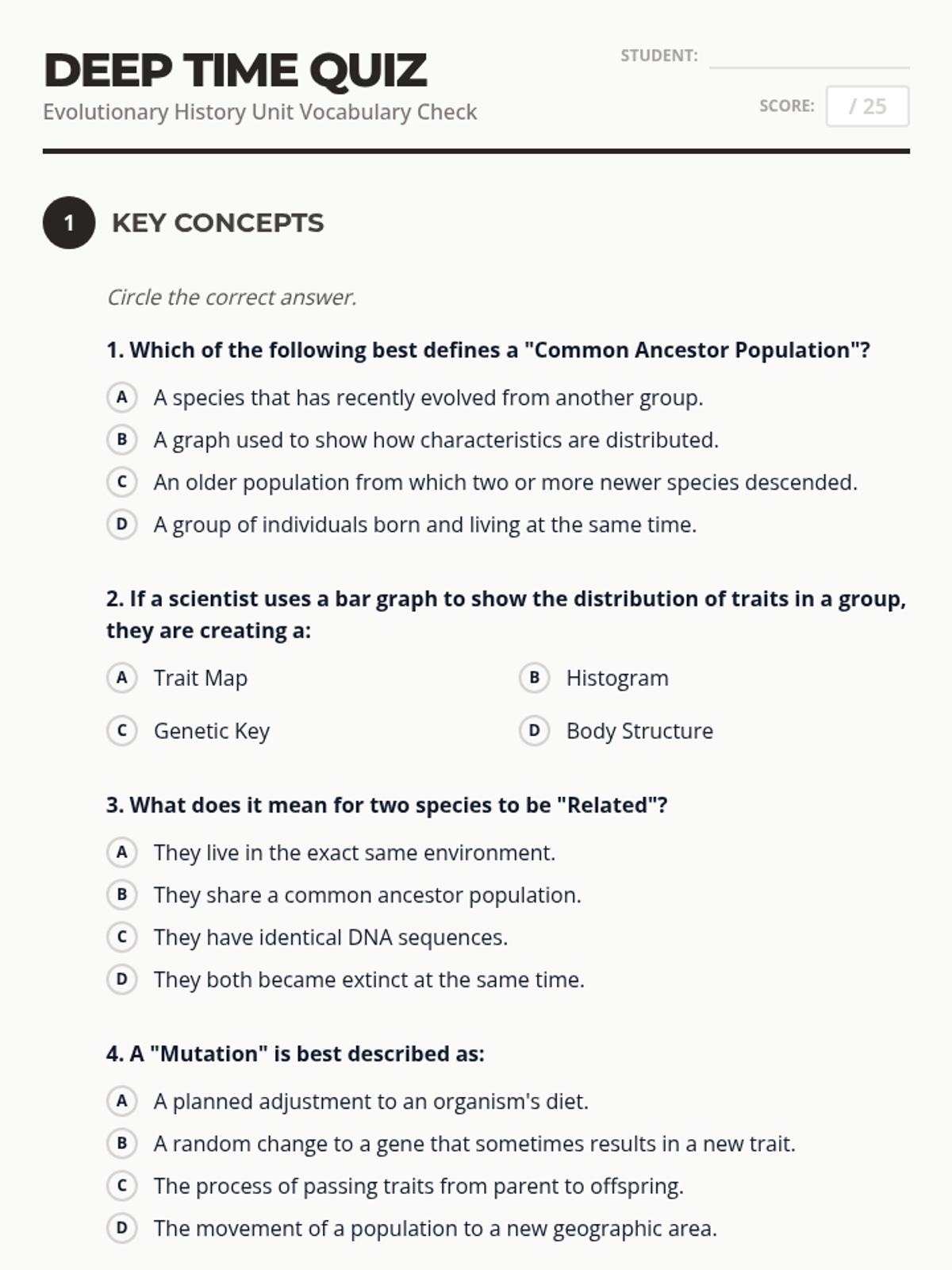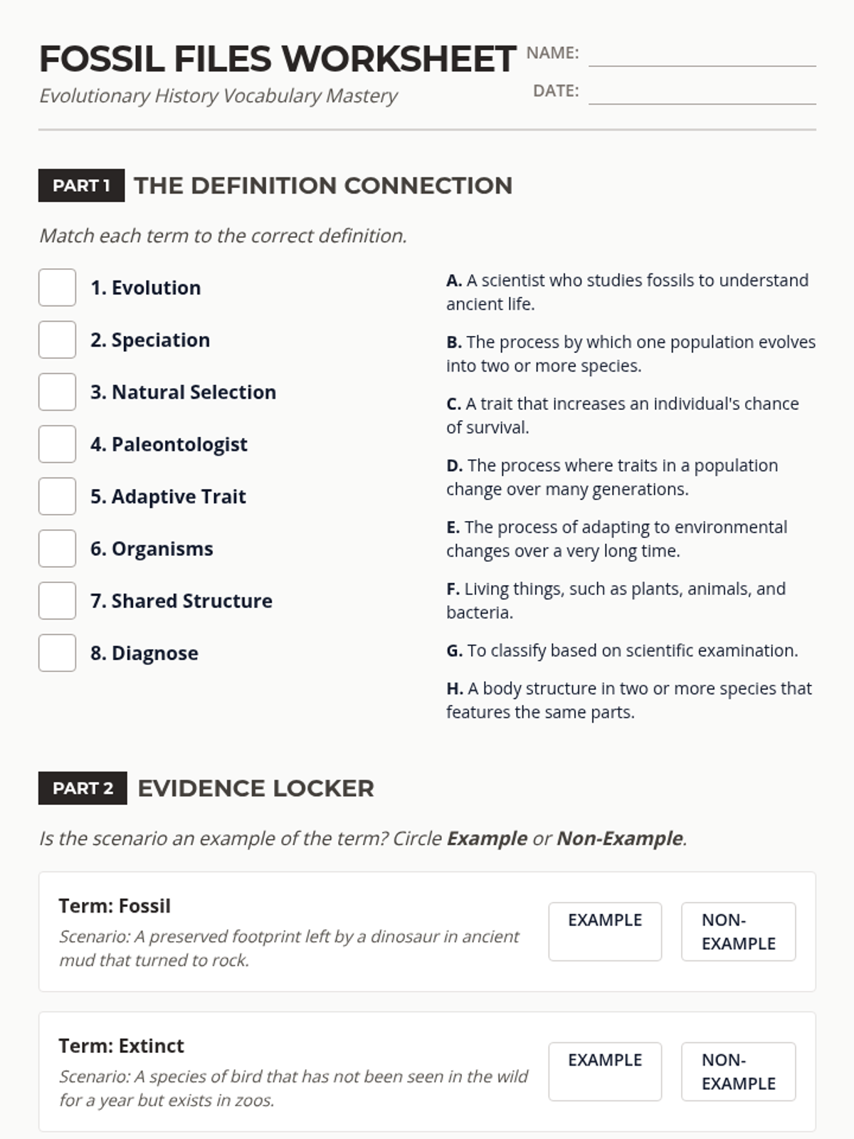 A comprehensive vocabulary lesson focused on the terminology of evolutionary history, including definitions, application through examples, and assessment.