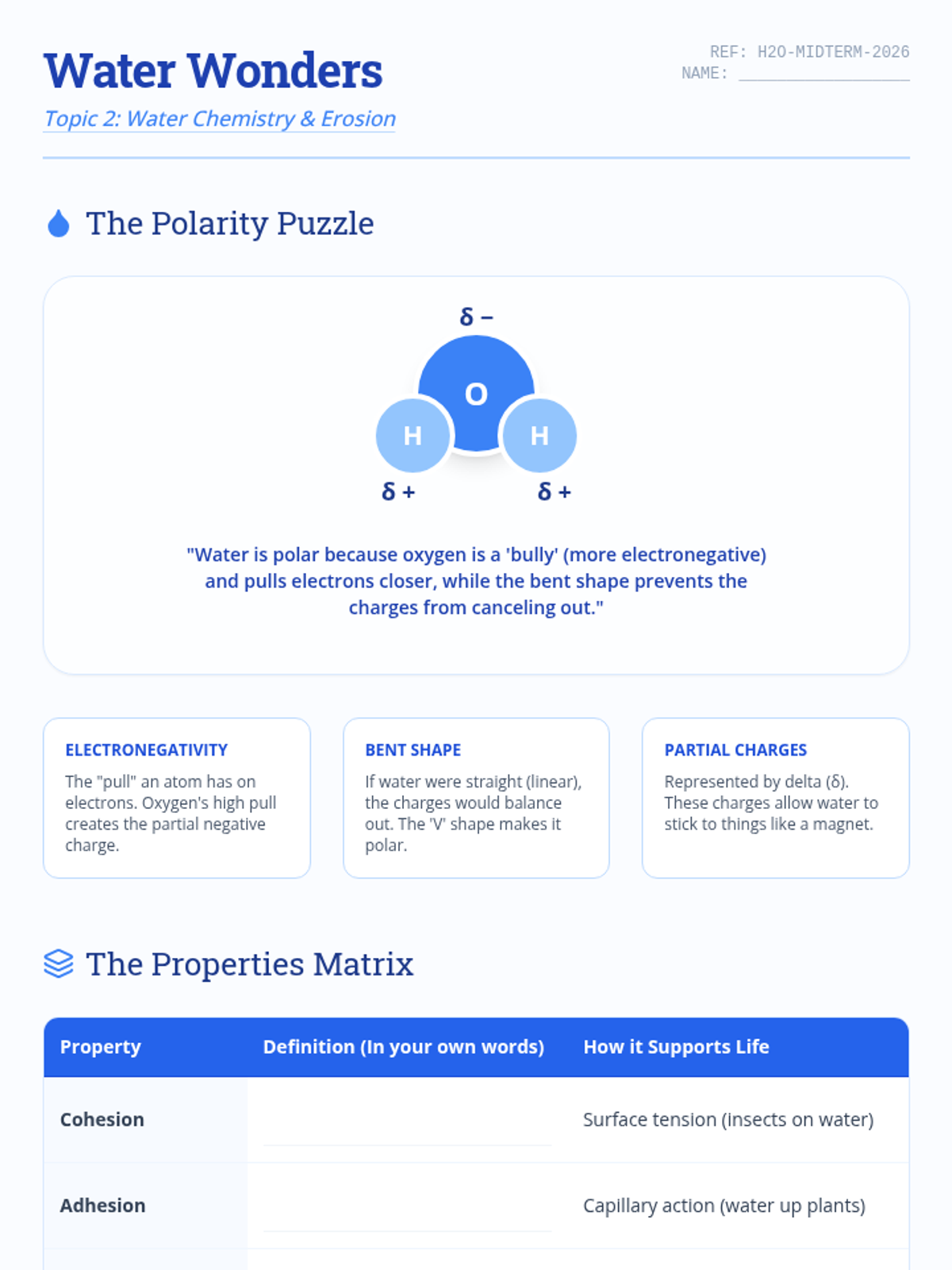A comprehensive chemistry midterm review covering chemical reactions, water properties, planetary science, and atomic structure based on the Spring 2026 exam.