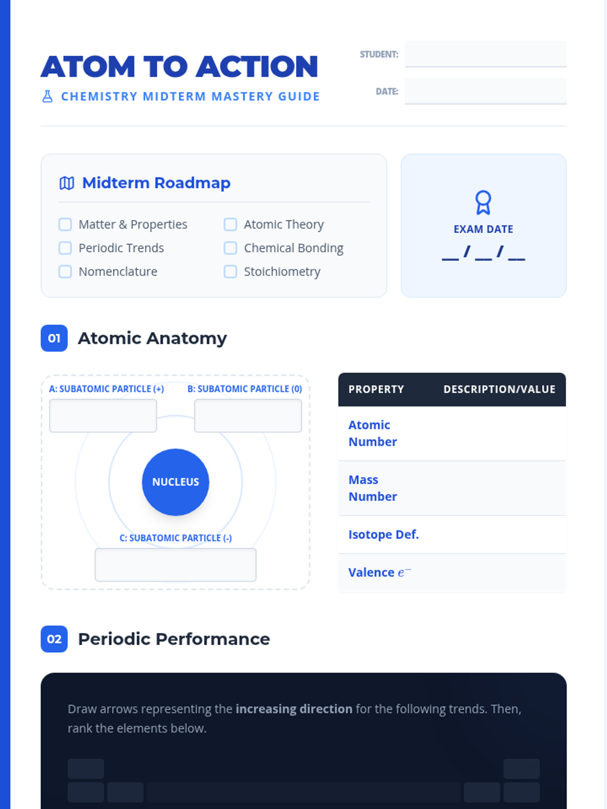 A comprehensive review of introductory chemistry concepts, including atomic structure, periodic trends, bonding, and stoichiometry, designed to prepare students for a midterm examination.