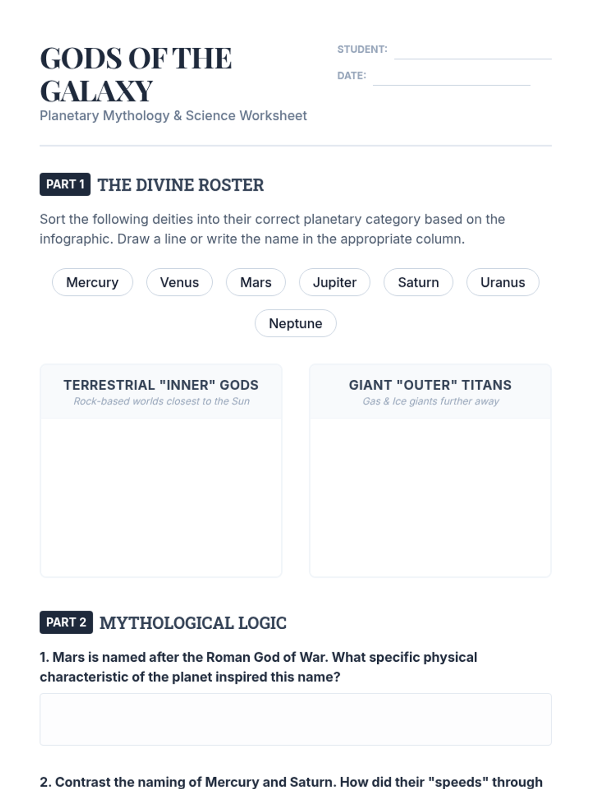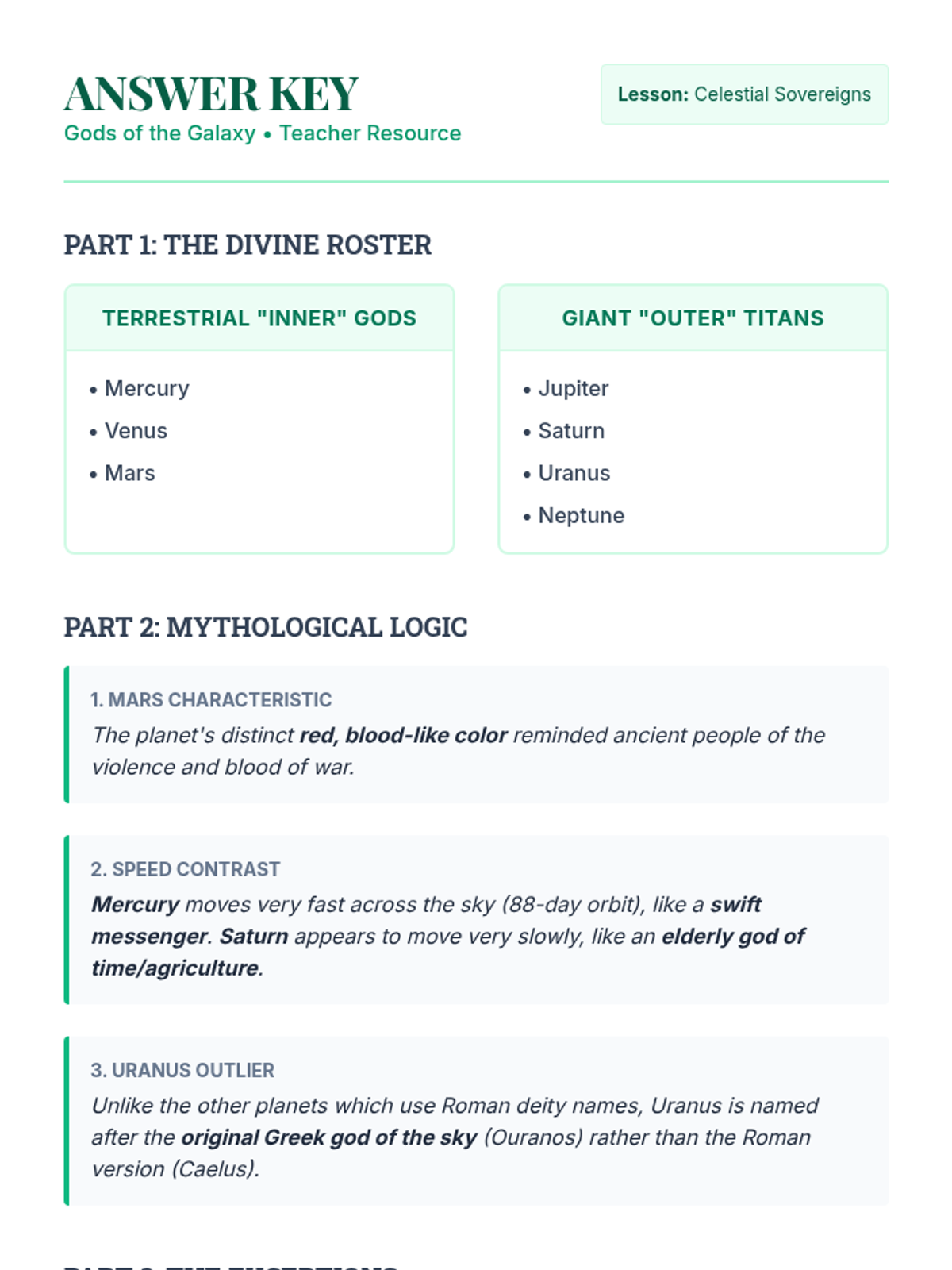 A lesson exploring the connections between the planets of our solar system and the Greek and Roman deities they are named after, focusing on the physical characteristics that inspired their names.