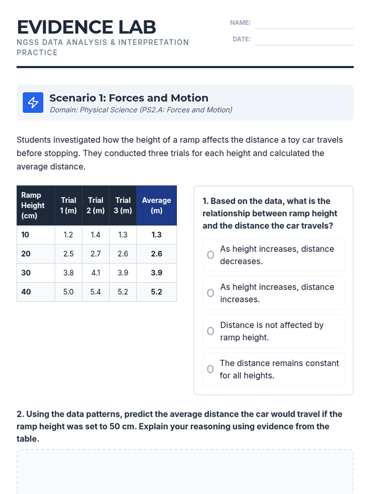 A comprehensive practice session focused on the Next Generation Science Standards (NGSS) Science and Engineering Practice of Analyzing and Interpreting Data across all science domains. Students will evaluate graphs, tables, and patterns to draw evidence-based conclusions.
