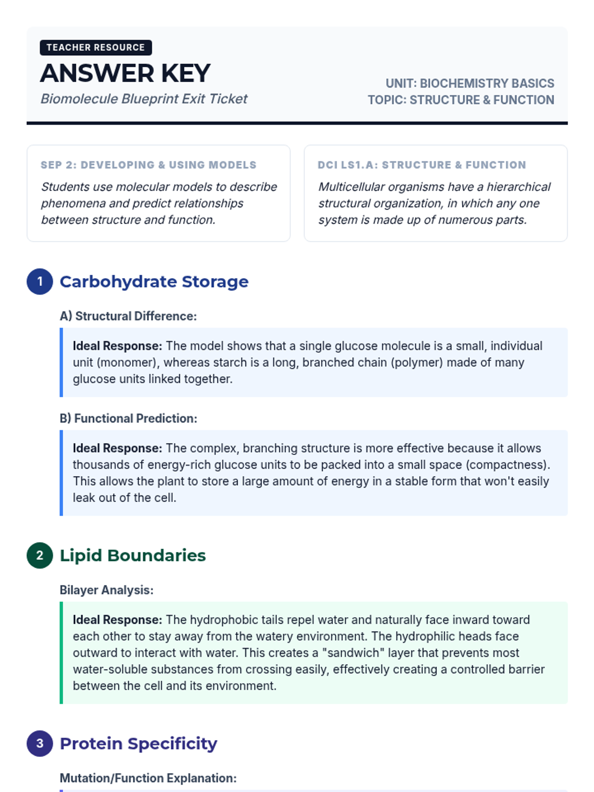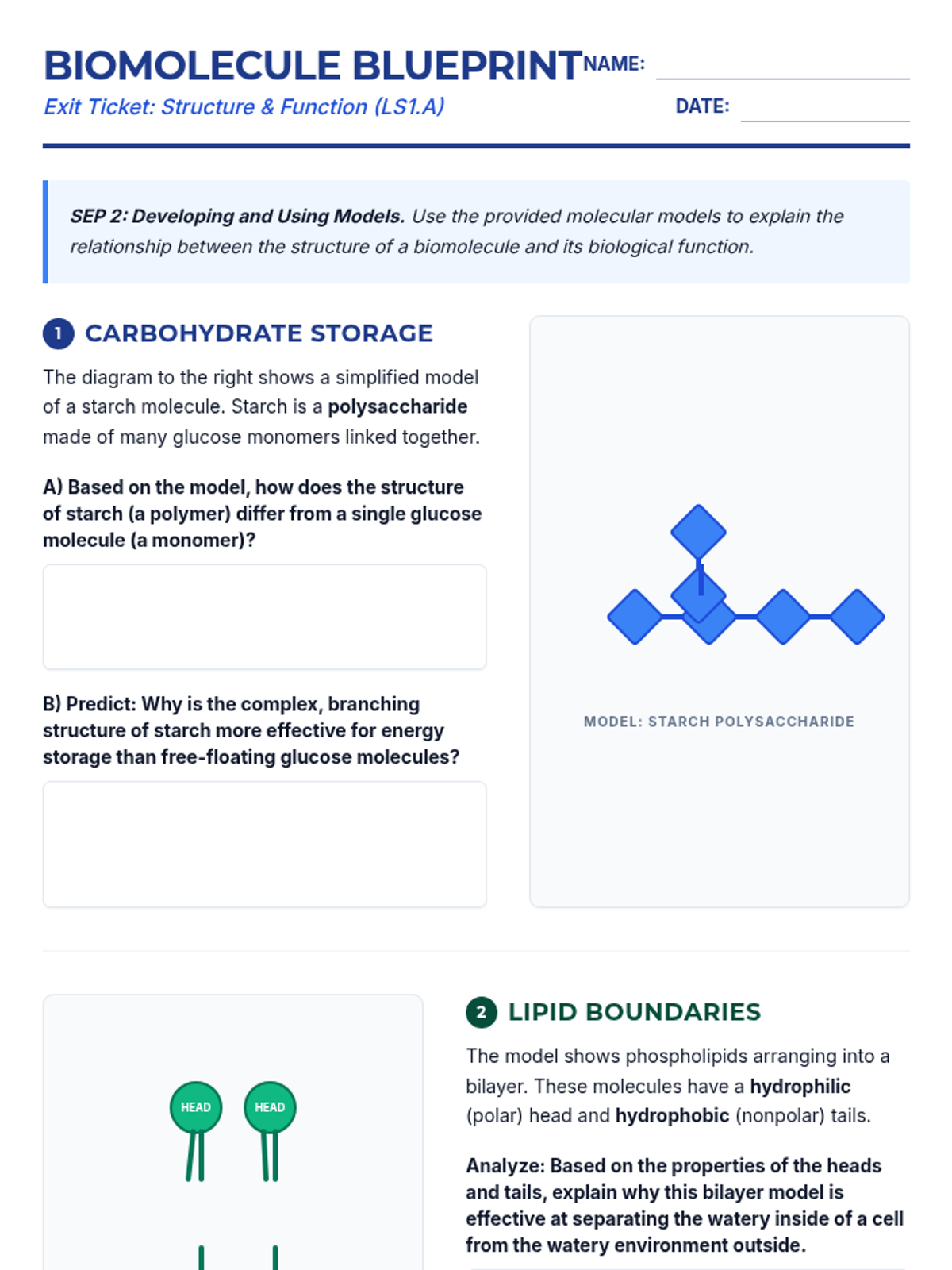 A biology lesson focused on the relationship between the molecular structure of carbohydrates, lipids, and proteins and their biological functions, utilizing modeling to explain cellular processes.