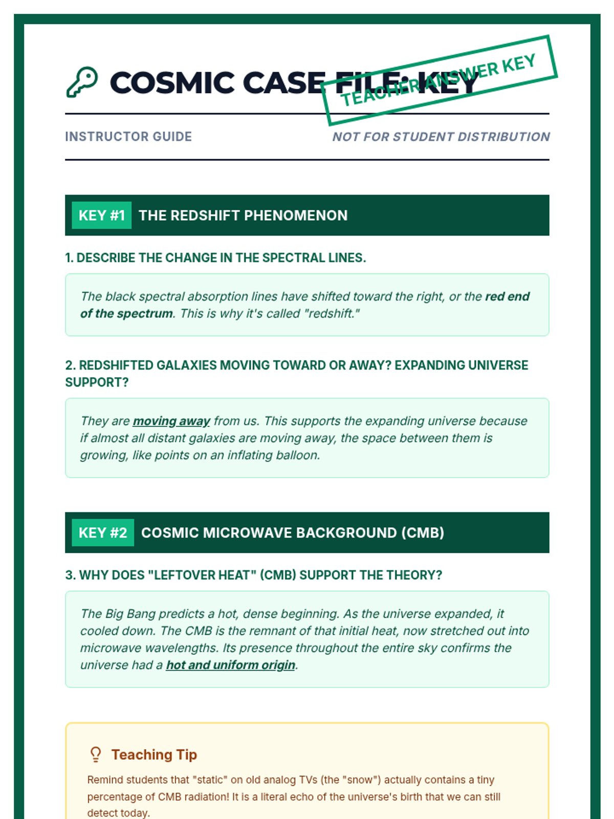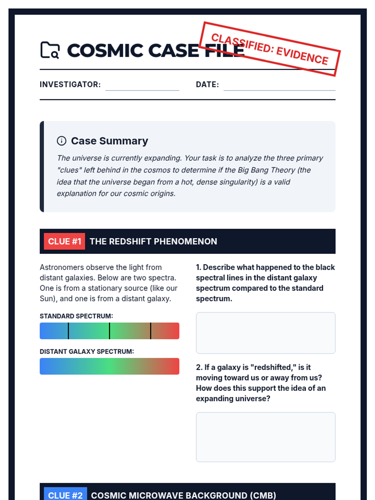 A lesson exploring the three pillars of evidence for the Big Bang Theory: Redshift, Cosmic Microwave Background radiation, and the abundance of light elements. Students act as cosmic detectives to piece together the history of our universe.