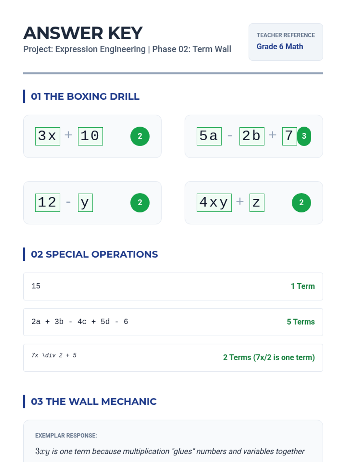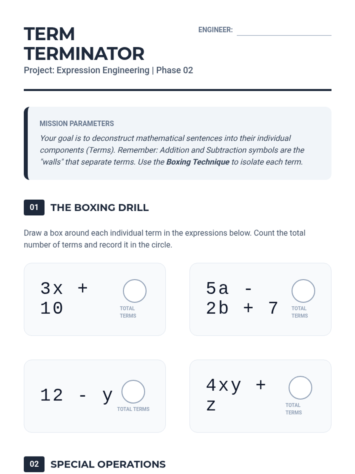 This lesson focuses on separating expressions into 'terms' separated by addition or subtraction. Students practice visually isolating terms within longer expressions.
