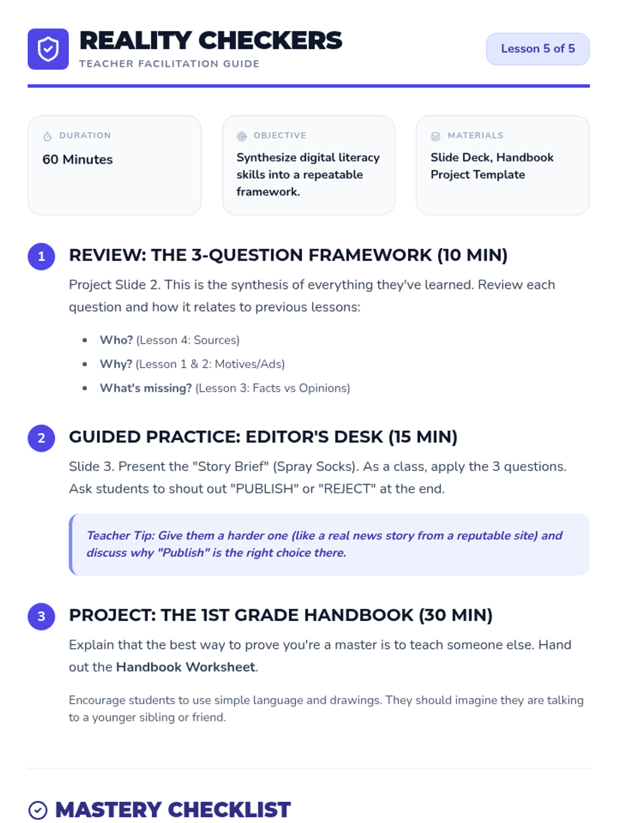 Learners apply the Who, What, Where, When, and Why framework to evaluate digital sources. The lesson introduces a simplified credibility checklist that students use to audit pre-selected websites, including 'hoax' sites.