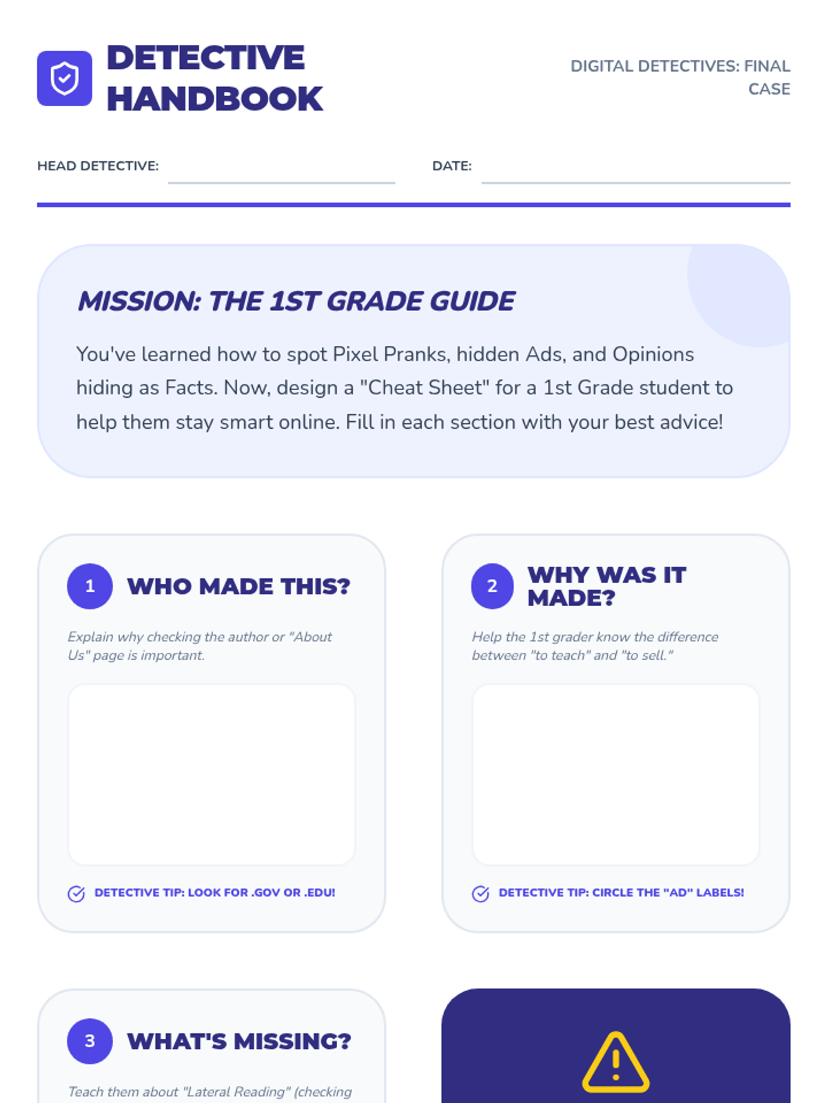 Students synthesize their learning into a three-question framework for evaluating any media. They apply this framework to various examples and create a guide for younger peers.