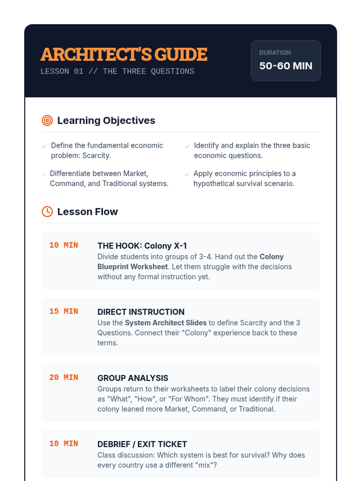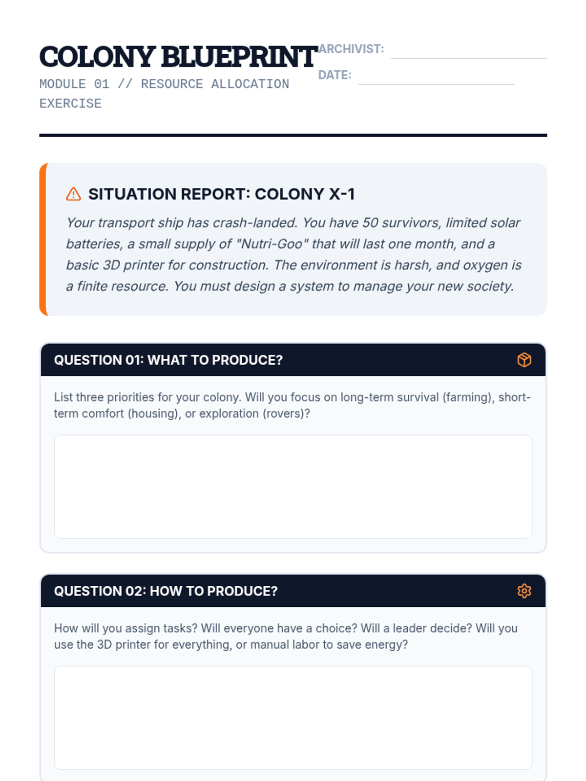 Students define the three fundamental economic questions (What, How, For Whom) and use them to categorize different economic philosophies through a space colony design simulation.