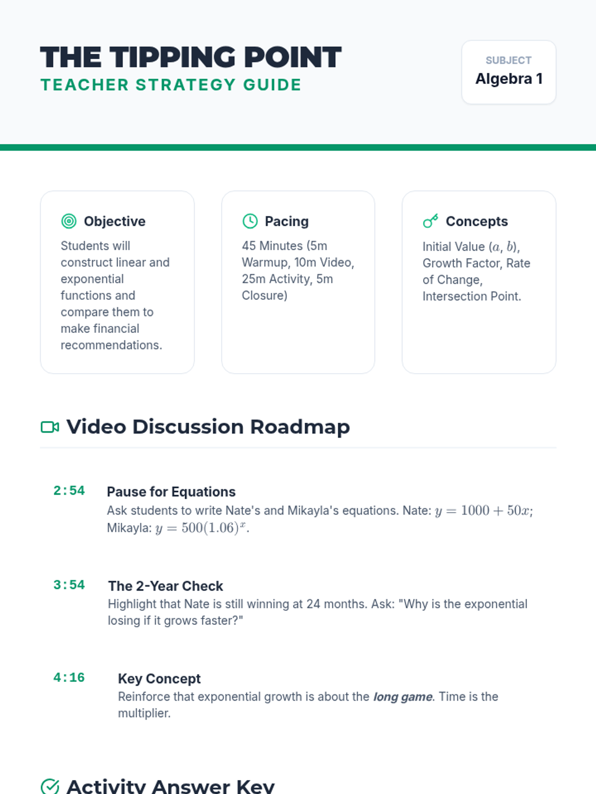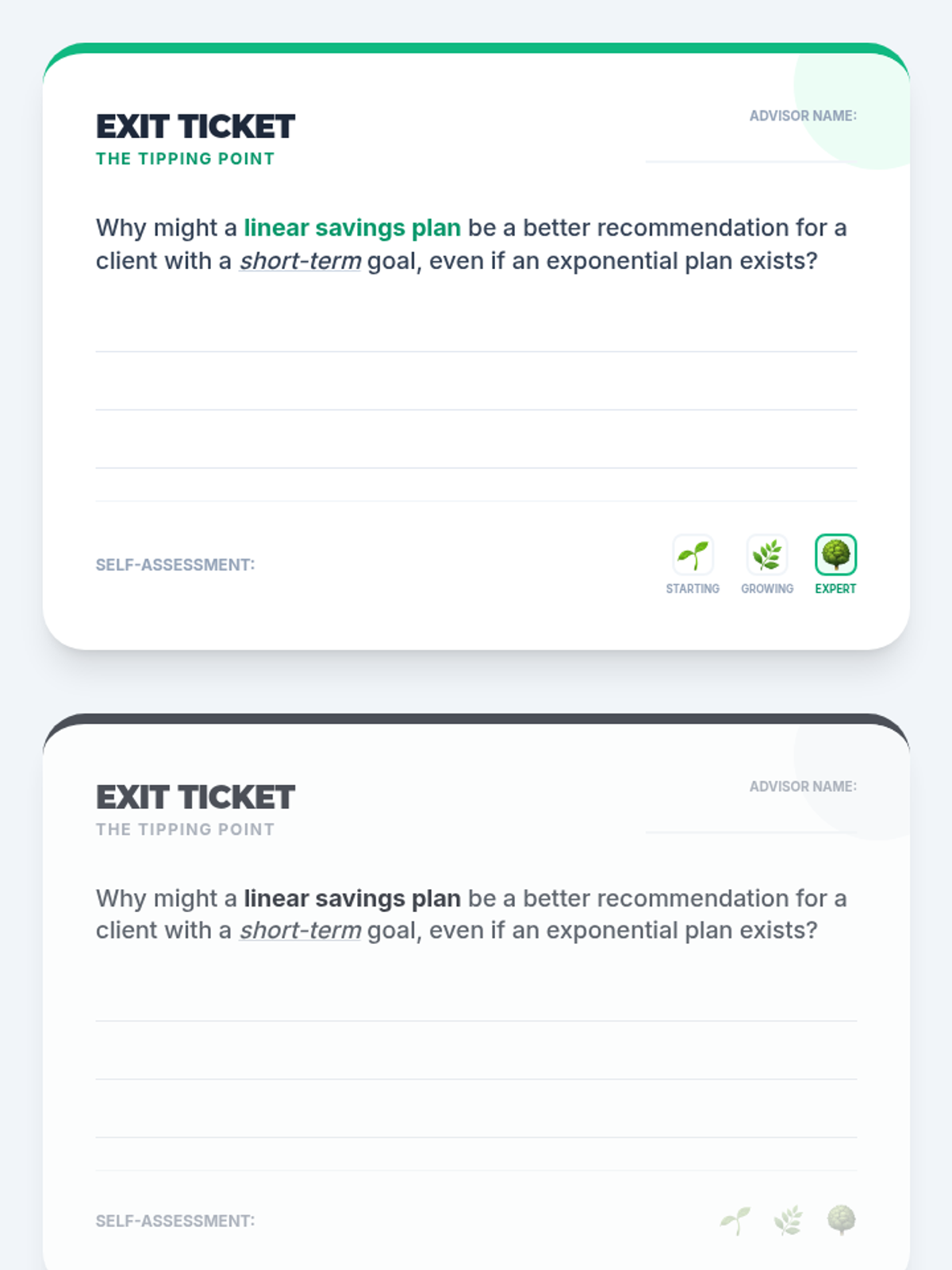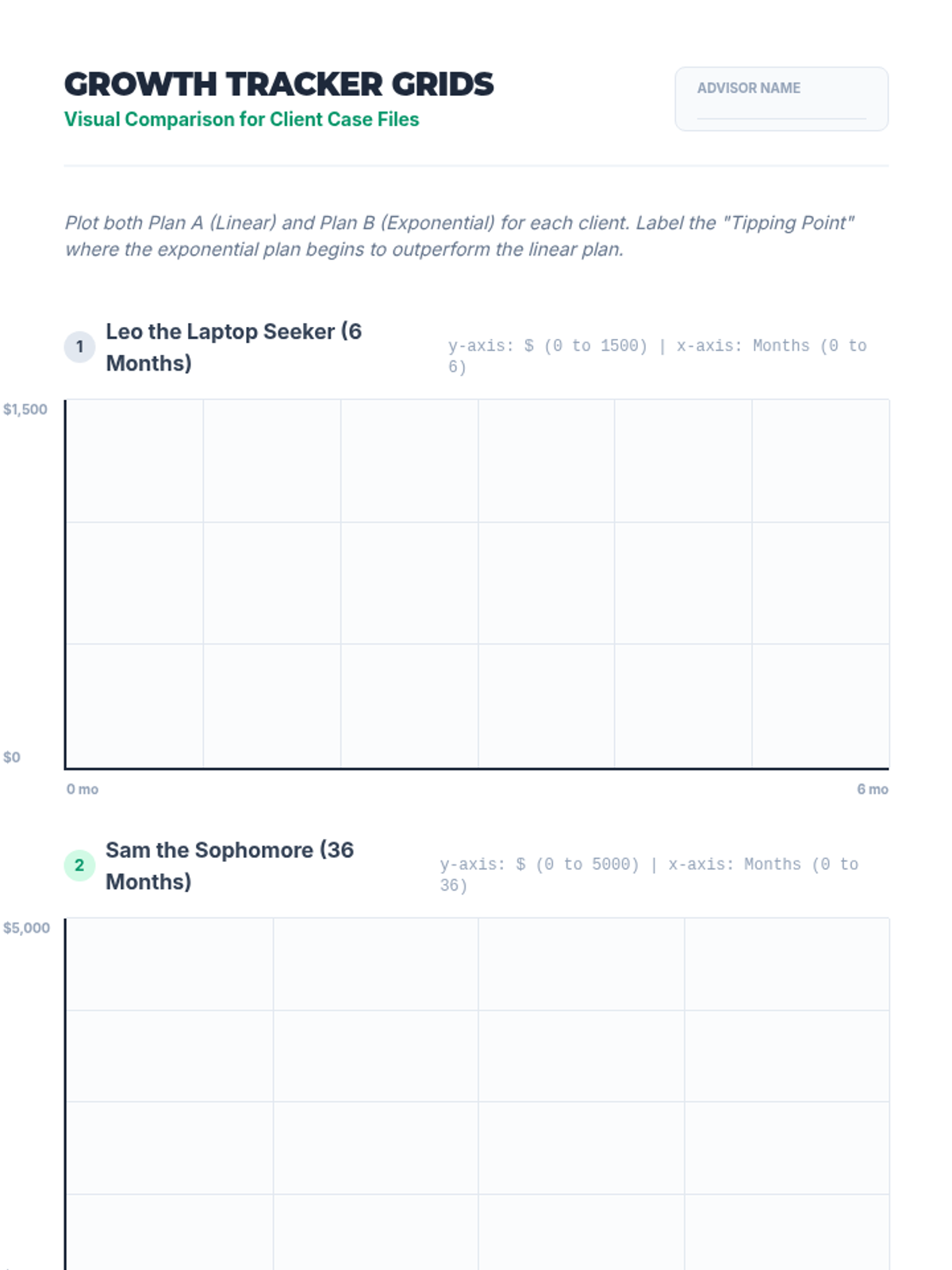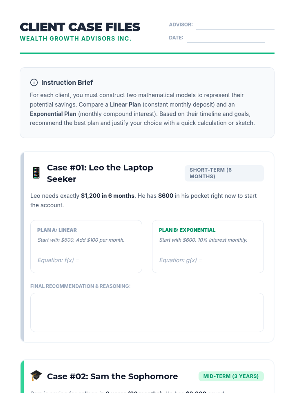 A lesson where students act as financial advisors to help clients choose between linear and exponential savings plans based on their specific goals and timelines.