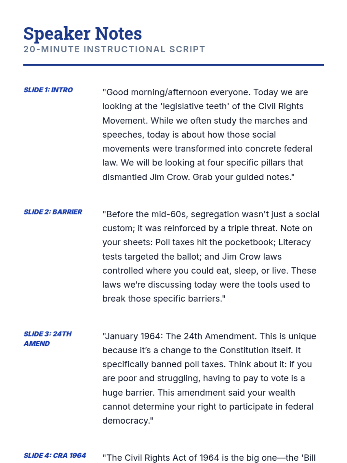 A comprehensive 35-minute lesson on the Watergate scandal, covering the break-in, media role, Supreme Court case, and historical legacy. Includes slides, guided notes, primary source activities, and a detailed study guide.