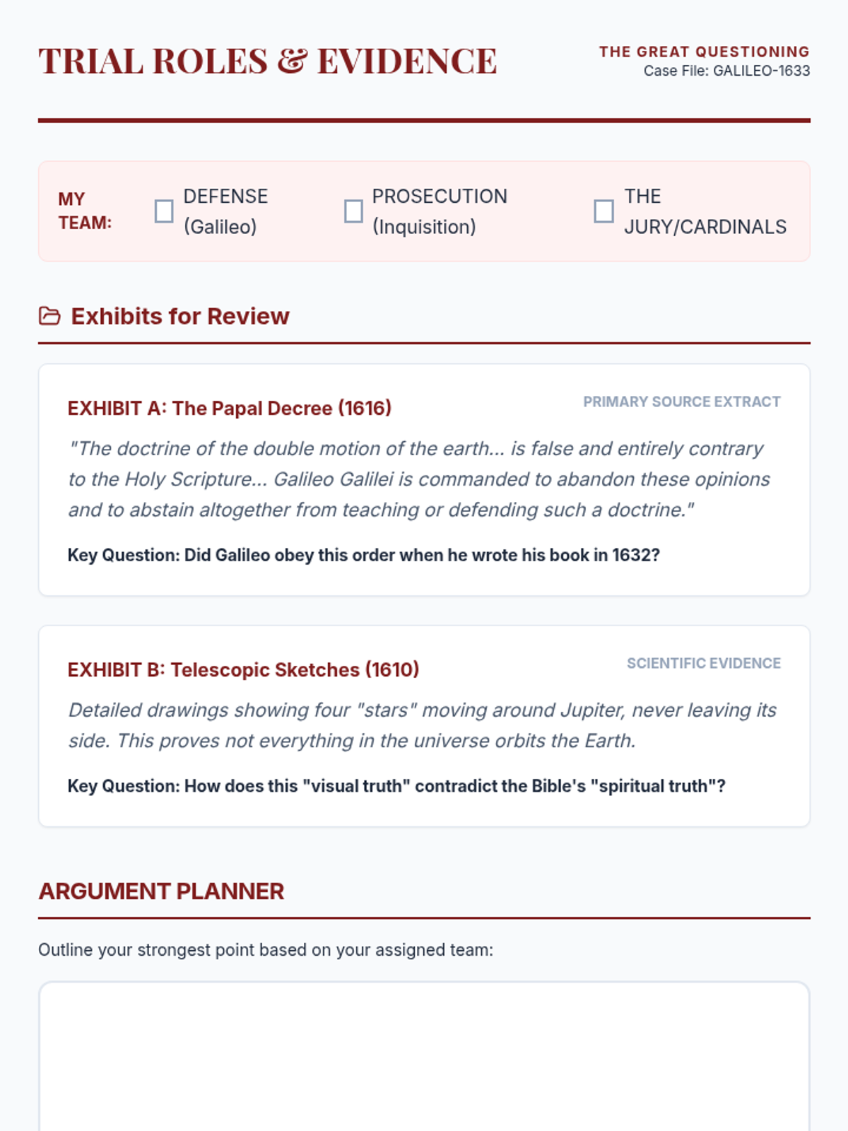 The class enacts a mock trial or structured debate focusing on the conflict between Galileo and the Church. Students analyze primary source documents regarding the trial to understand the tension between tradition and innovation.