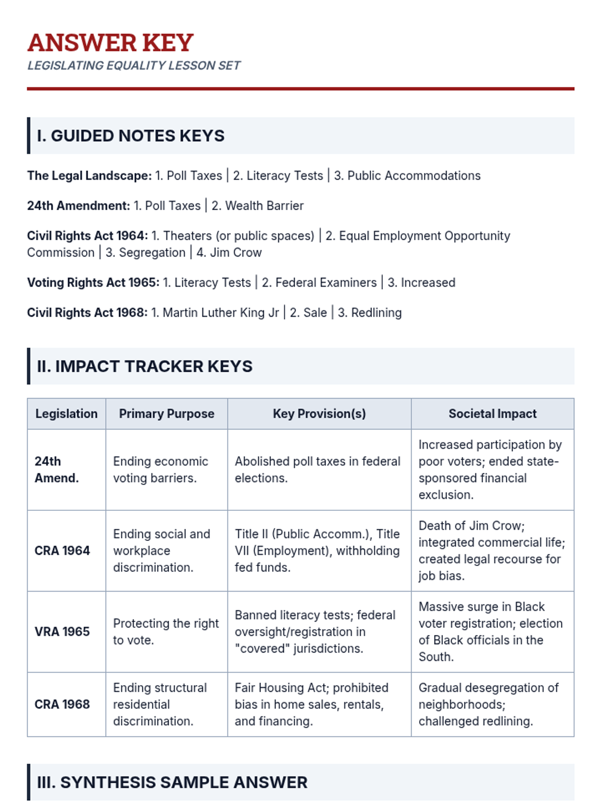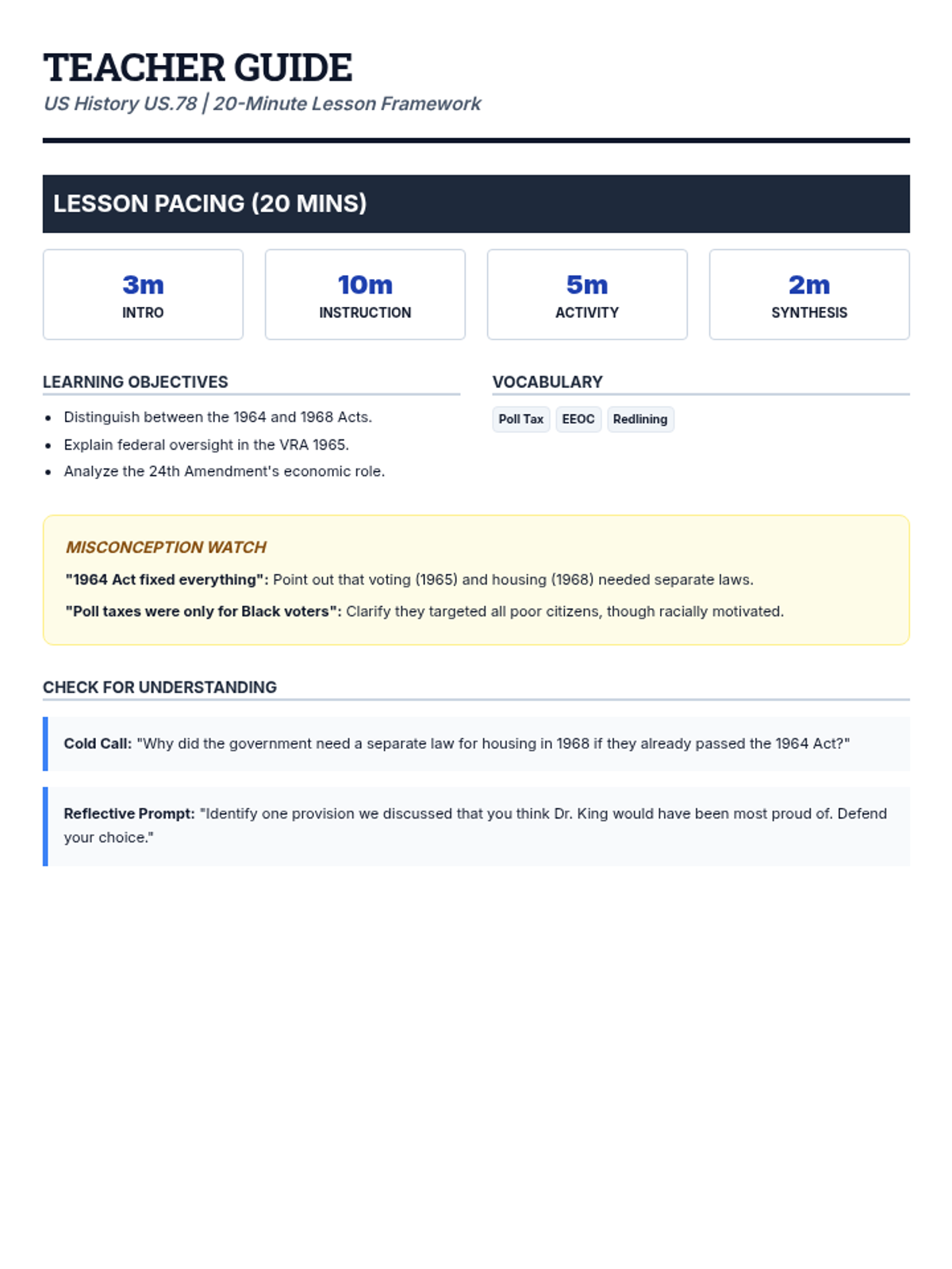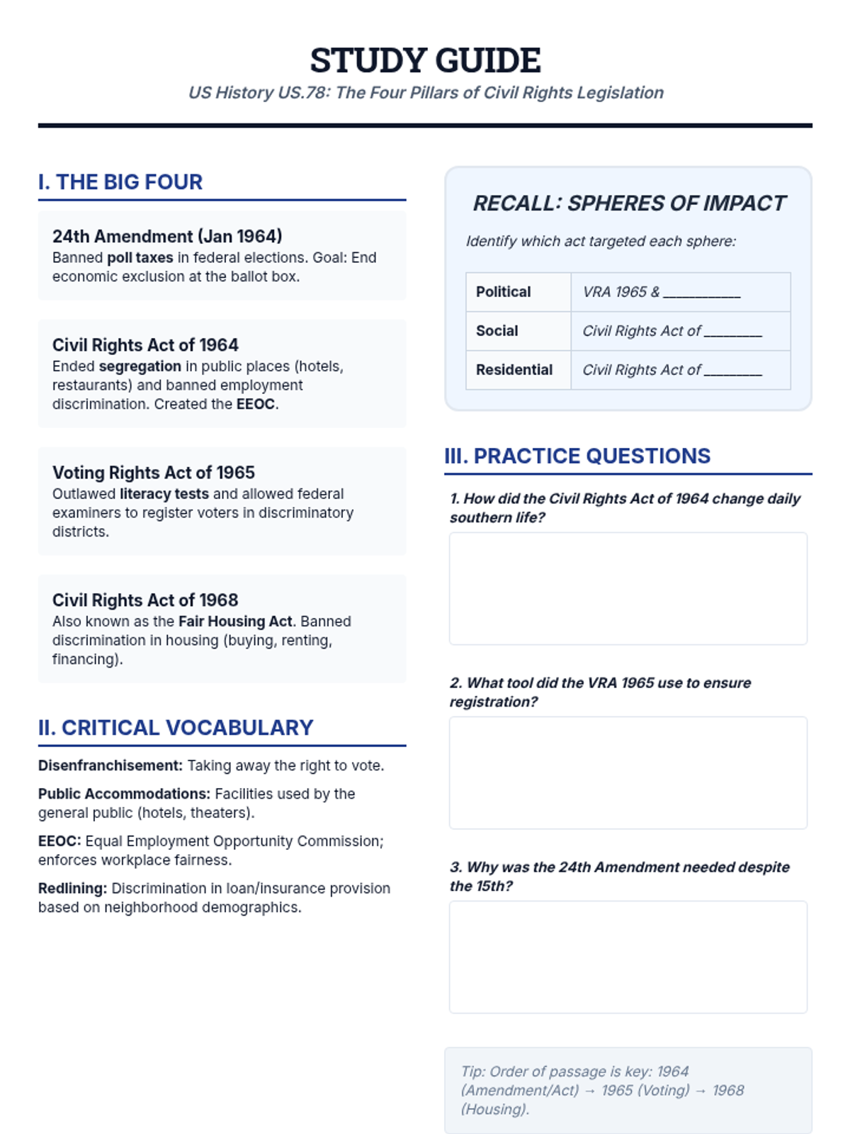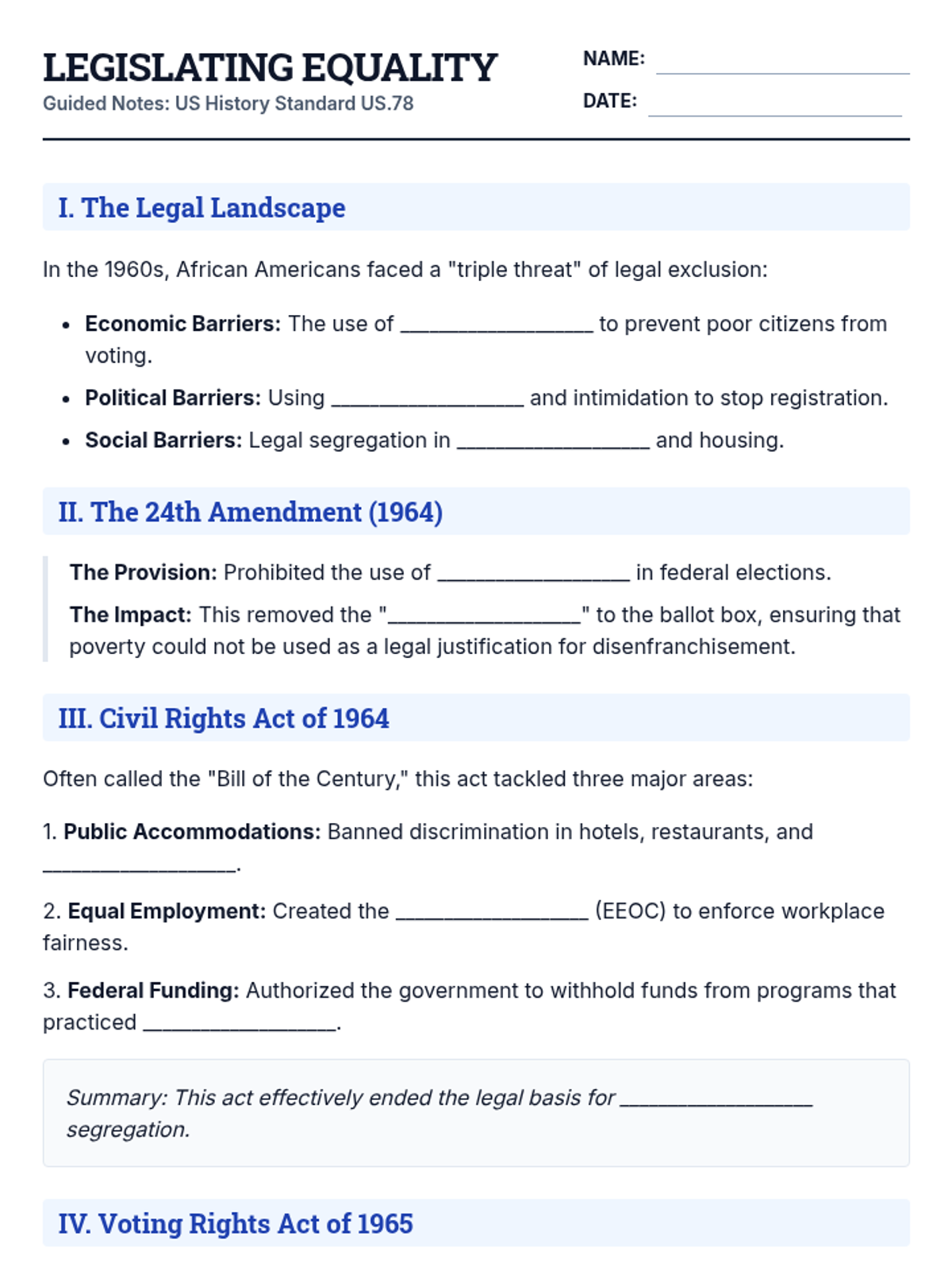 A concise 20-minute analysis of key civil rights legislation including the 24th Amendment and the Acts of 1964, 1965, and 1968. Students explore the specific legal impacts and societal changes brought about by these landmark federal actions.
