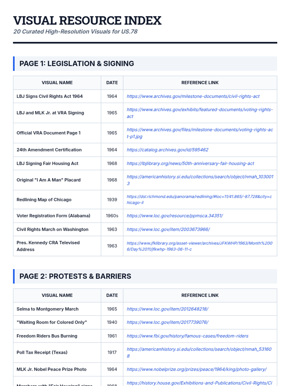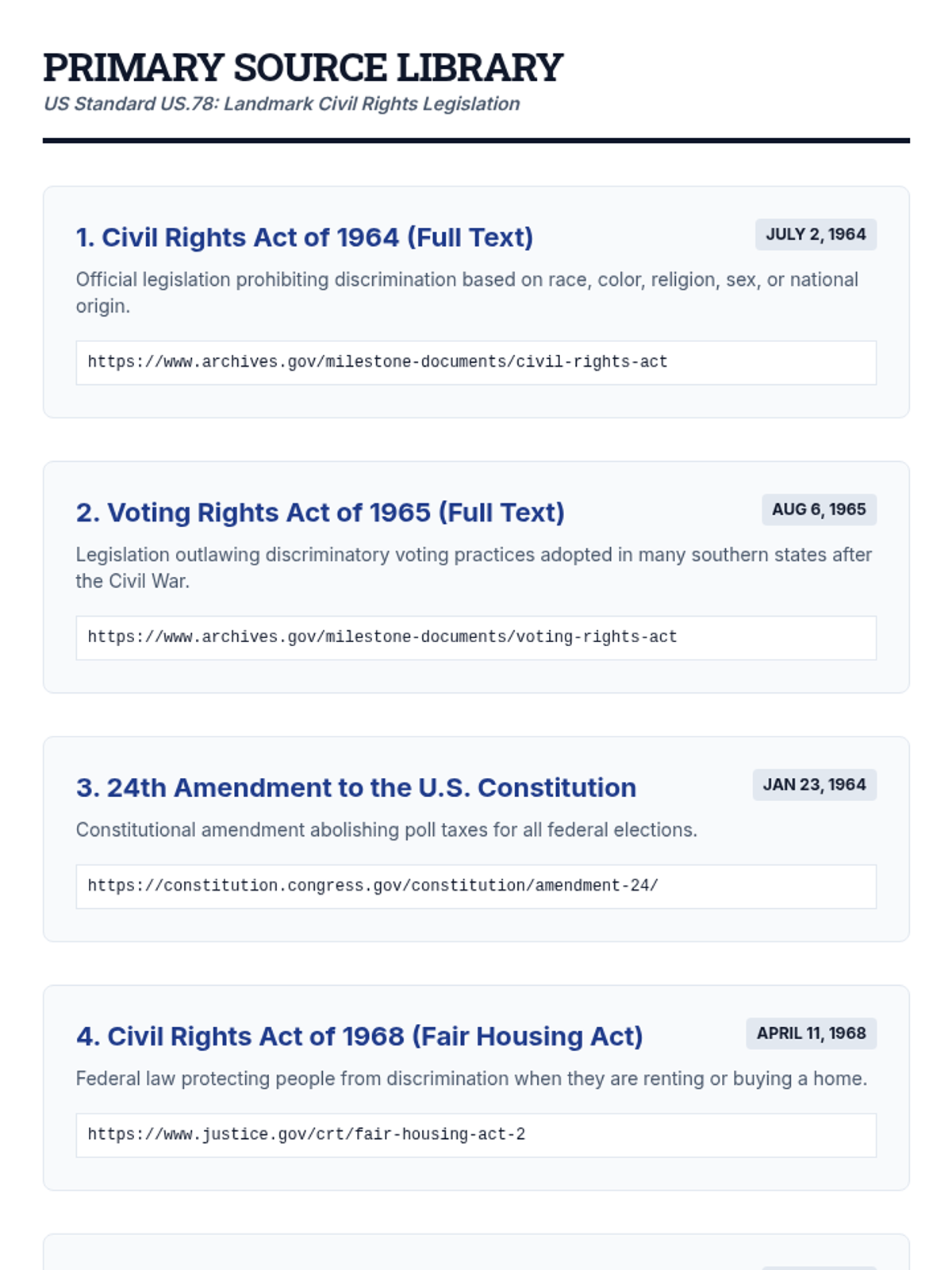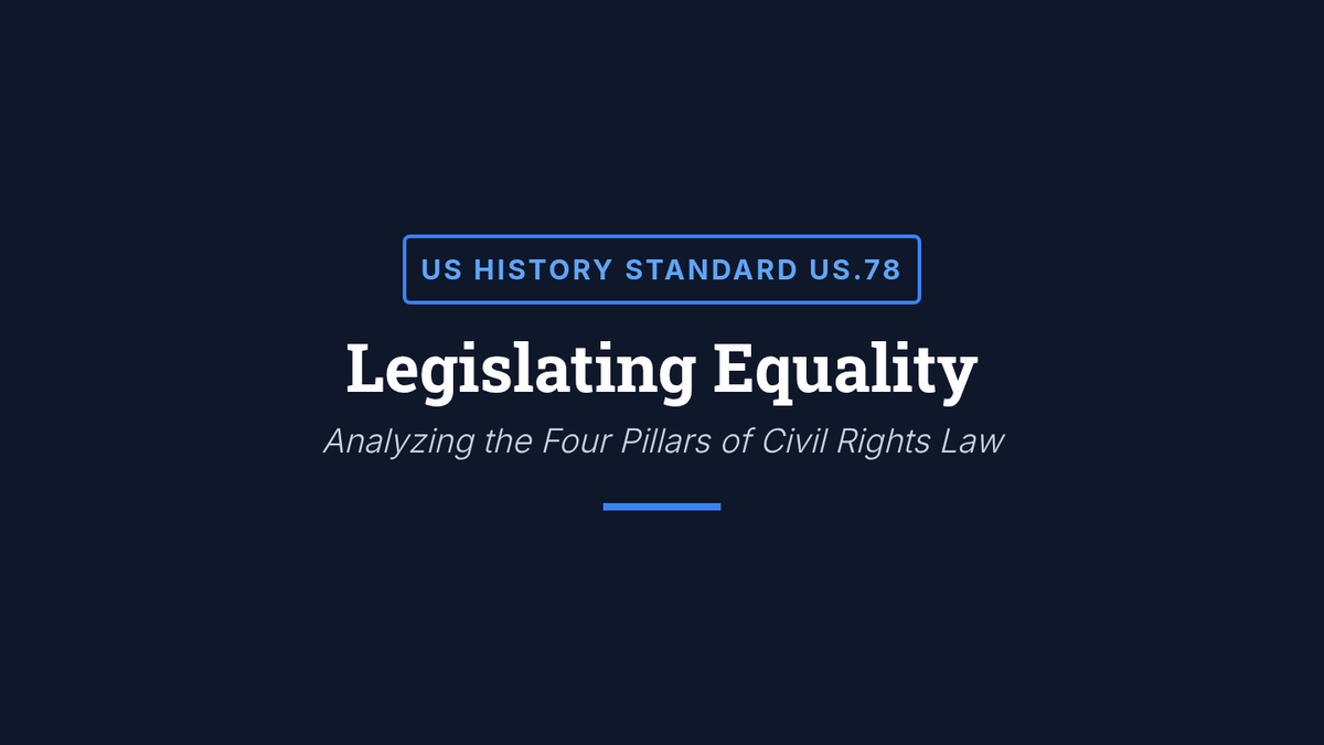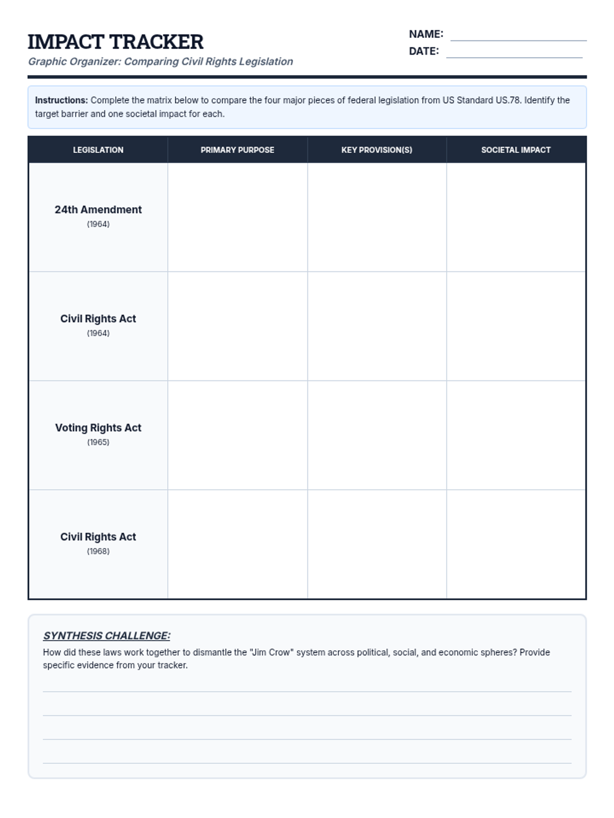 A concise 20-minute analysis of key civil rights legislation including the 24th Amendment and the Acts of 1964, 1965, and 1968. Students explore the specific legal impacts and societal changes brought about by these landmark federal actions.