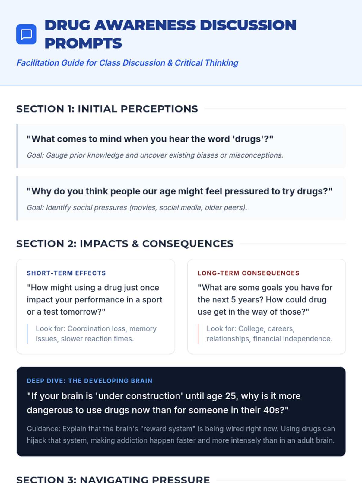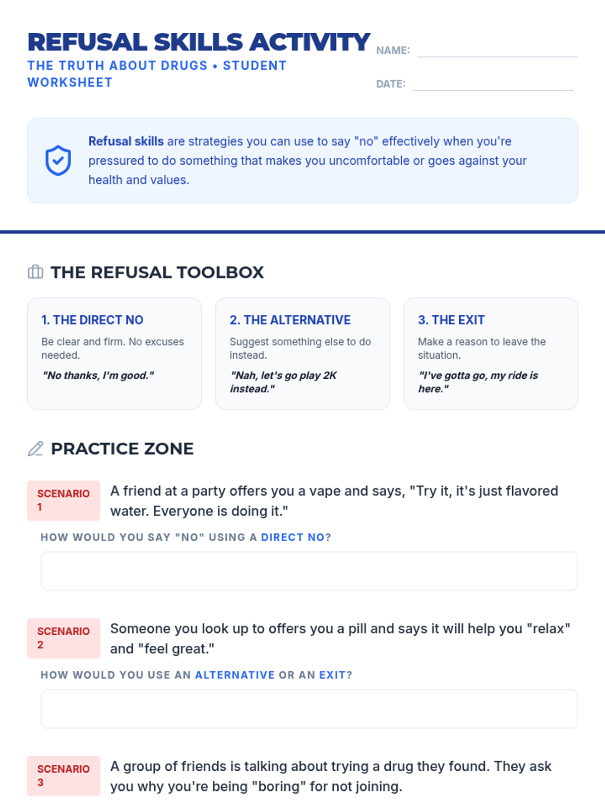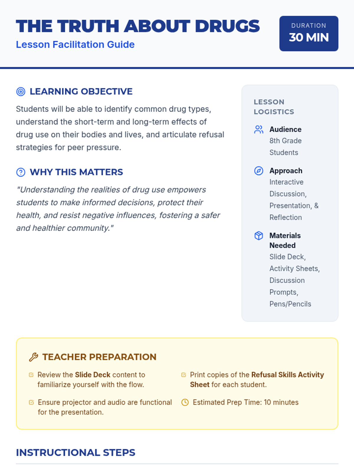 An interactive 30-minute lesson for 8th graders focused on debunking myths about drug use, understanding health impacts, and developing assertive refusal skills.