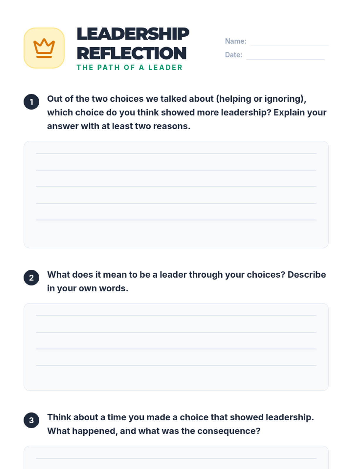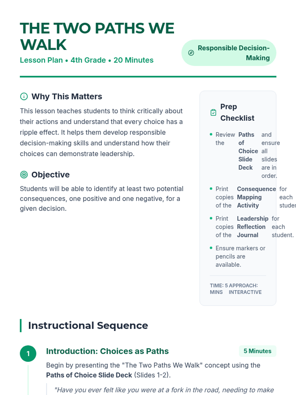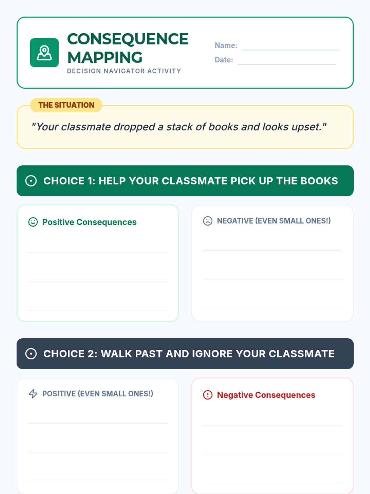 A 20-minute SEL lesson for 4th graders exploring the ripple effects of choices, consequences, and how decisions reflect leadership. Students map out positive and negative outcomes for common scenarios.