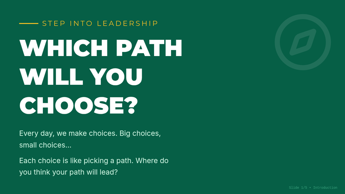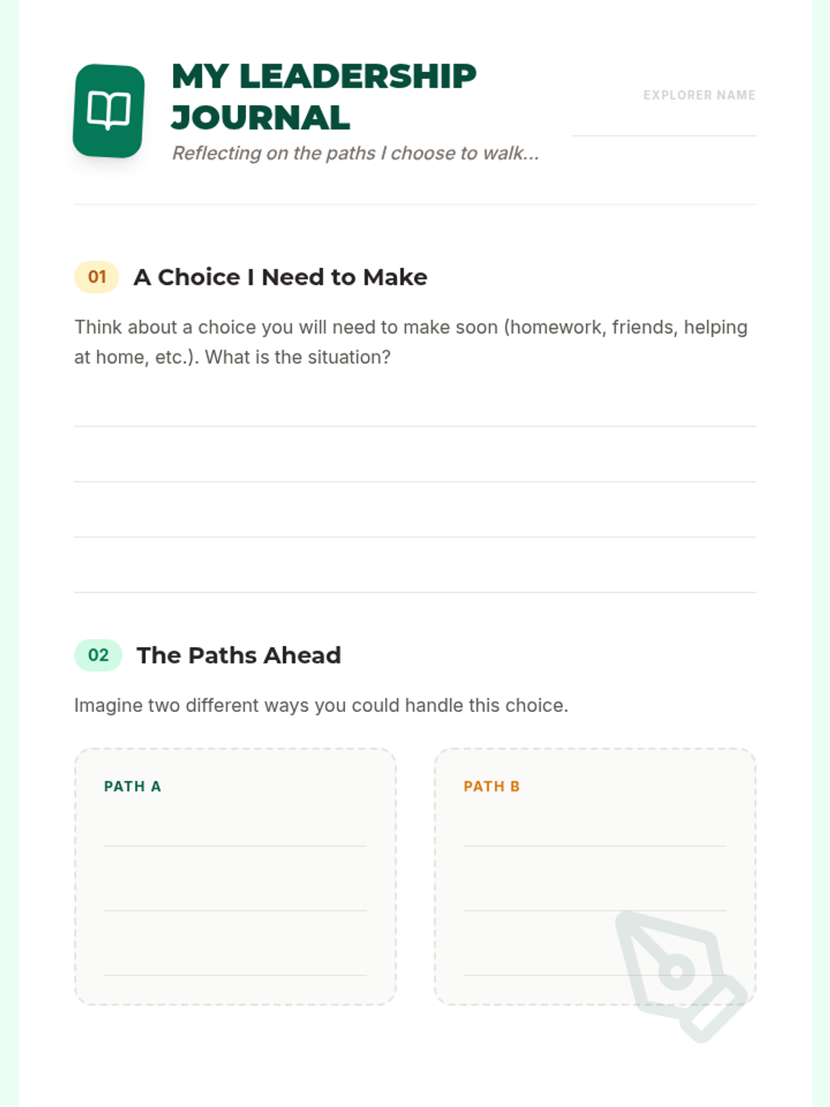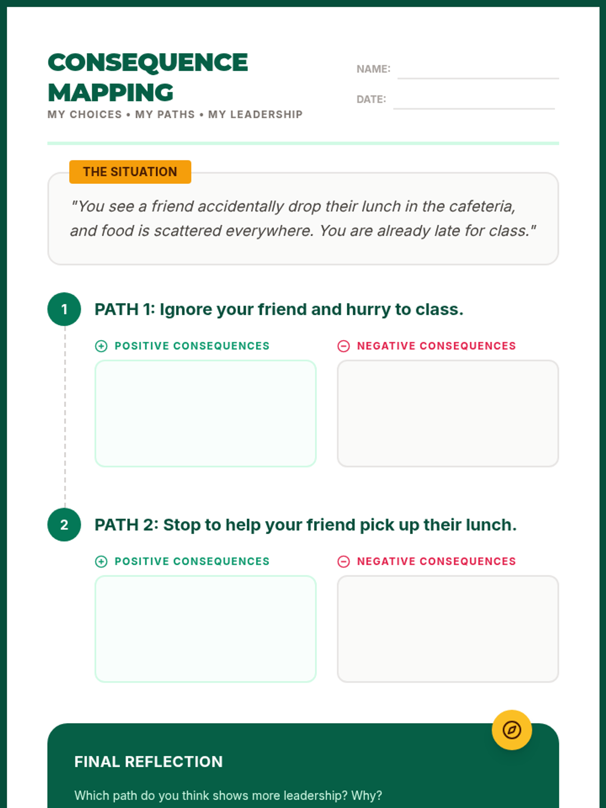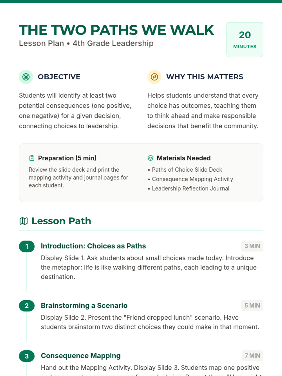 A 20-minute lesson for 4th graders exploring how personal choices lead to positive and negative consequences, encouraging thoughtful leadership through a 'two paths' metaphor.