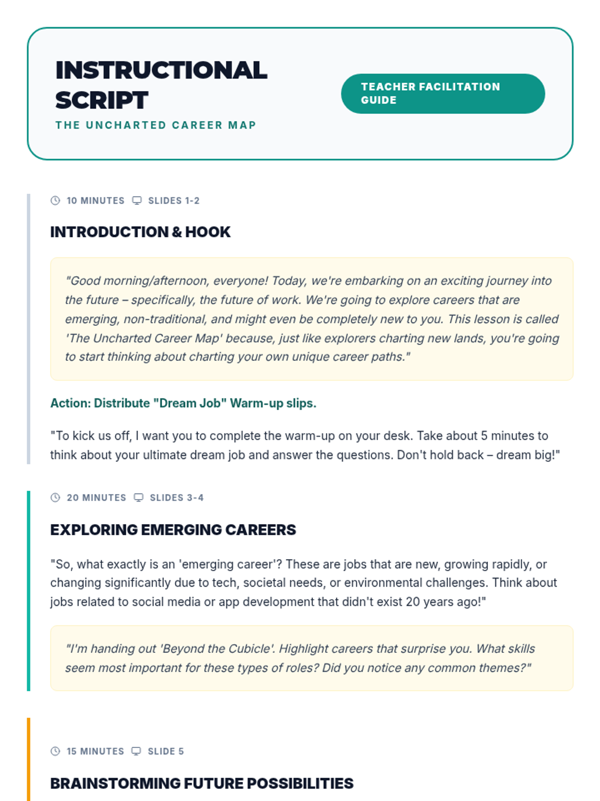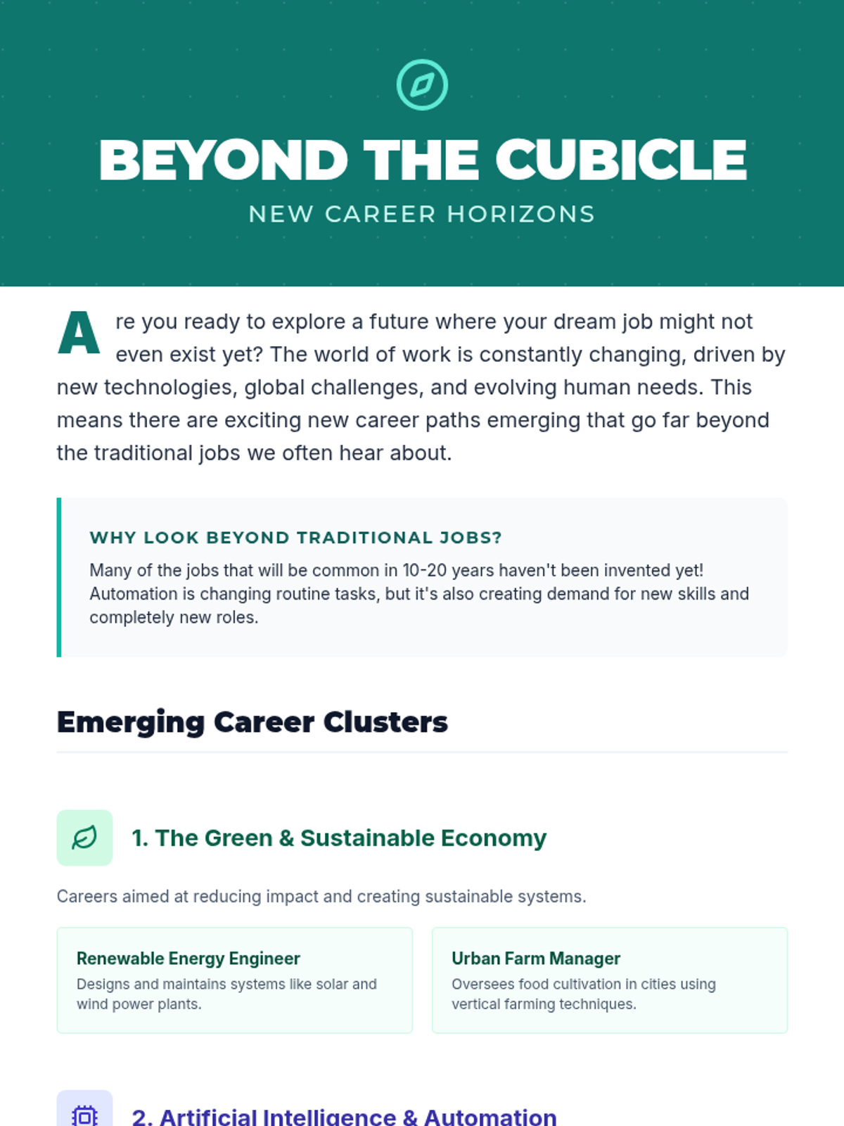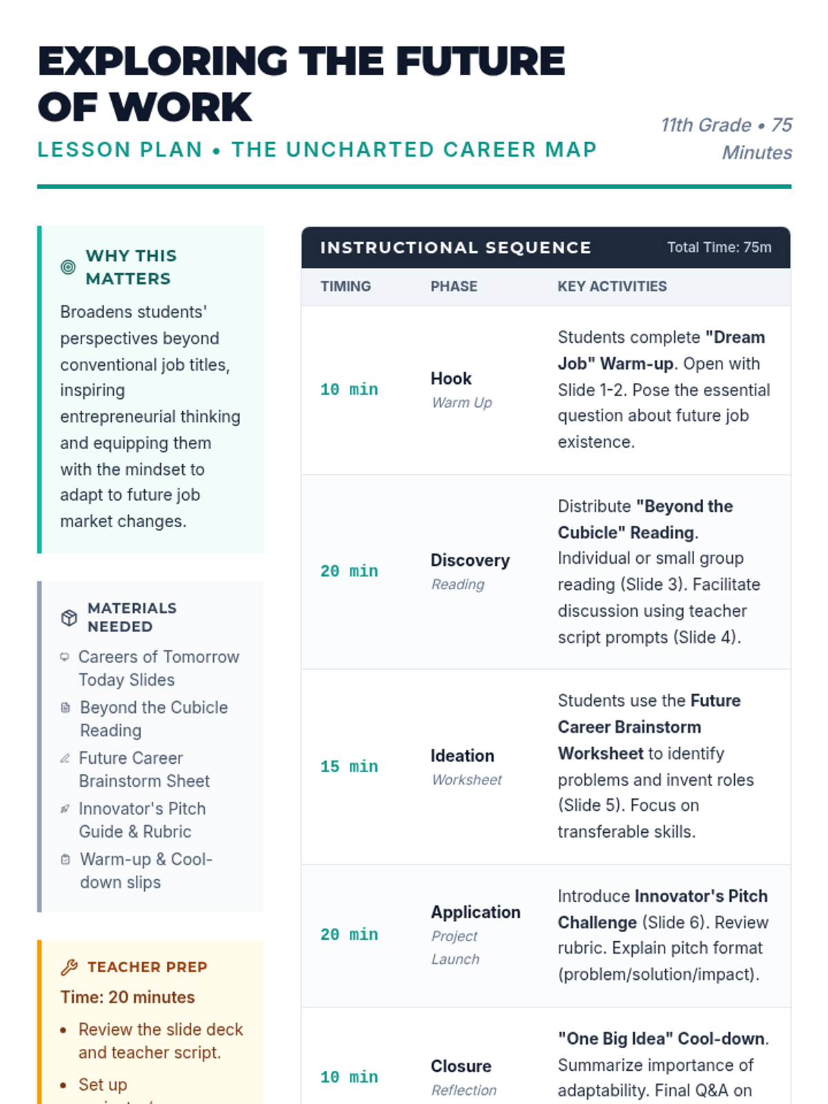 A 75-minute lesson for 11th-grade students to explore emerging and non-traditional career paths, fostering innovation and adaptability in a changing job market.