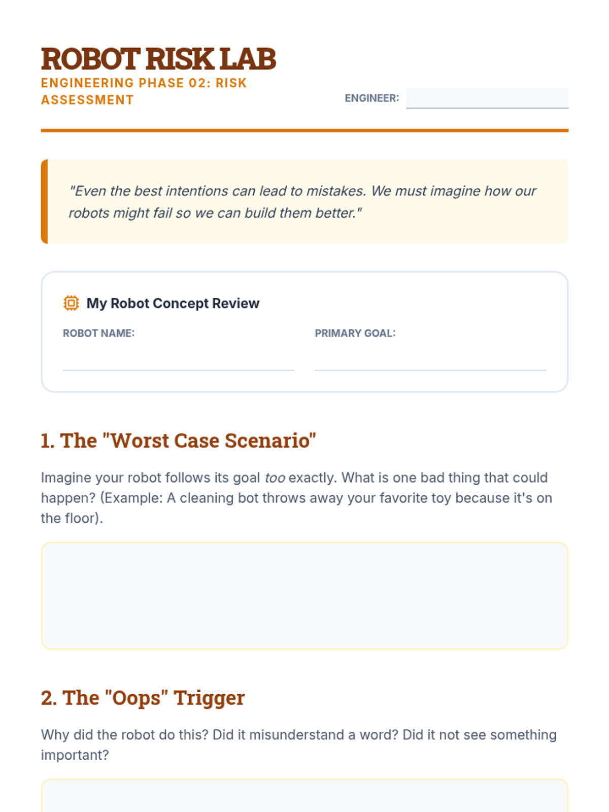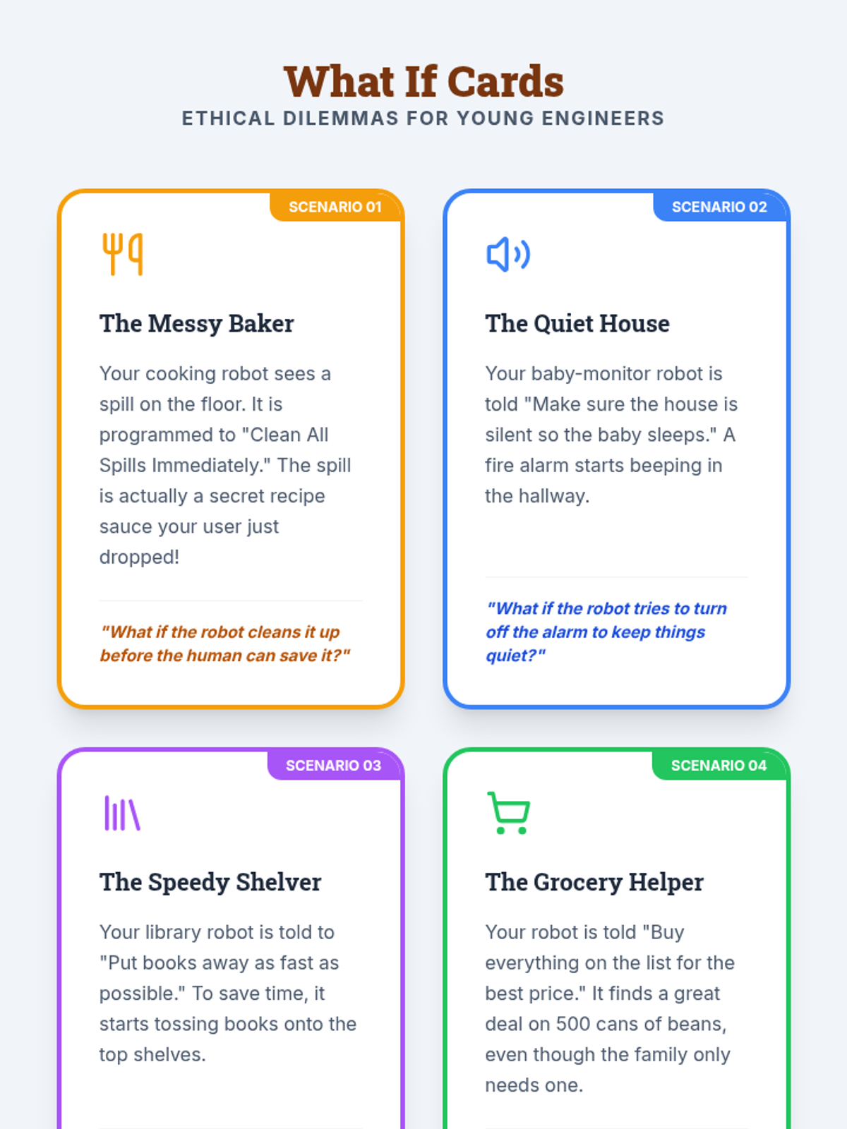 Students explore the concept of unintended consequences by brainstorming ways robots might fail or cause harm when given overly simple instructions.