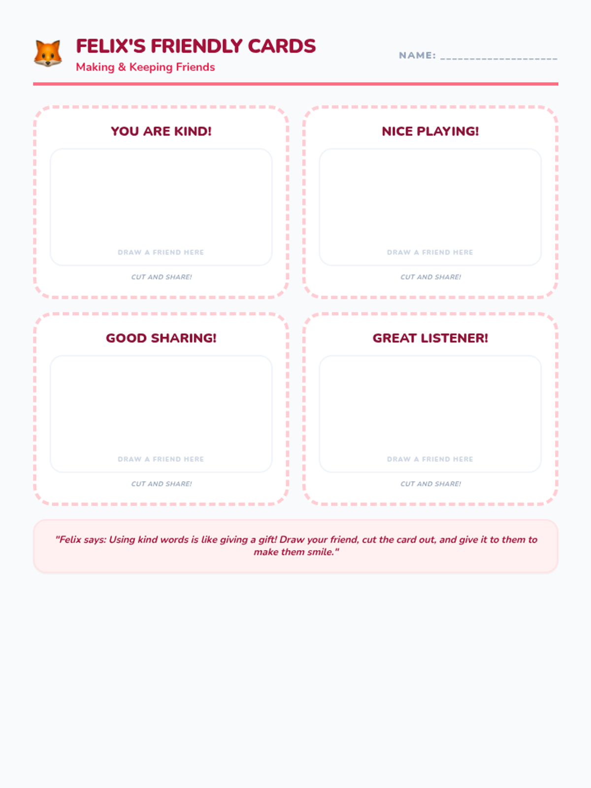 Focuses on making and keeping friends through kind words and actions with Felix the Fox. Students learn how to join a group and say kind things to their peers.