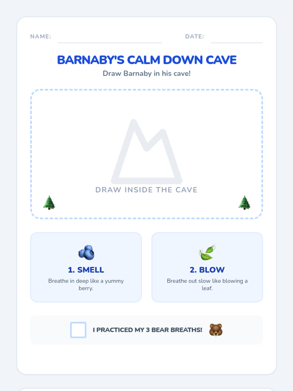 Teaches self-regulation strategies, specifically deep breathing, through the character of Barnaby the Bear. Students learn how to identify "big feelings" and use the "Calm Down Cave" technique.