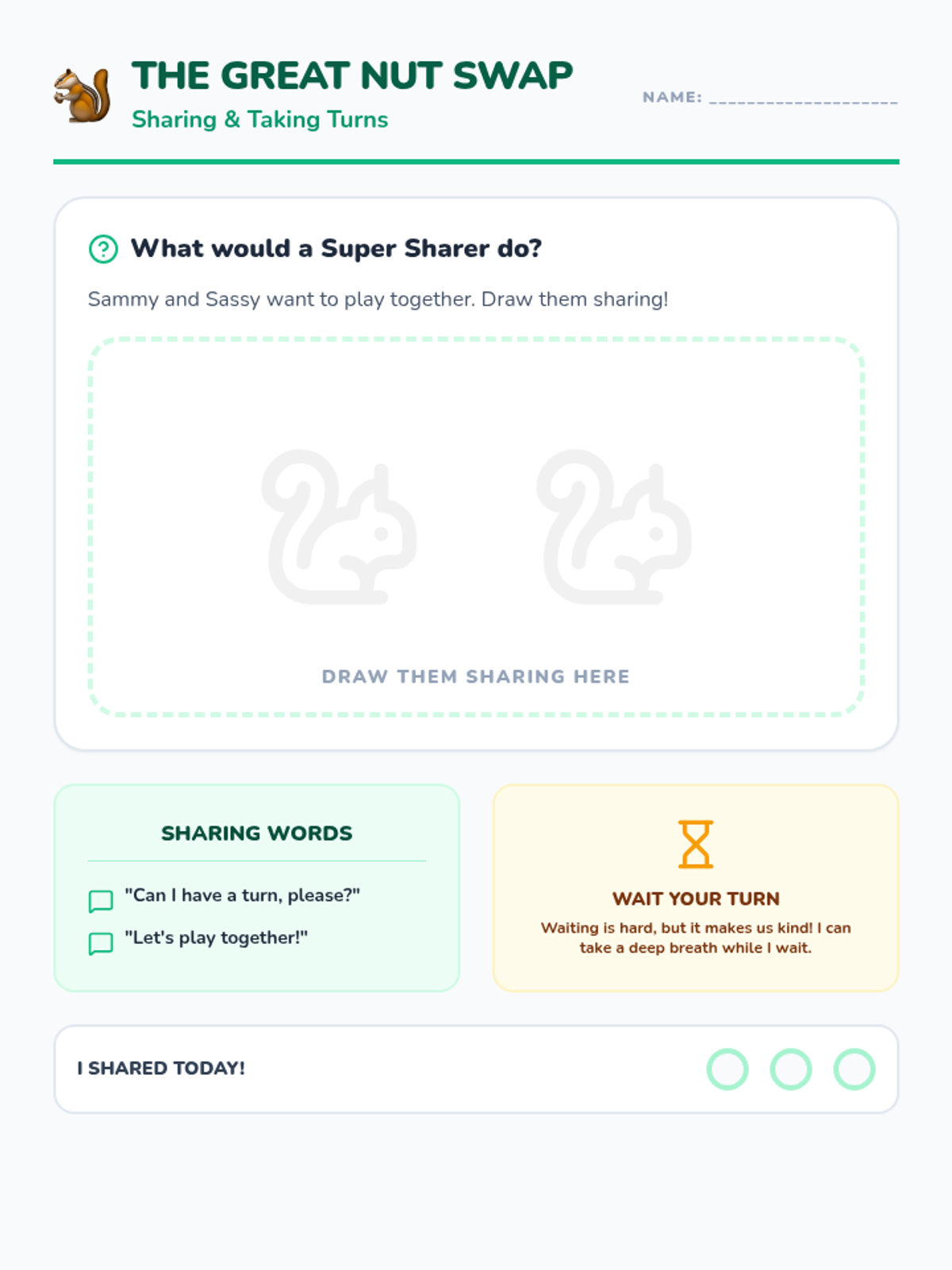 Teaches the concepts of sharing and taking turns using Sammy and Sassy the Squirrels. Students practice using "I want" statements and waiting for a timer or natural break.