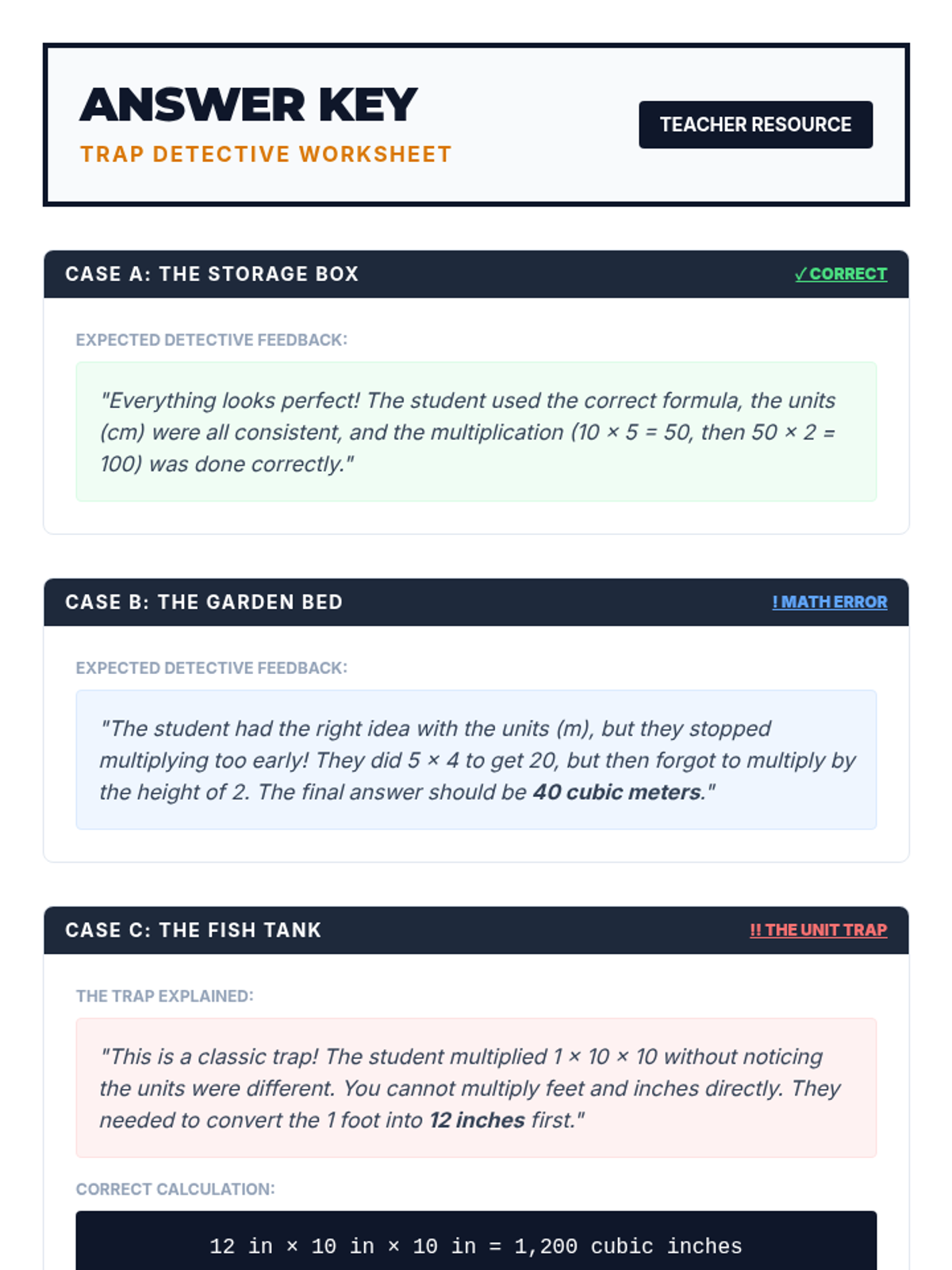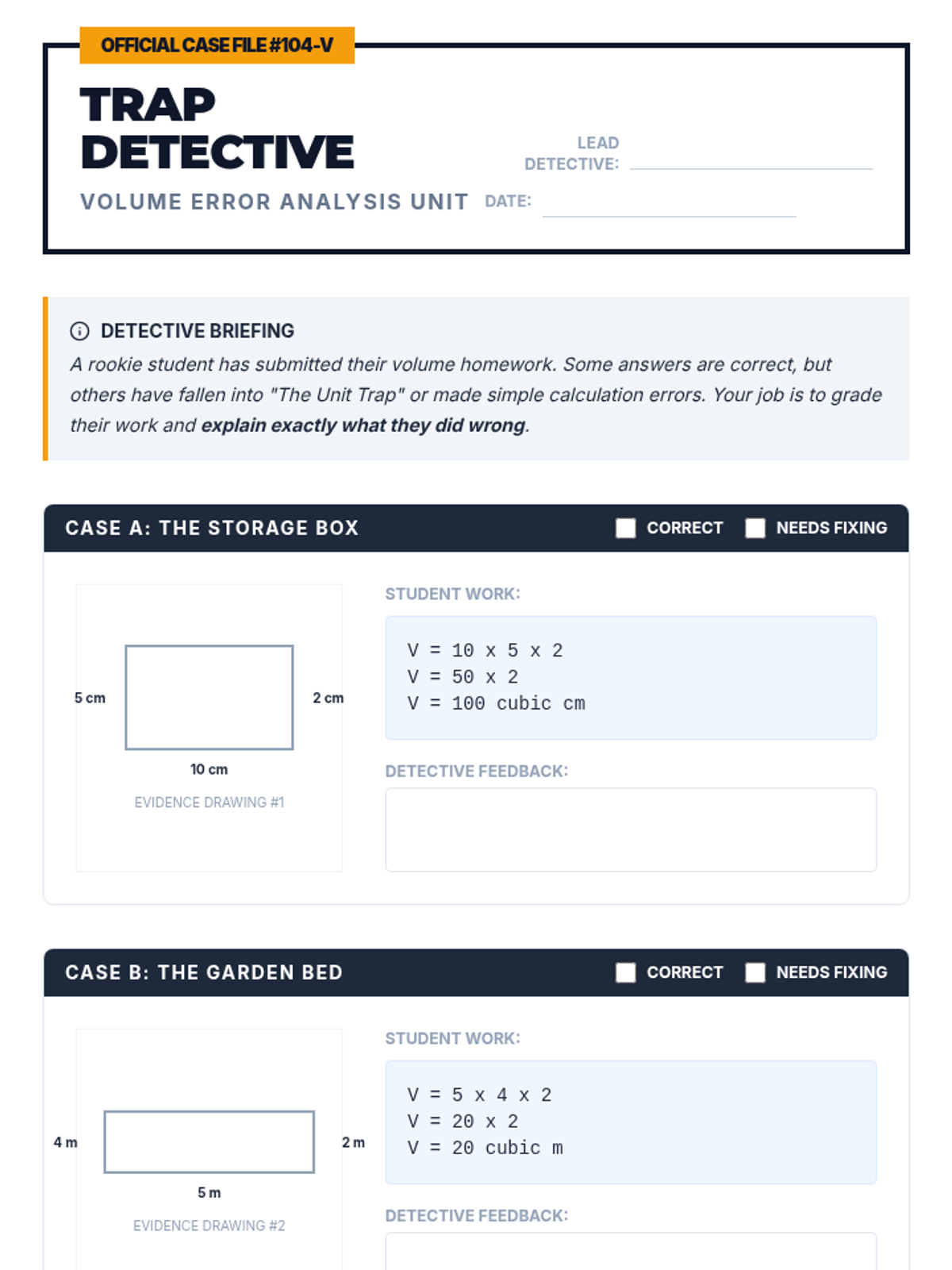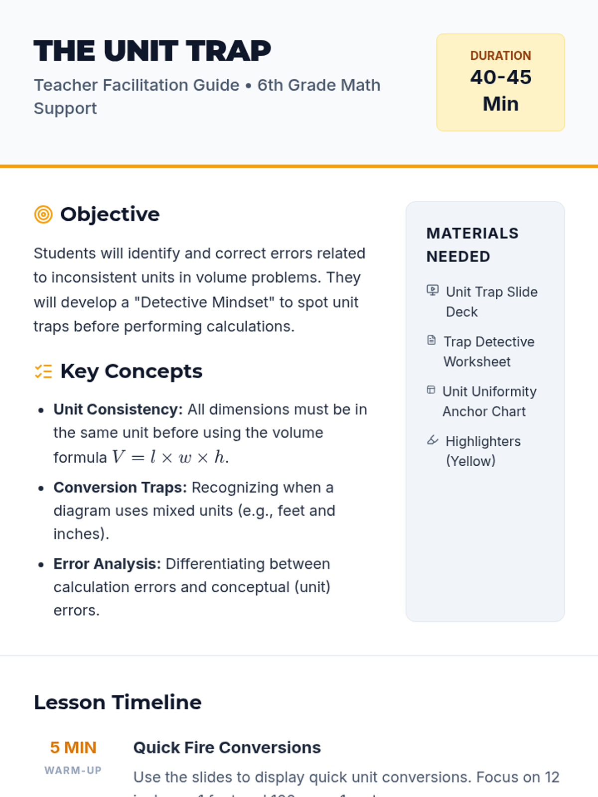 A remedial 6th-grade math lesson focused on identifying and correcting unit conversion errors in volume problems, featuring video analysis and a 'Trap Detective' error analysis activity.