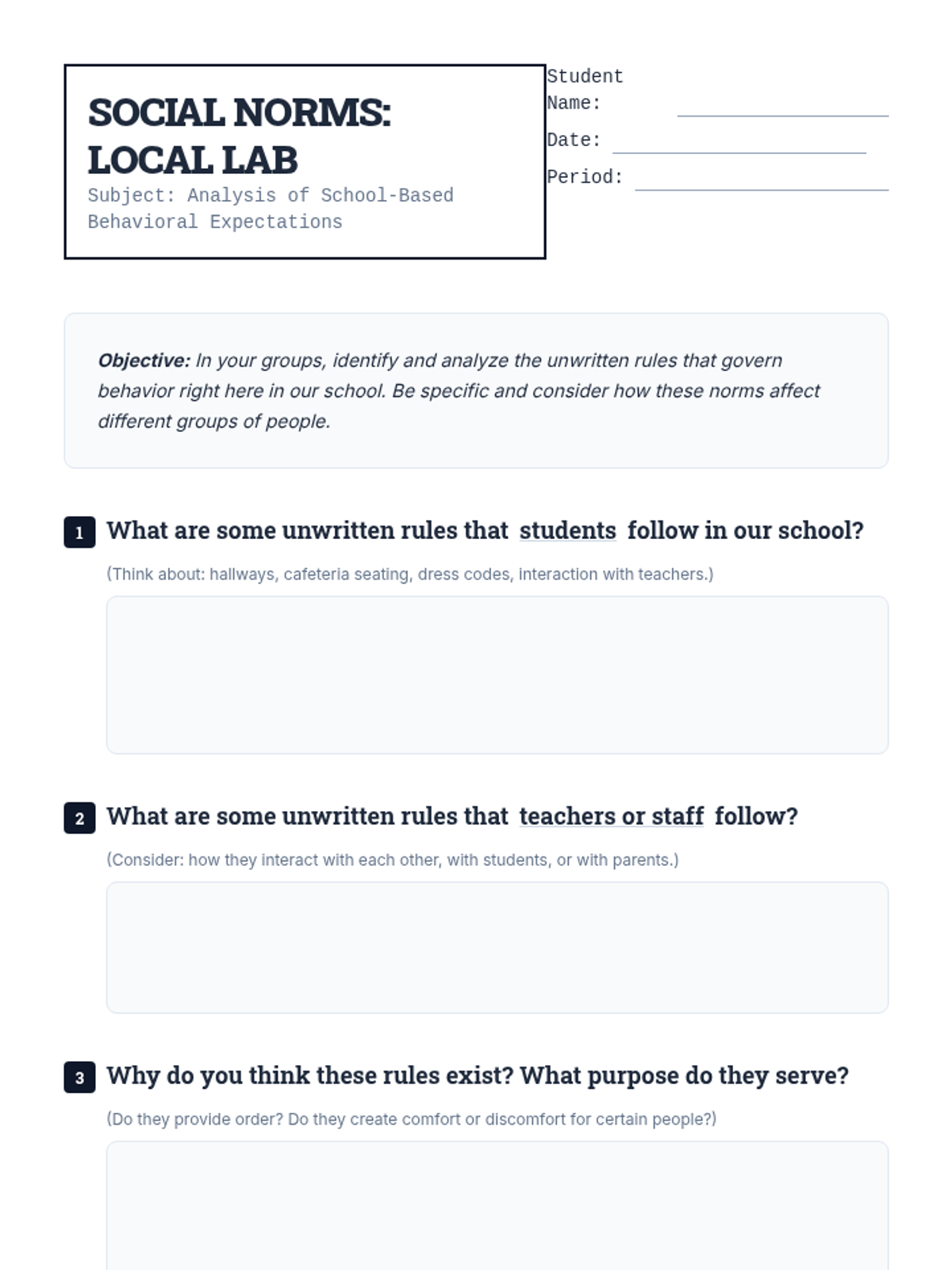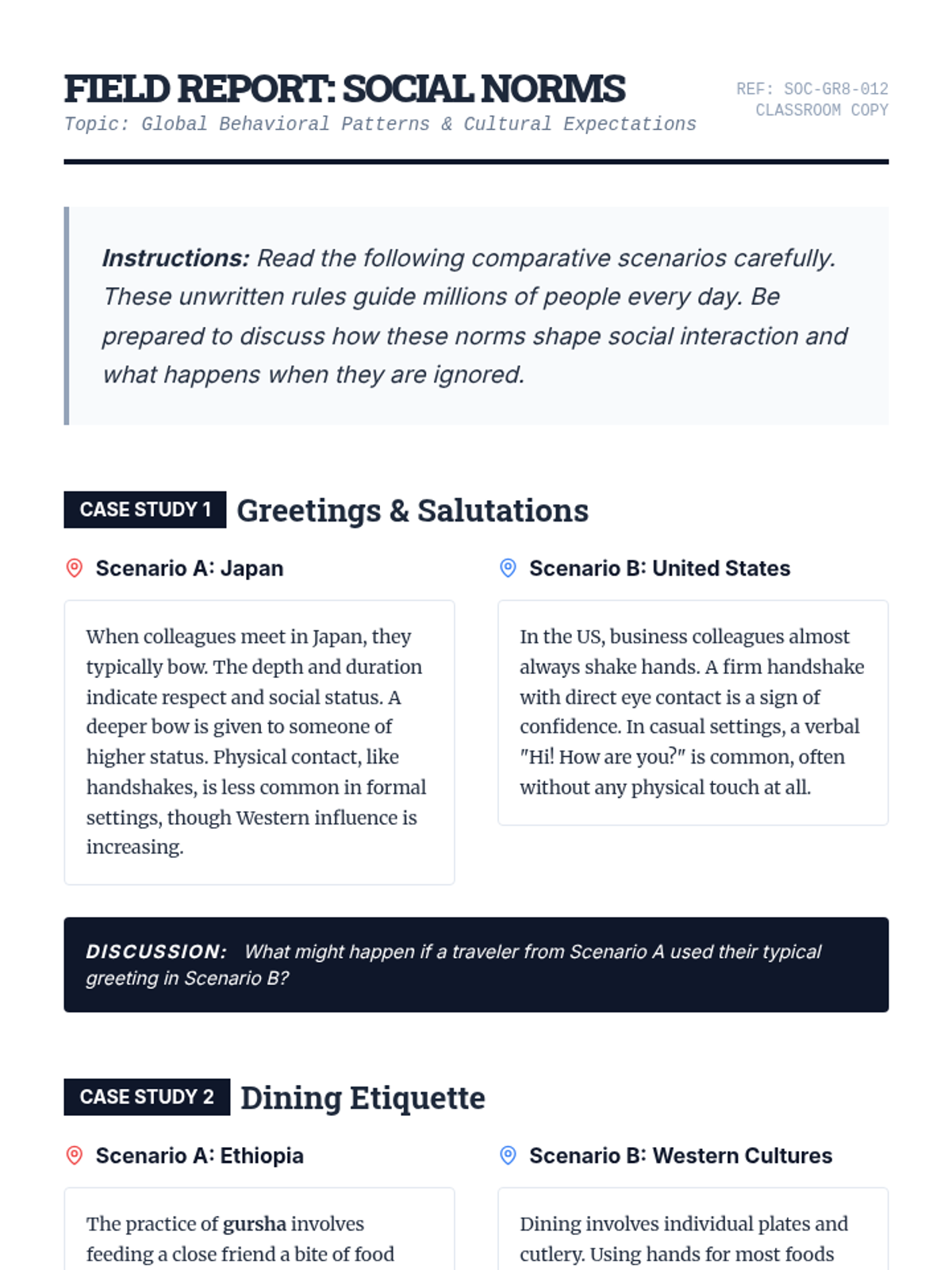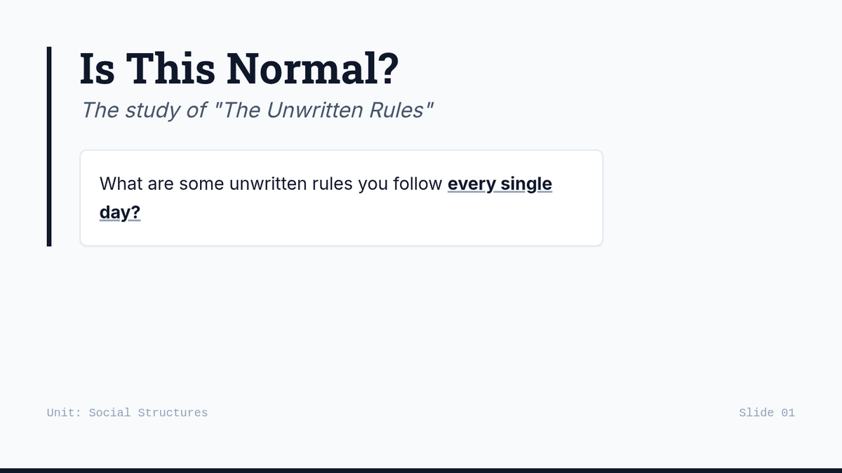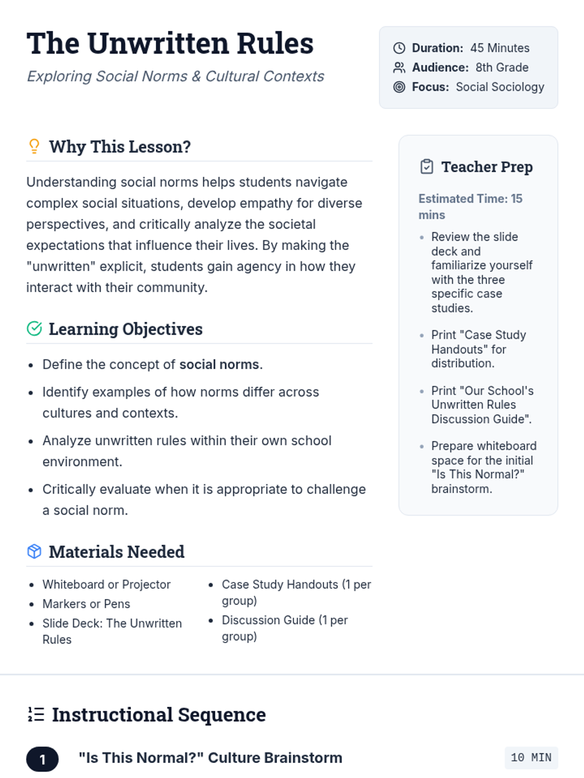 This lesson introduces 8th-grade students to the concept of social norms, exploring how these unwritten rules shape behavior and interactions in different cultures and contexts. Students will analyze real-world examples and consider the implications of conforming to or challenging these norms.