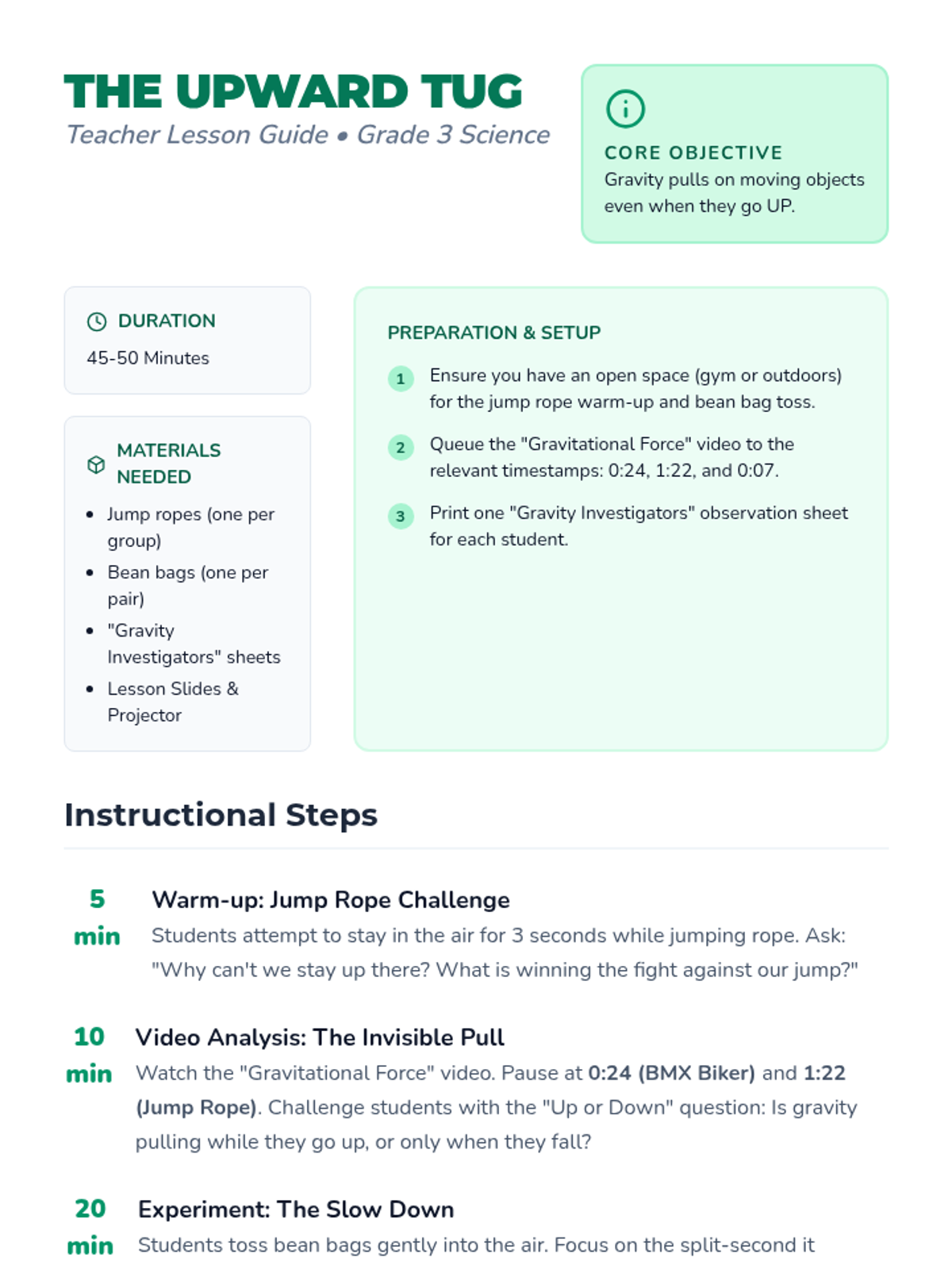 A lesson for 3rd graders exploring the constant pull of gravity, specifically focusing on how it acts on objects even as they move upward. Students engage in a jump rope challenge, analyze video evidence, and conduct a bean bag toss experiment to observe changes in speed and motion.
