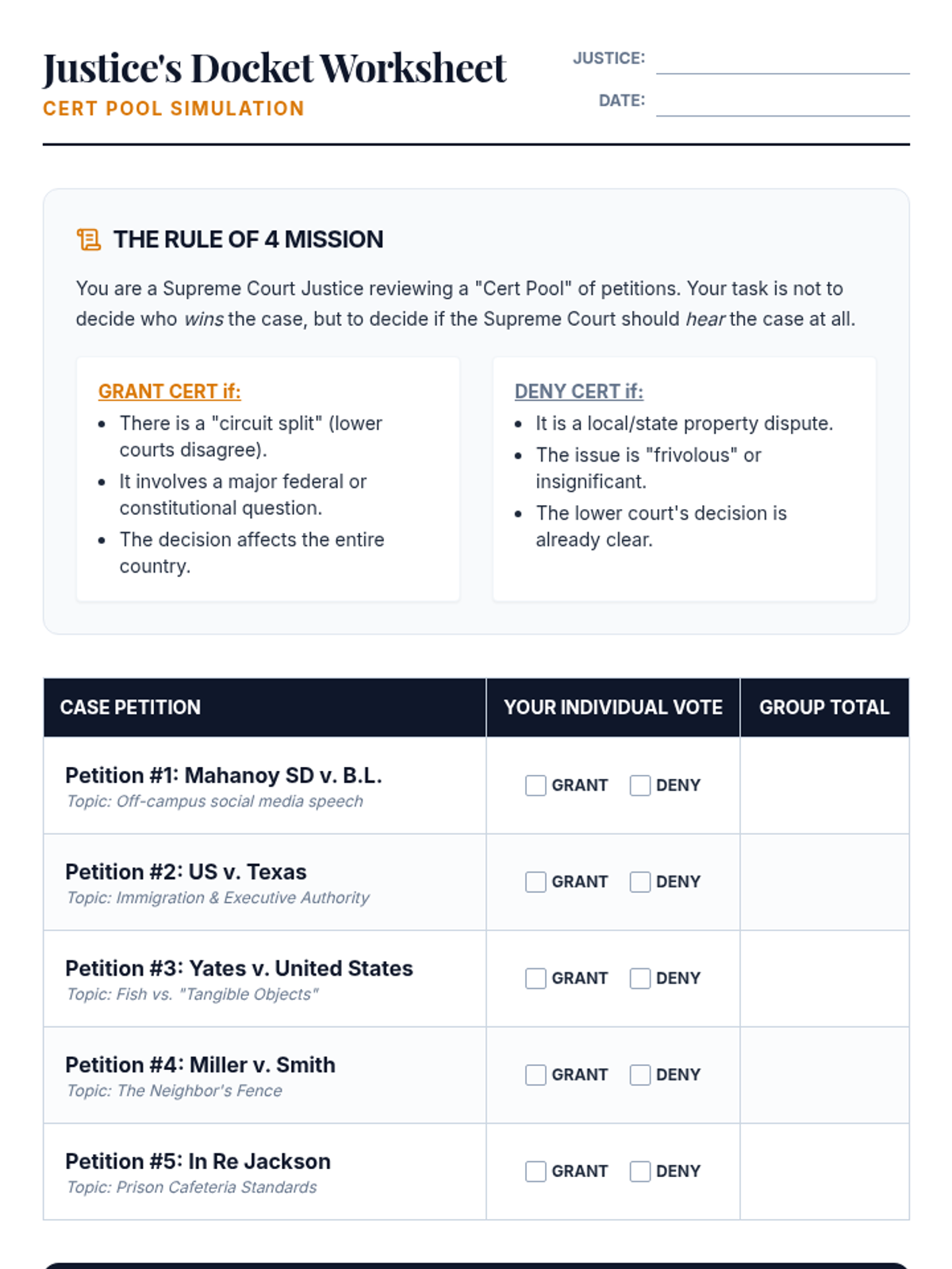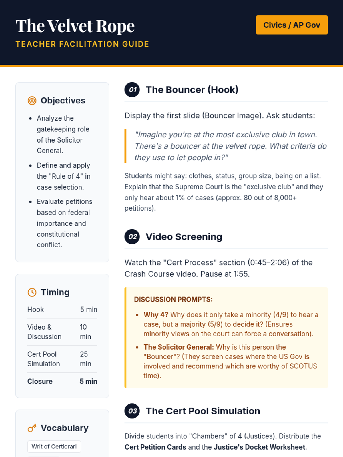 A lesson analyzing the gatekeeping process of the Supreme Court, focusing on the Solicitor General and the Rule of 4. Includes a simulation of the Cert Pool where students act as Justices to select a single case from a docket.