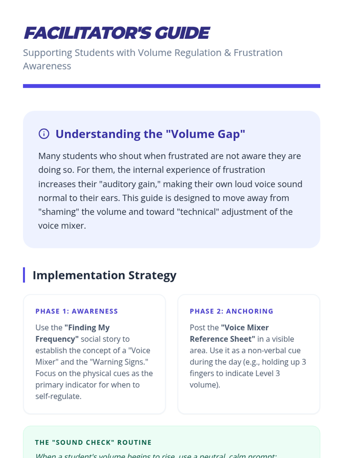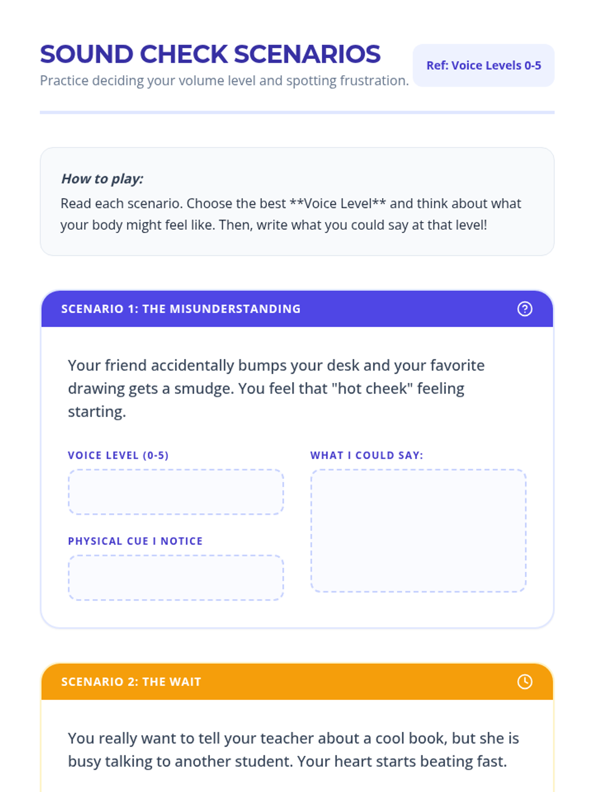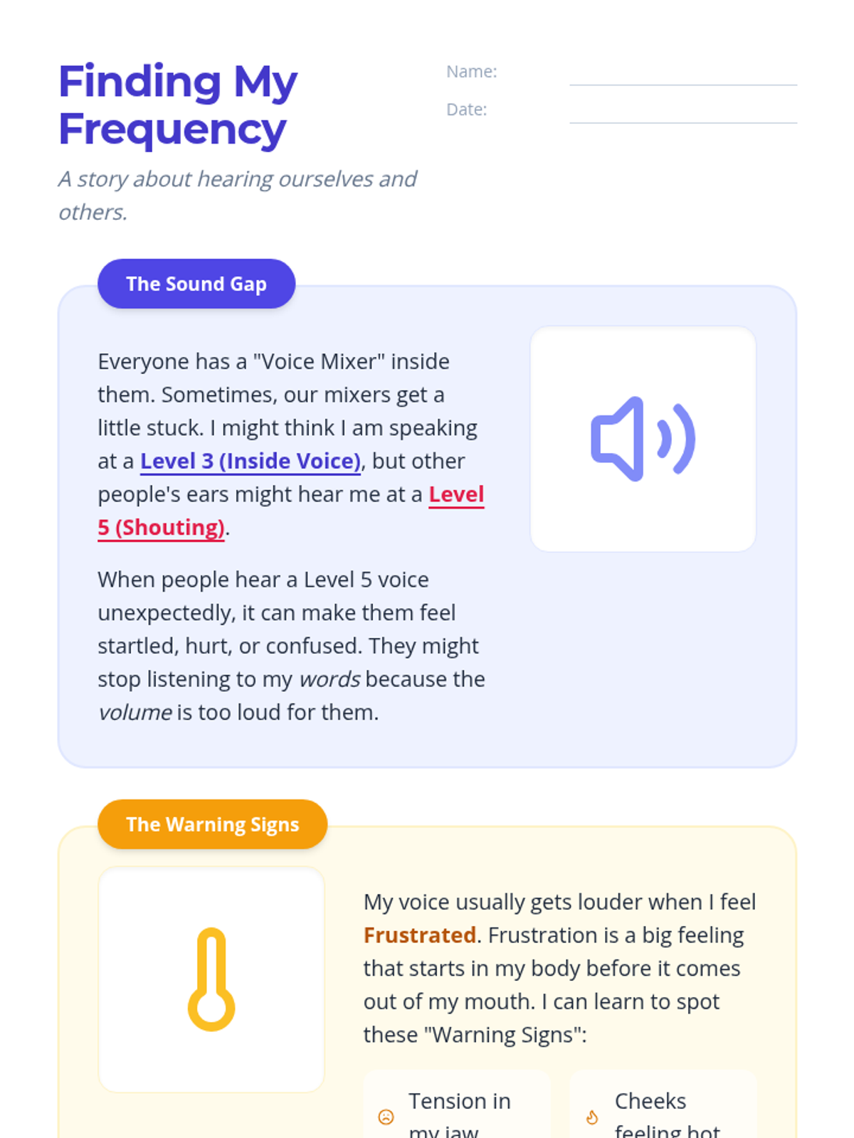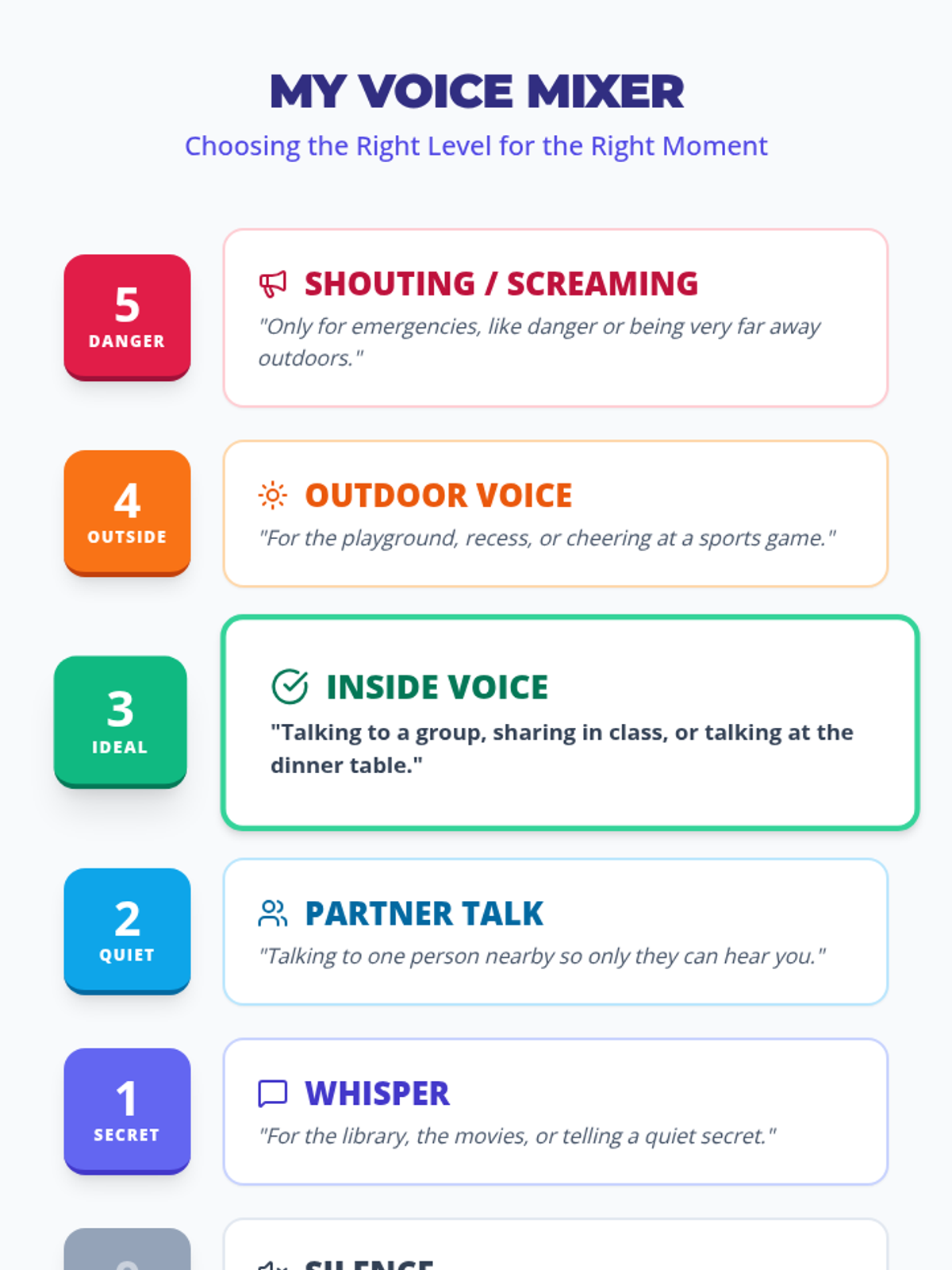 A lesson designed to help a student understand the difference between talking loudly and shouting, specifically focusing on voice modulation and recognizing physical signs of frustration.