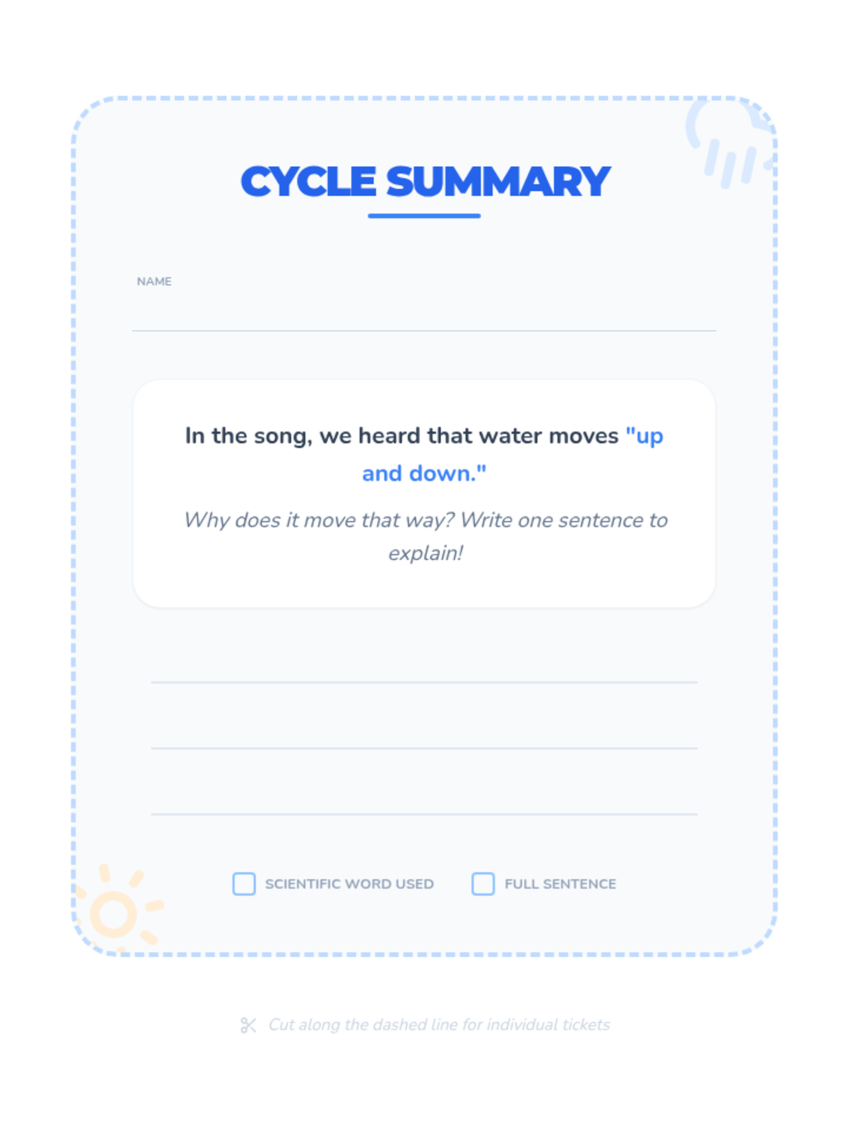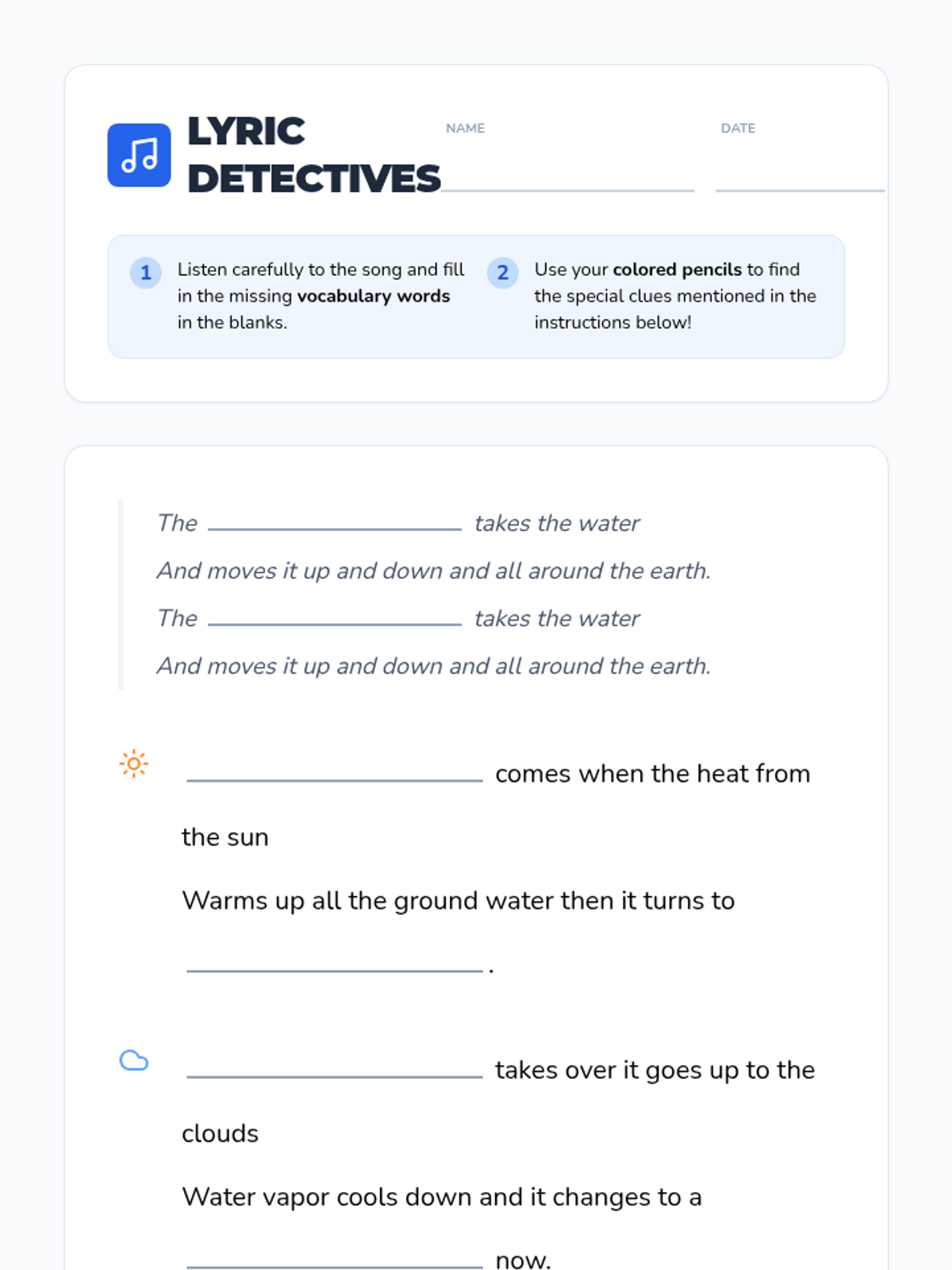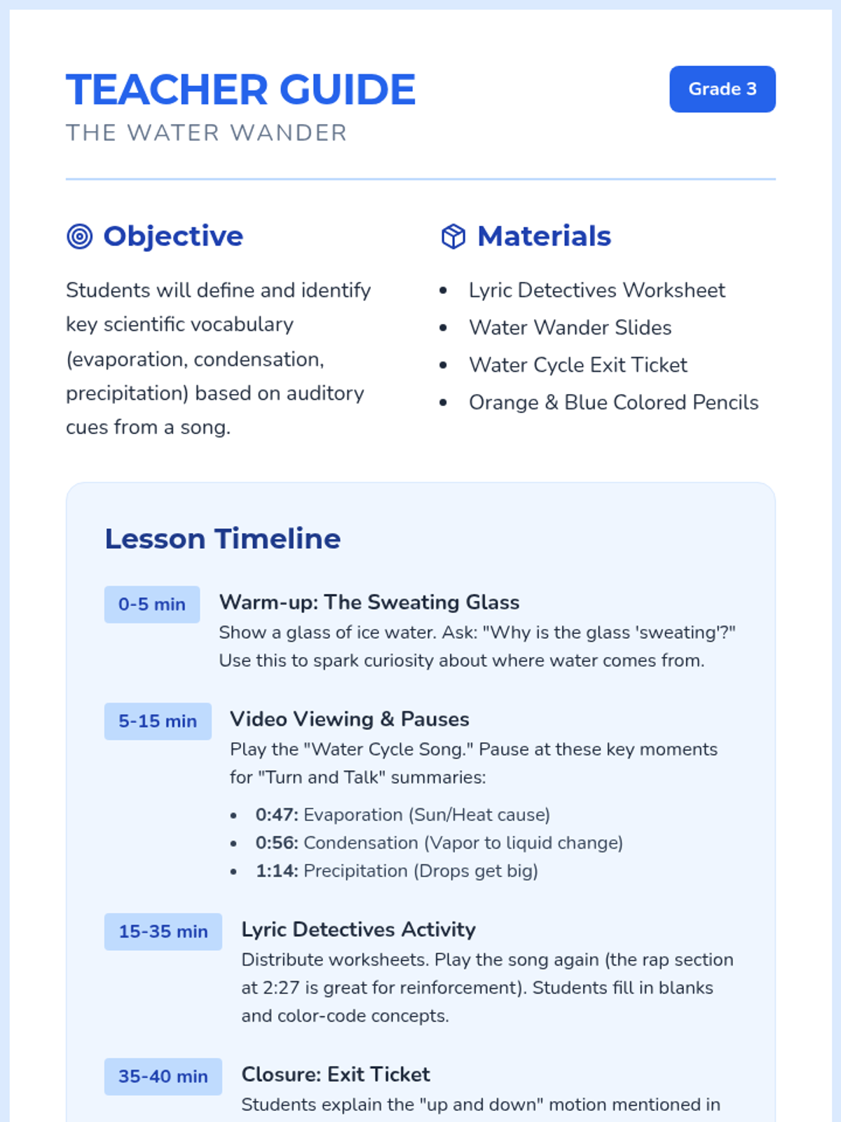 A music-based science lesson where 3rd-grade students use auditory cues from a catchy song to define evaporation, condensation, and precipitation. Students engage in a cloze activity and color-coding to identify the causes and effects within the water cycle.
