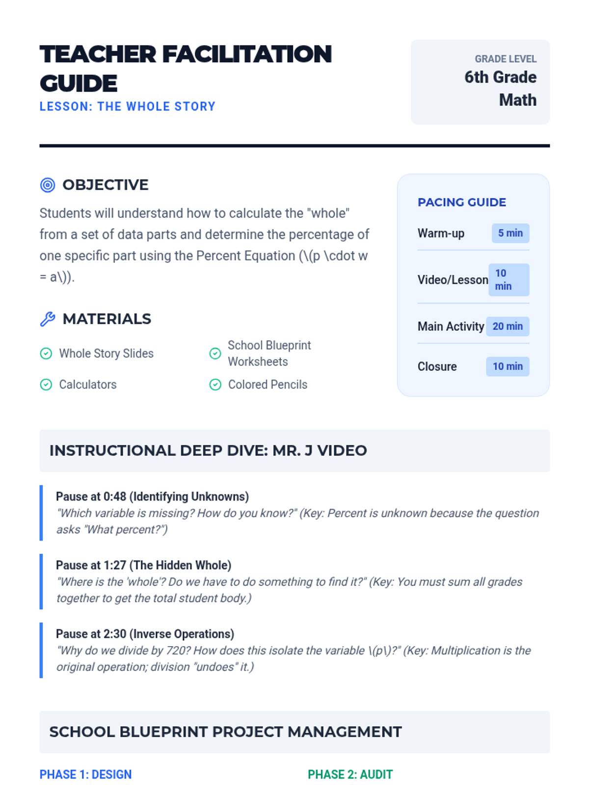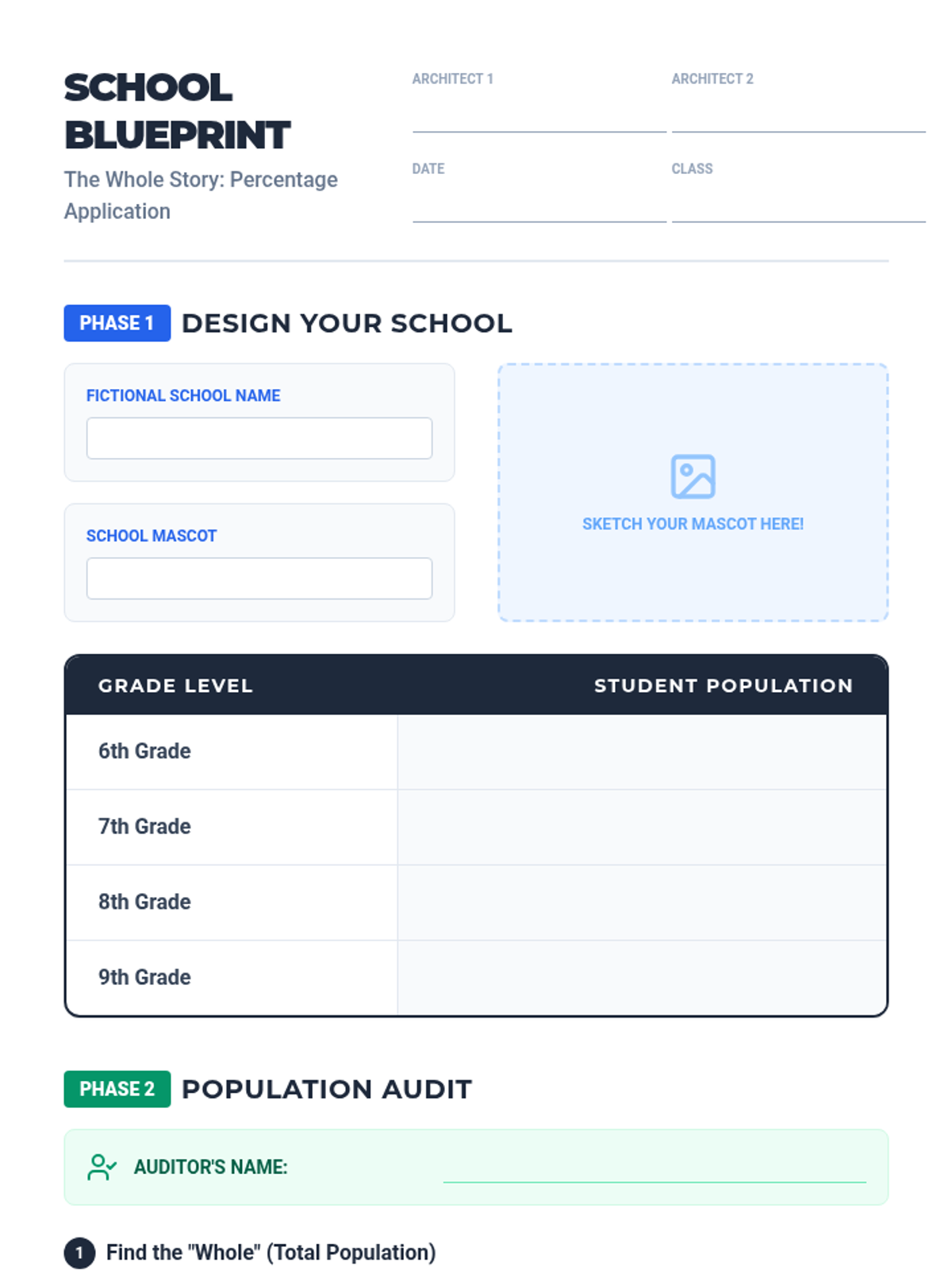 Students learn to calculate the 'whole' by summing data parts and then determining the percentage of specific segments using the percent equation. The lesson features a real-world school population problem and a creative project where students design their own schools.