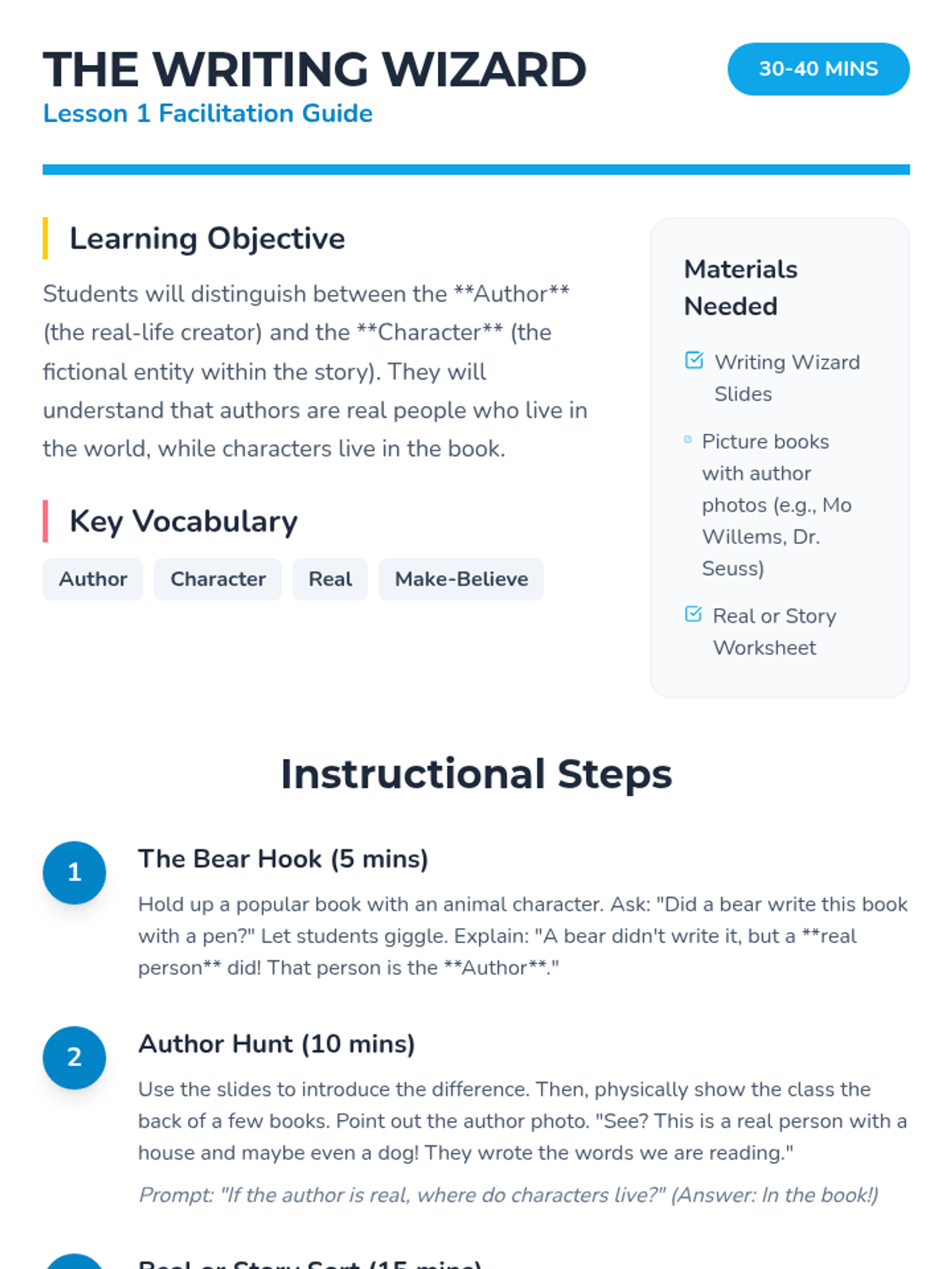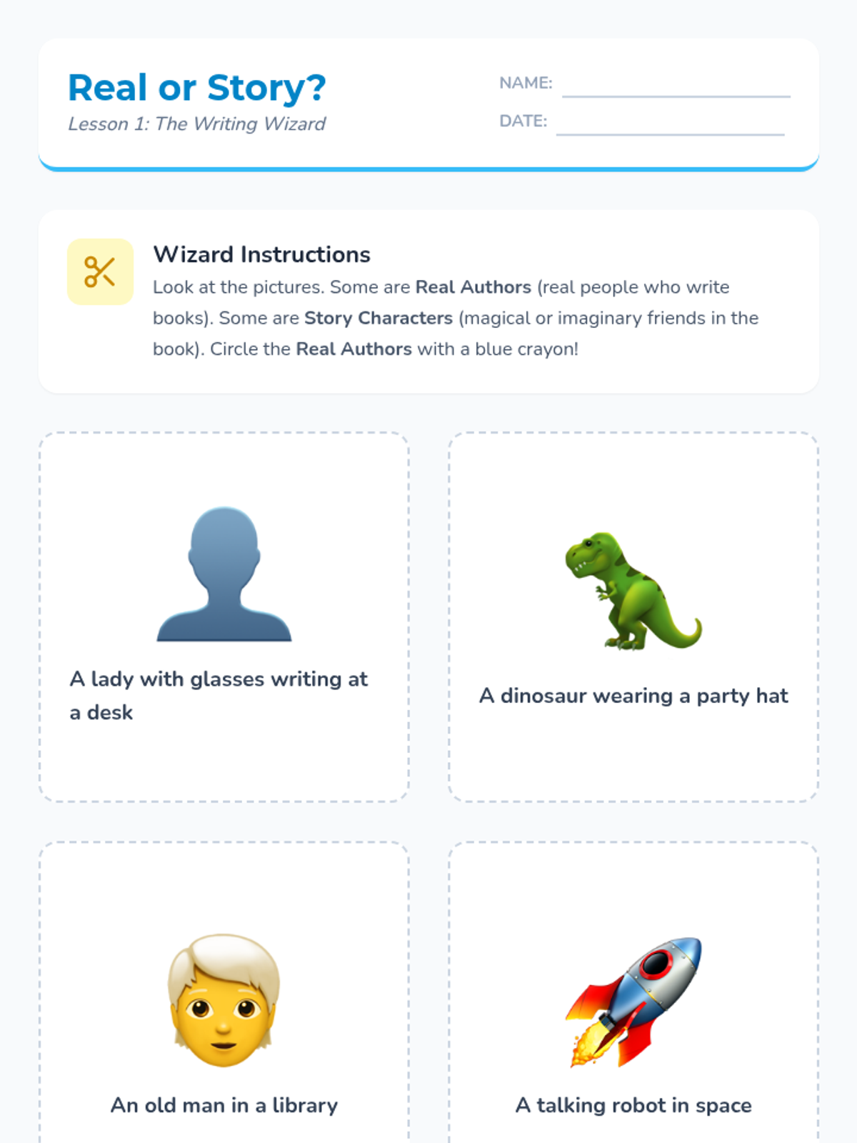 Students distinguish between the real-life author and the fictional characters in a book. They compare author photos with character illustrations to see the difference between reality and story.