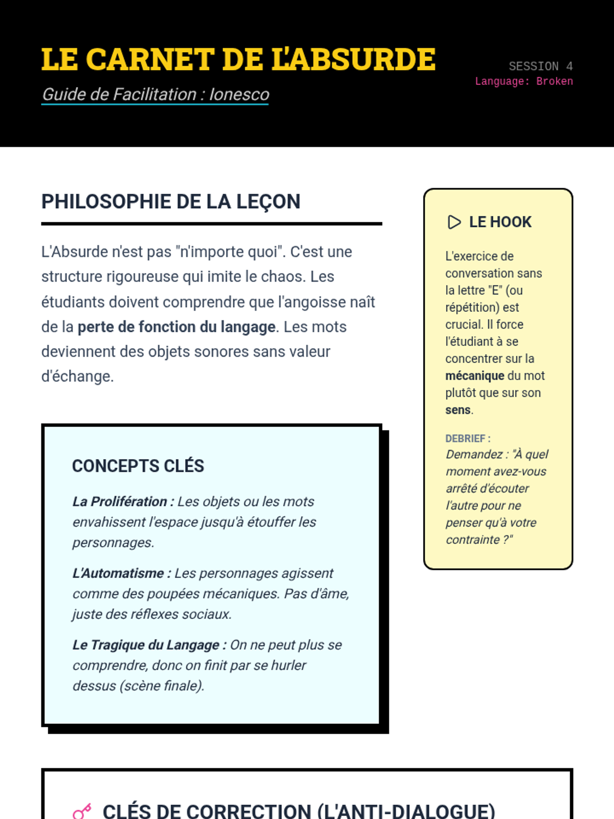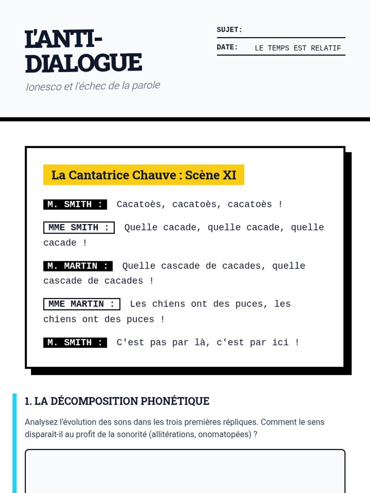 Reading Ionesco's 'La Cantatrice Chauve', students analyze the breakdown of language. They discuss how repetition, non-sequiturs, and clichés are used to demonstrate the failure of communication.