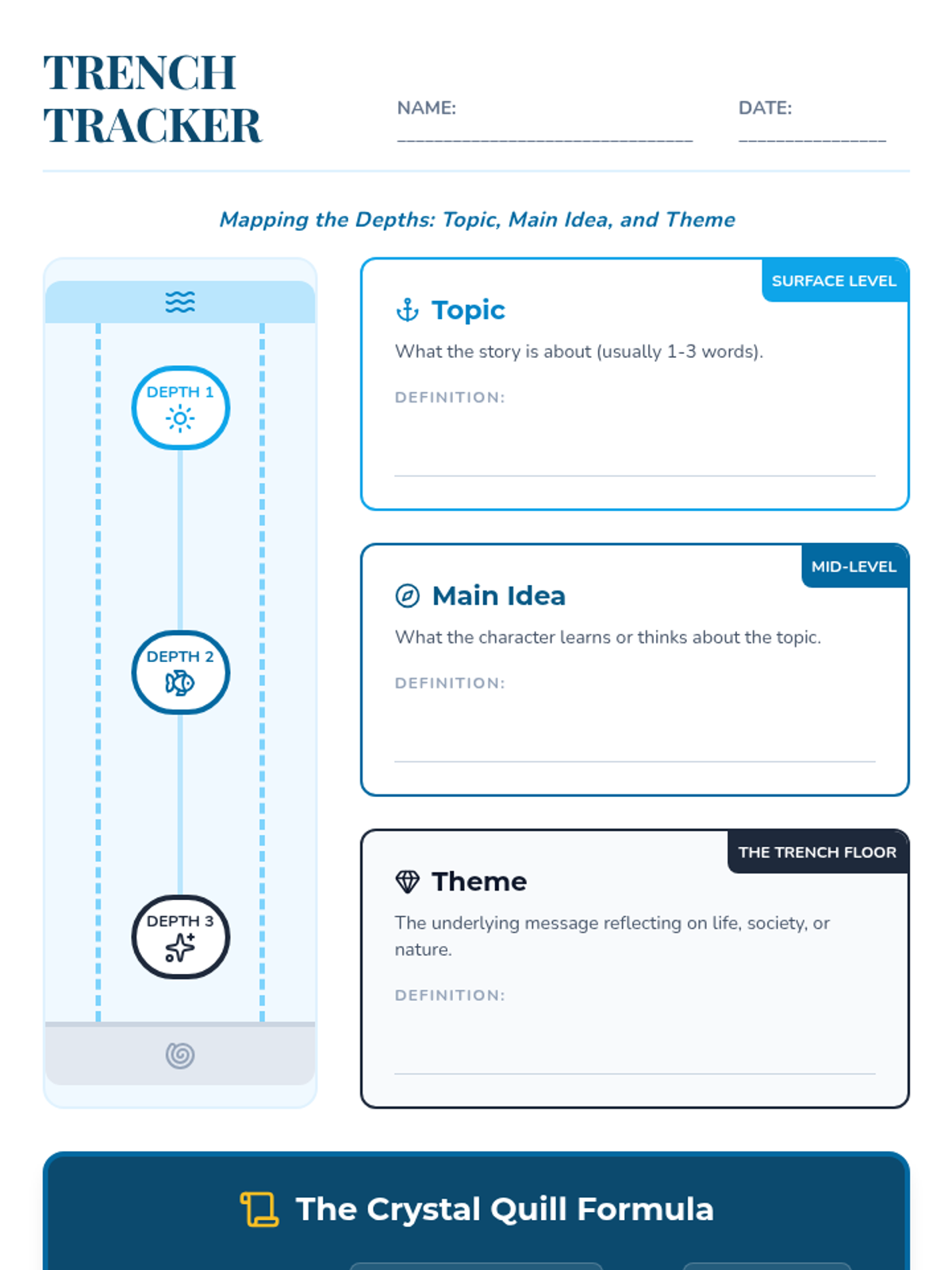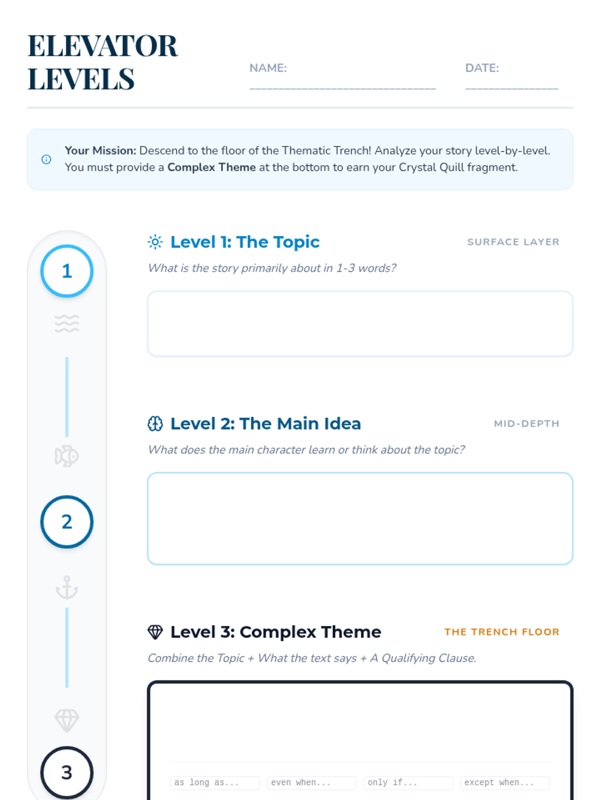 Students will use the 'Thematic Trench' elevator metaphor to distinguish between a story's topic, main idea, and theme, learning to craft complex thematic statements with qualifying clauses.