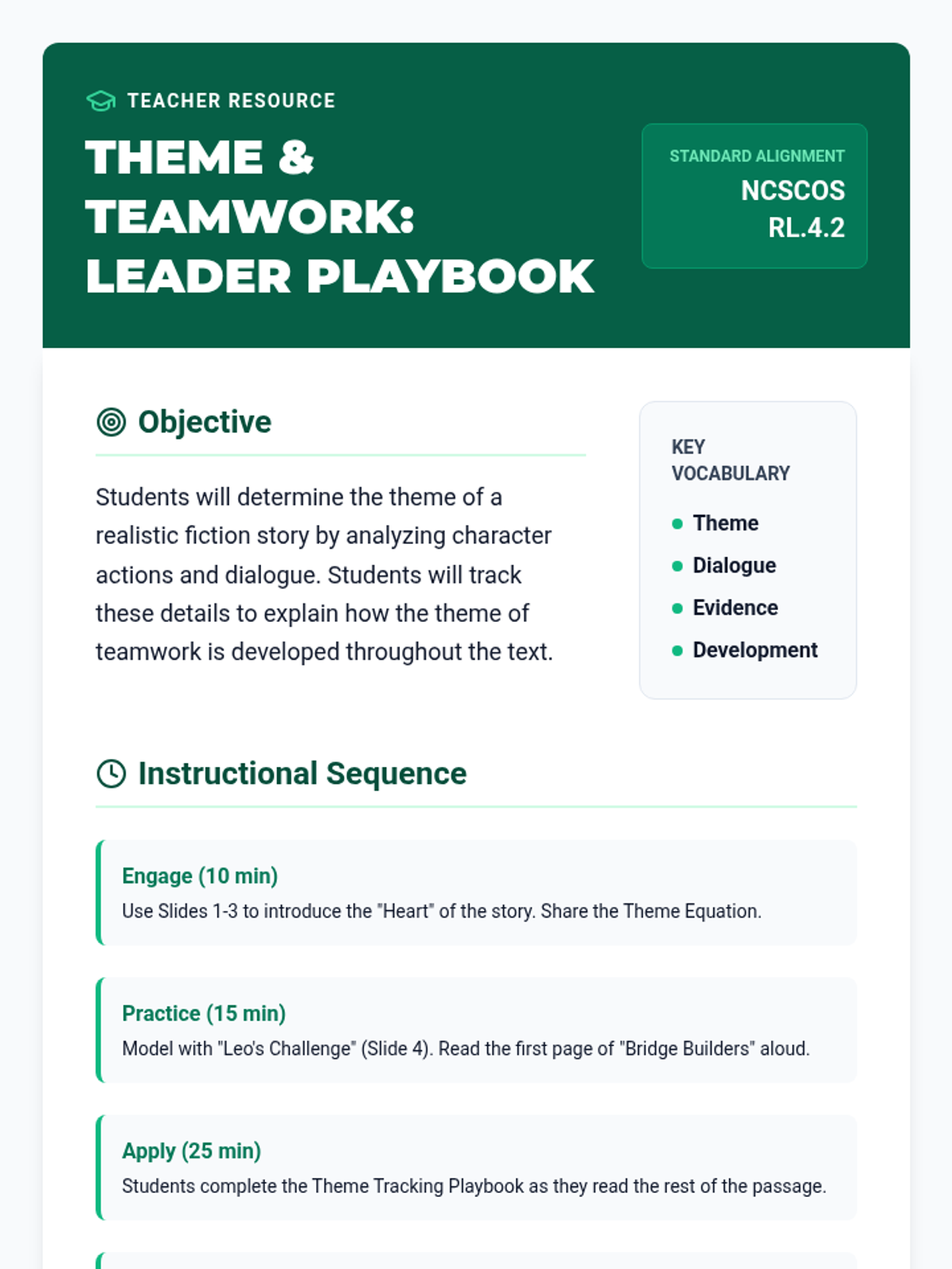 A Grade 4 ELA lesson focused on identifying themes in realistic fiction through character actions and dialogue, centered around a story of collaborative problem-solving.