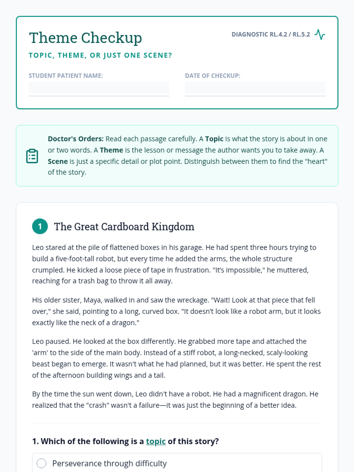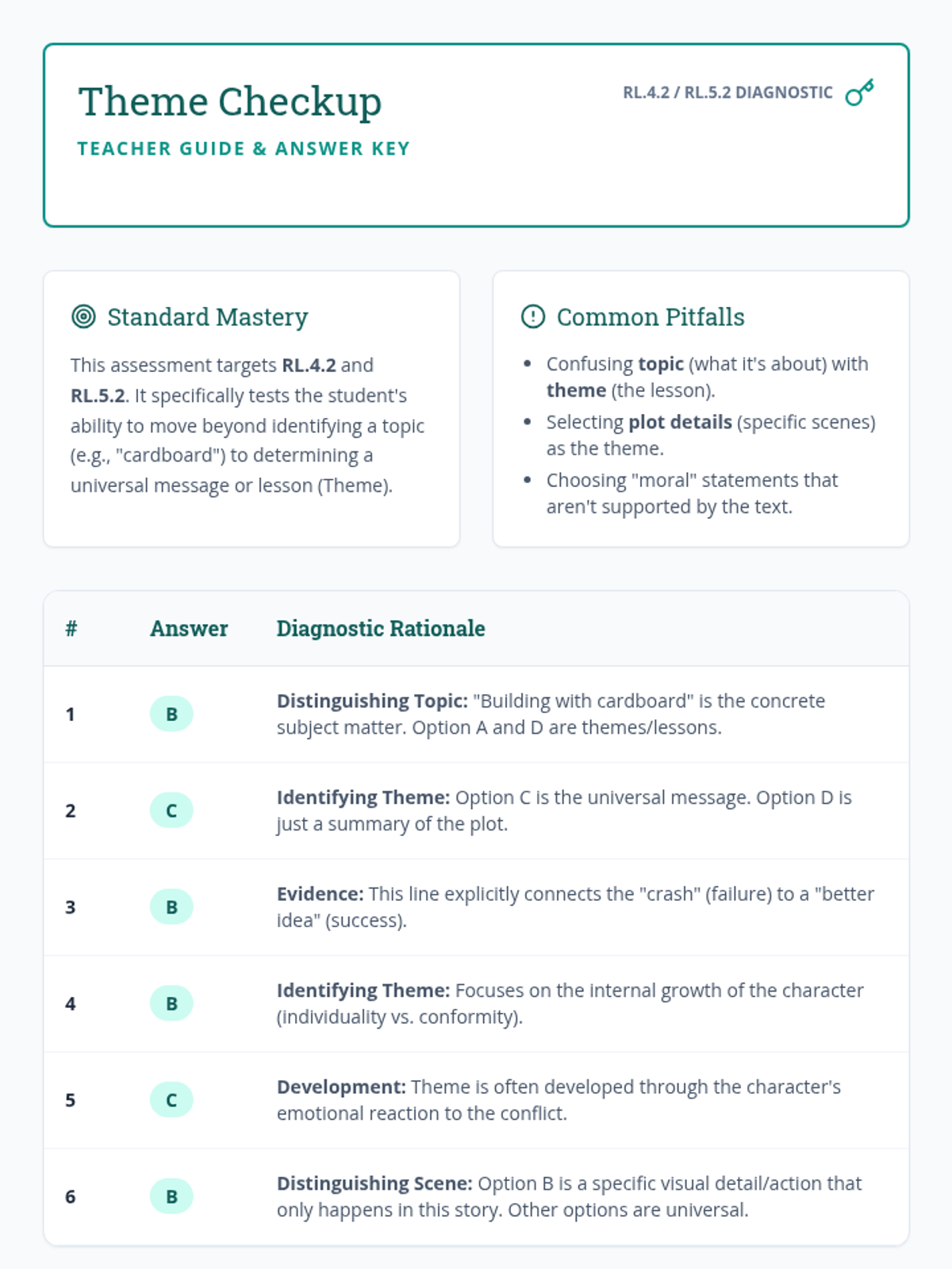 A diagnostic mini-assessment focused on NC EOG standard RL.4-5.2, helping students distinguish between topic, theme, and plot details using two grade-appropriate fiction passages.