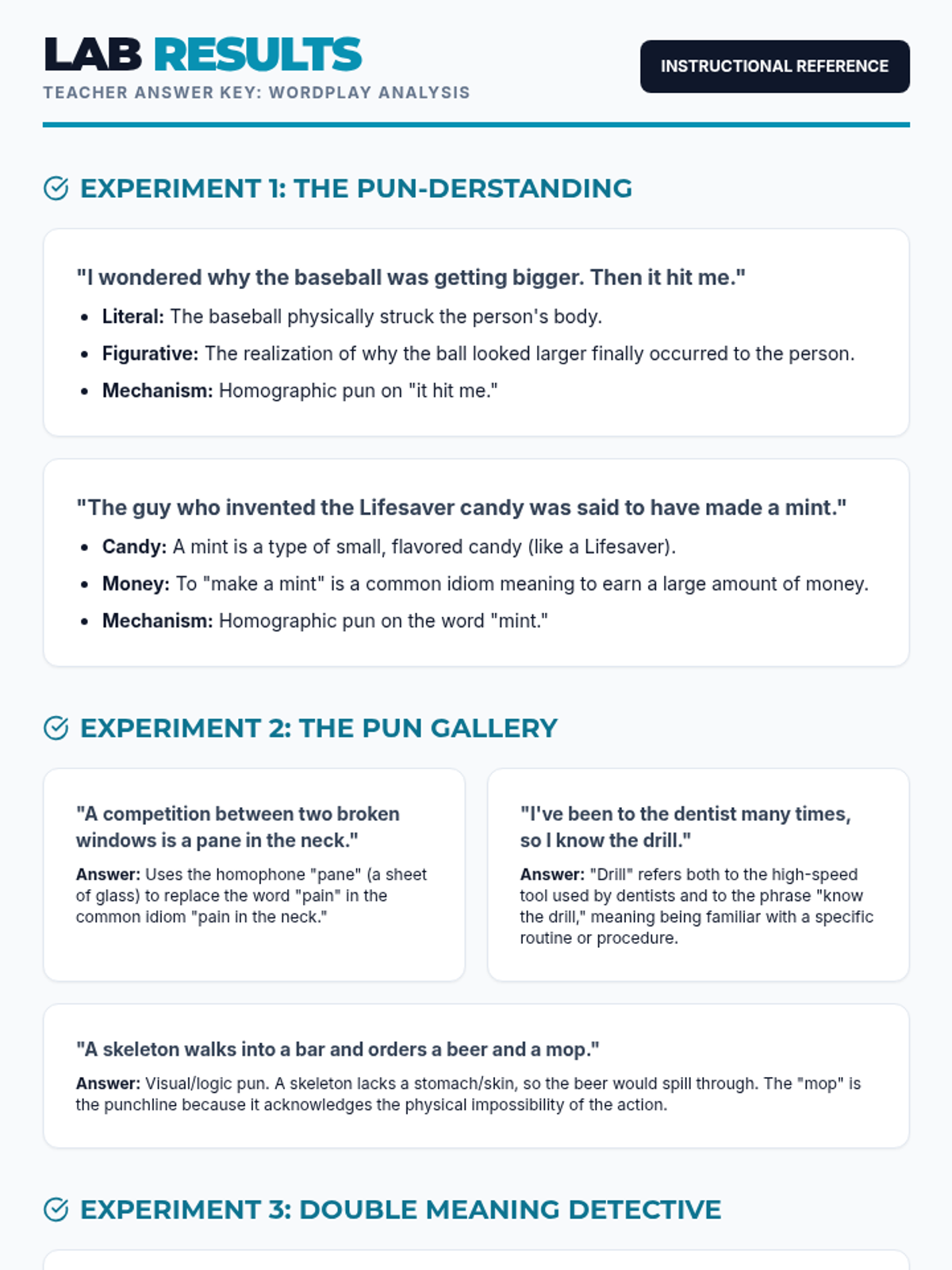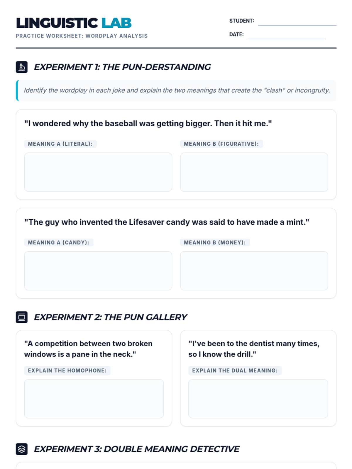 A high-school level exploration of puns, idioms, and double-meanings, focusing on the linguistic mechanisms that create humor. Students learn to deconstruct wordplay using the incongruity theory of humor.