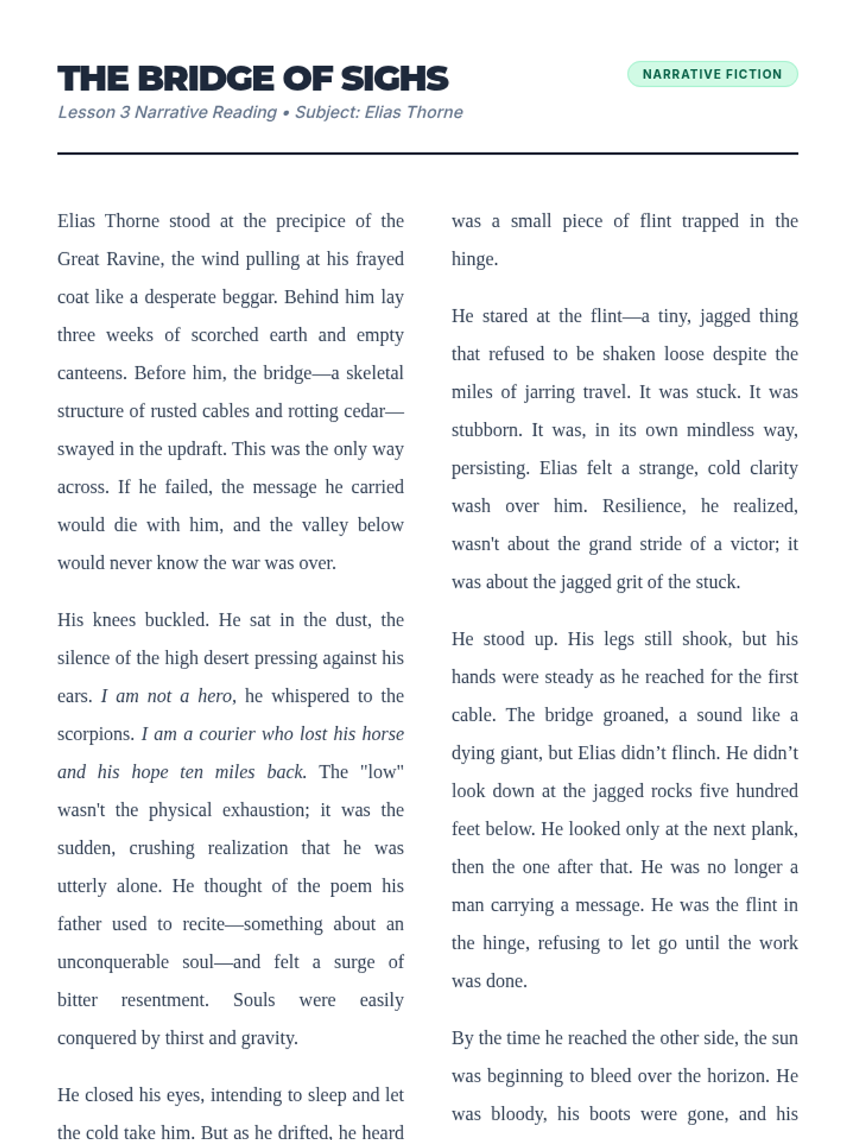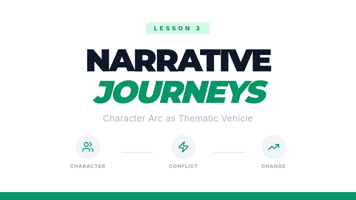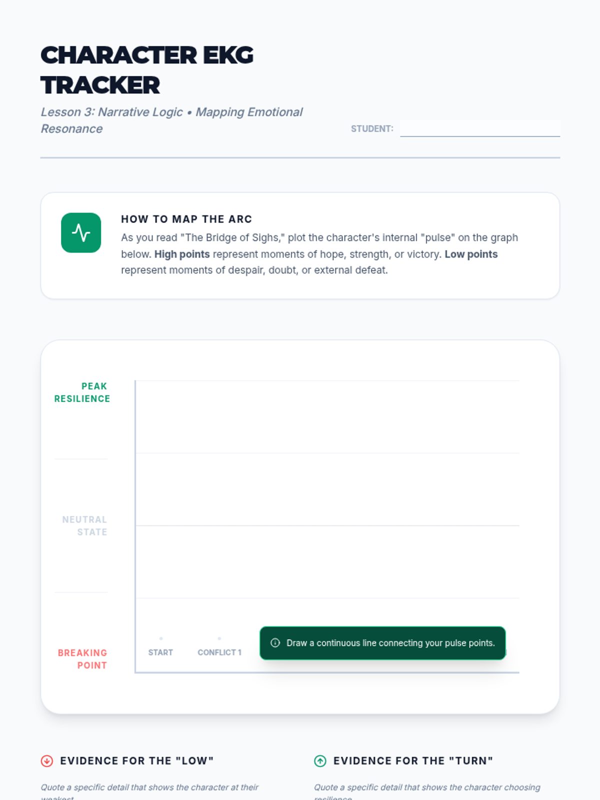 Students explore how narrative structure and character development reveal theme, using a 'Character EKG' to track emotional arcs and internal conflict.