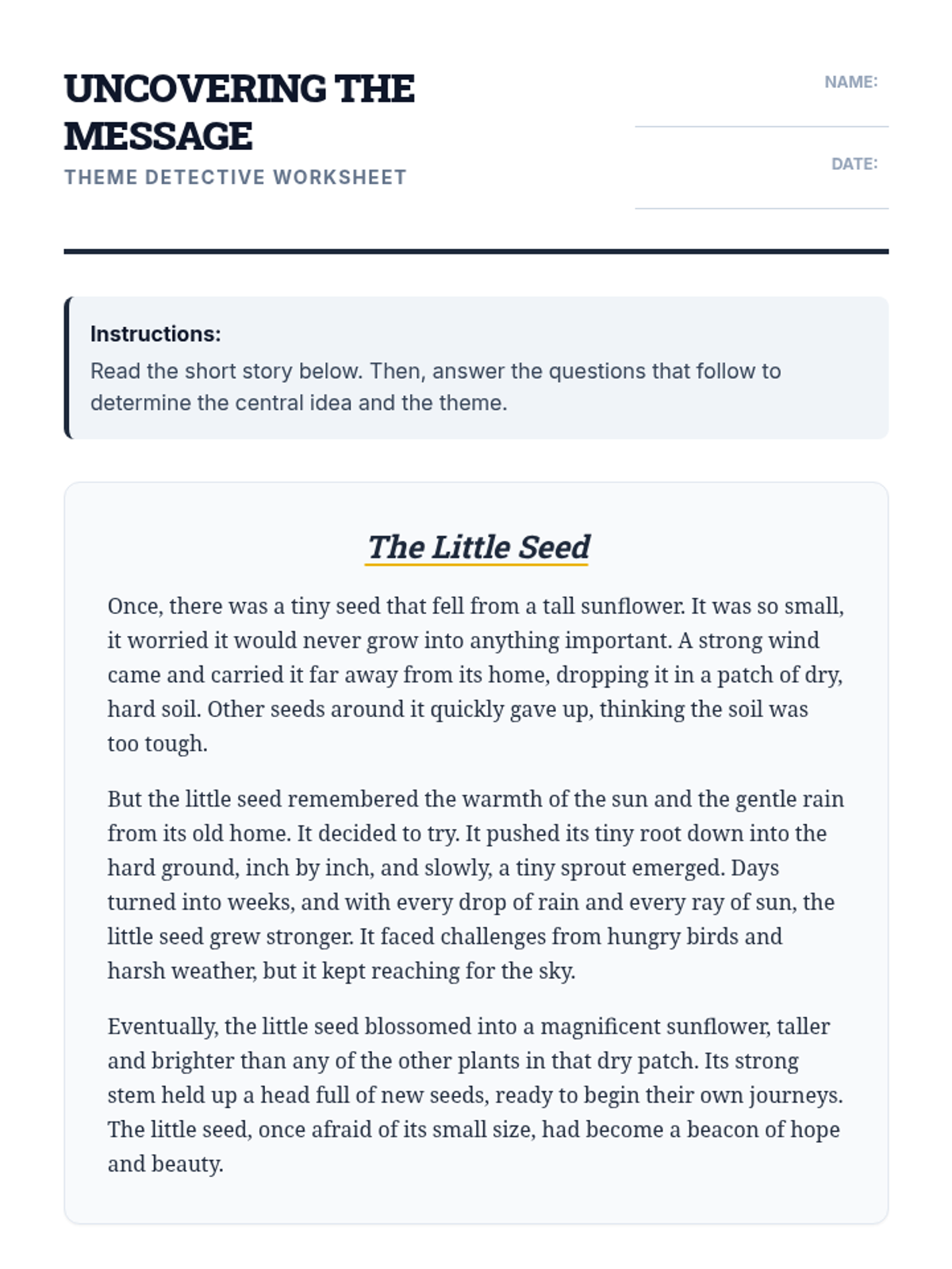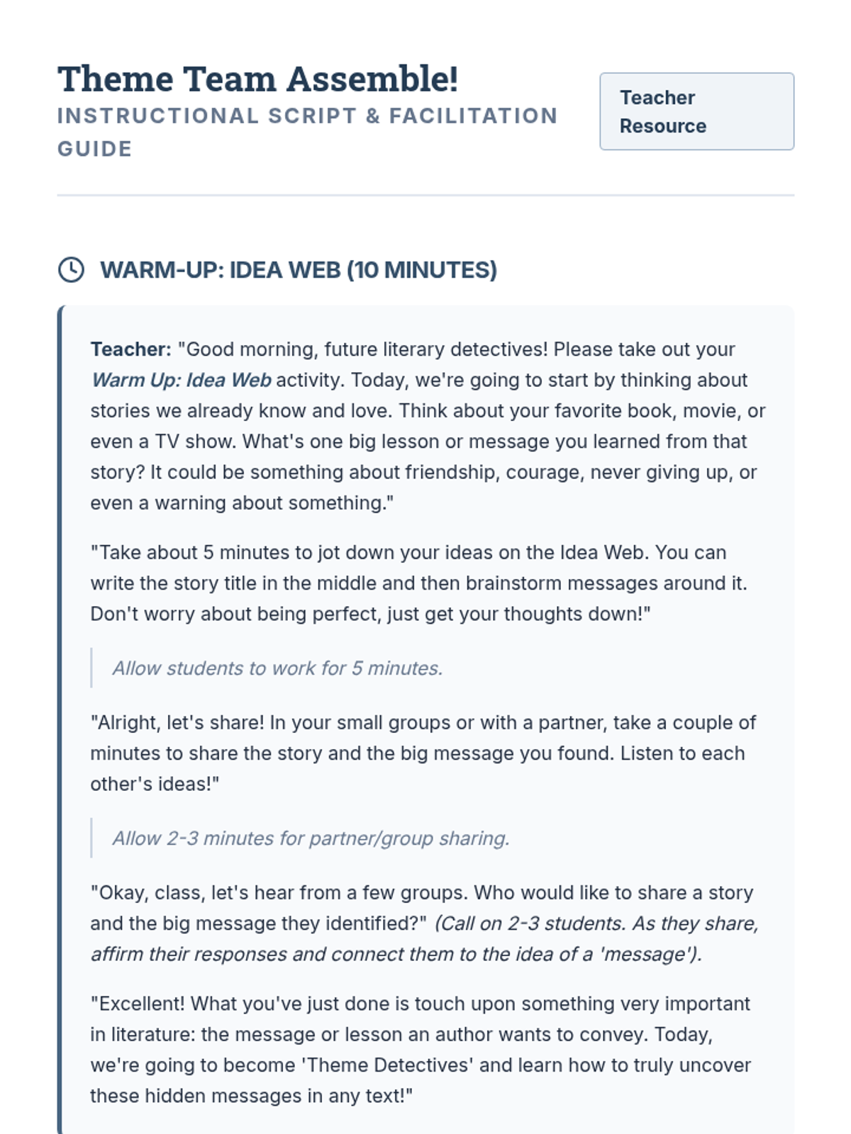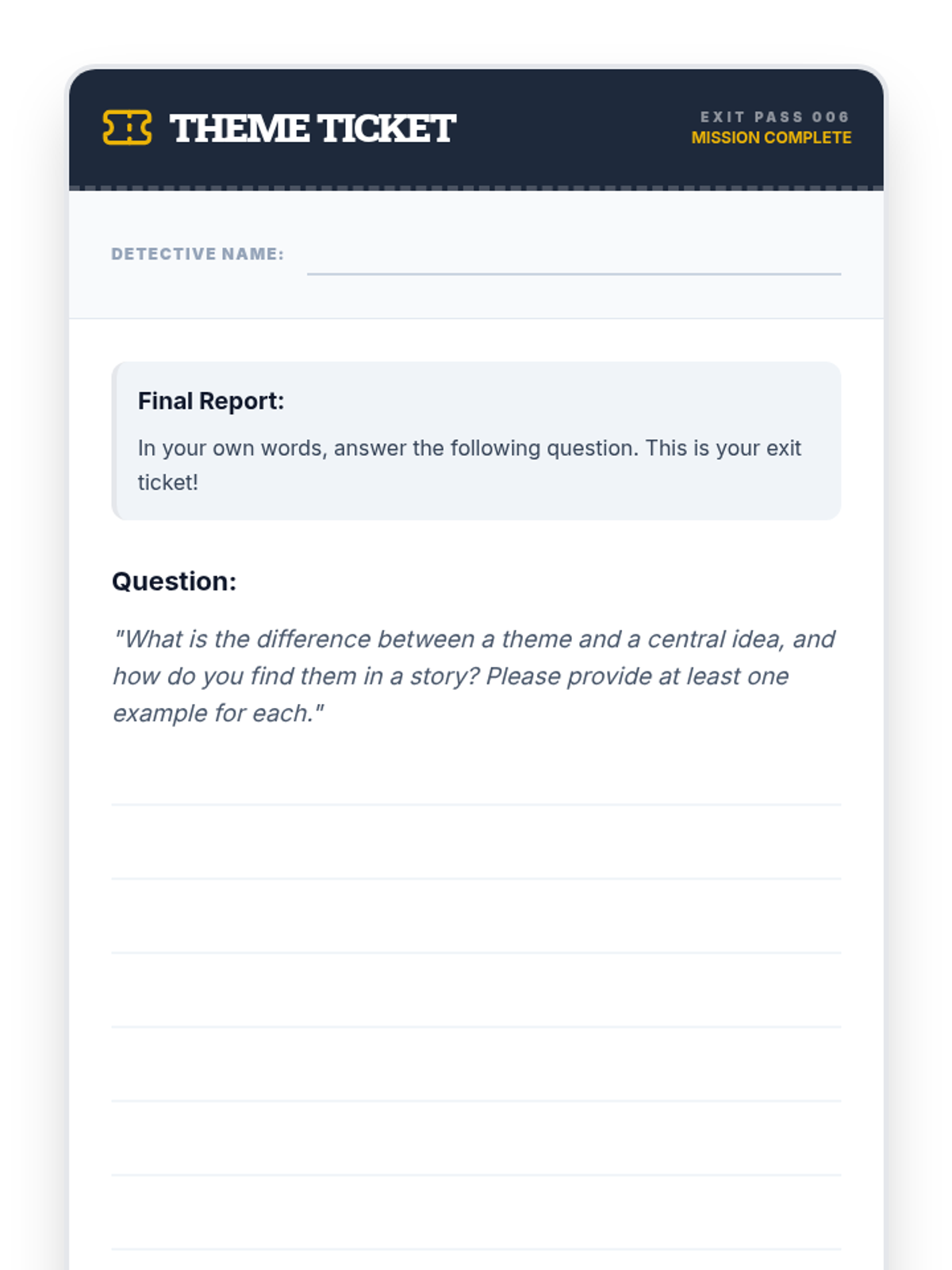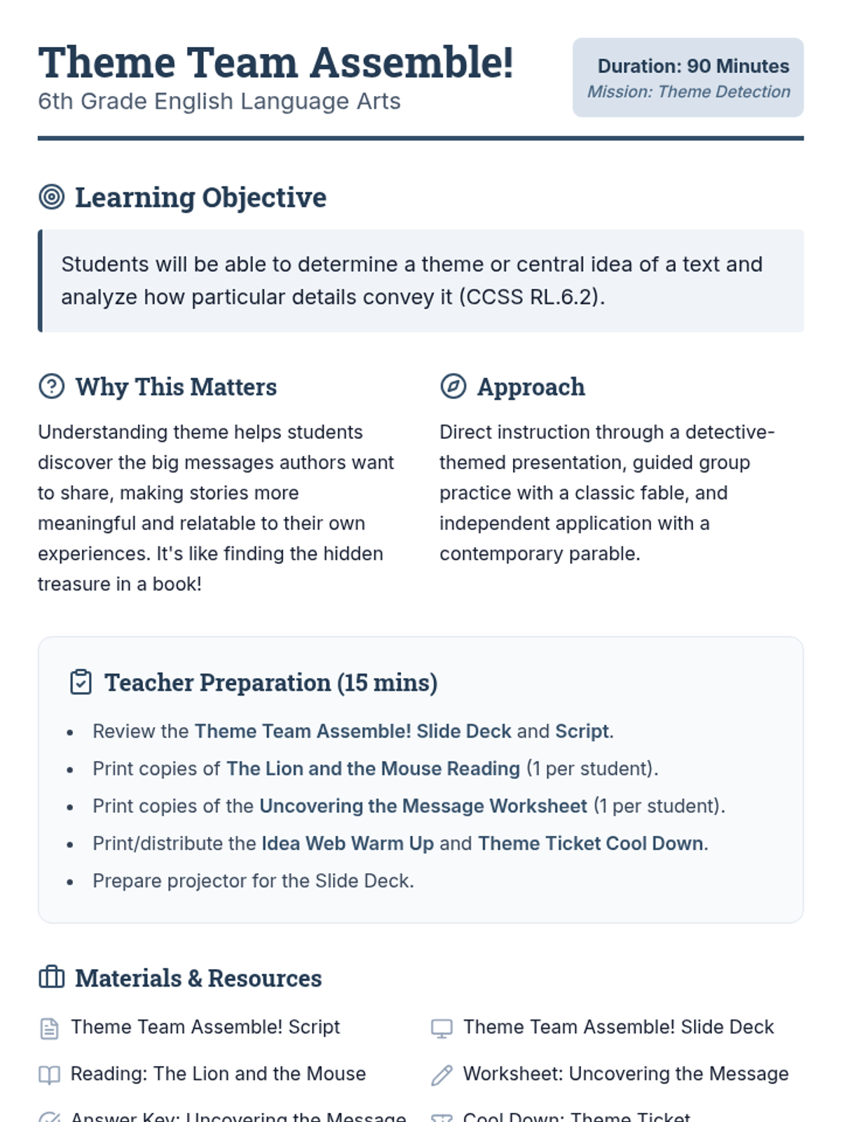 This 90-minute lesson empowers 6th-grade students to confidently identify the theme and central idea of a text and analyze how specific details reveal them. Students become 'Theme Detectives' to uncover hidden messages in literature.