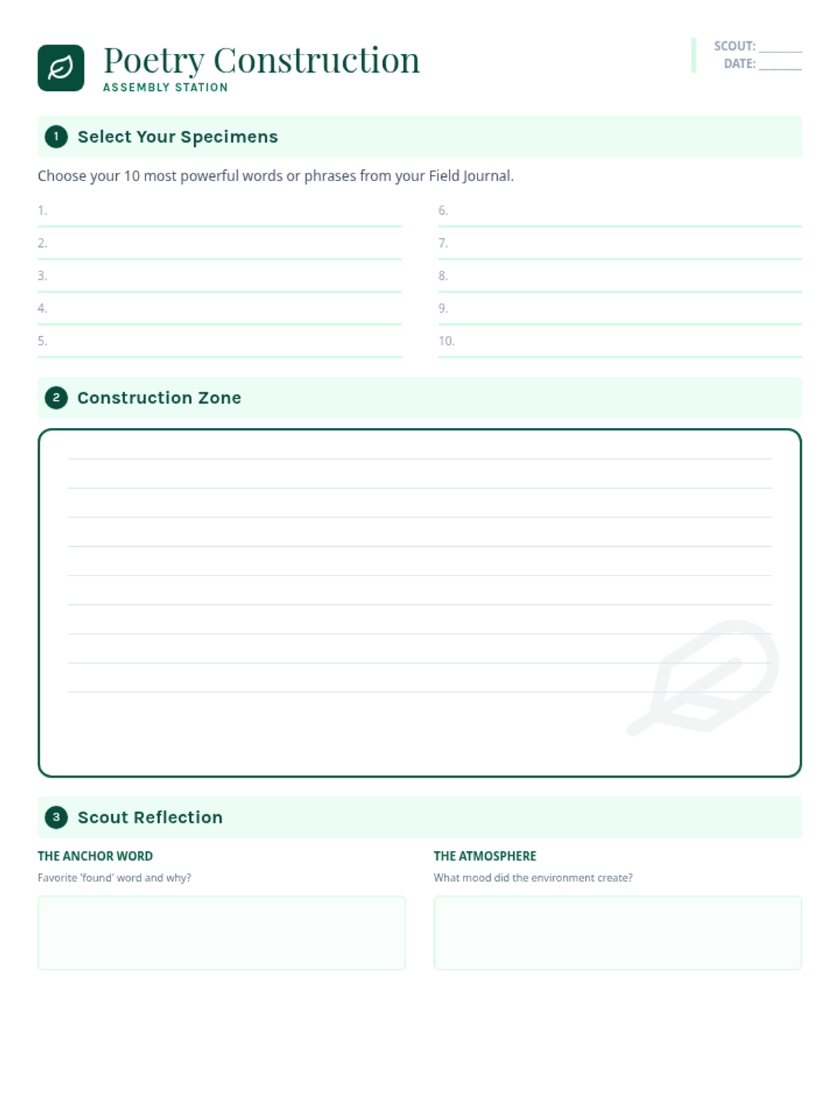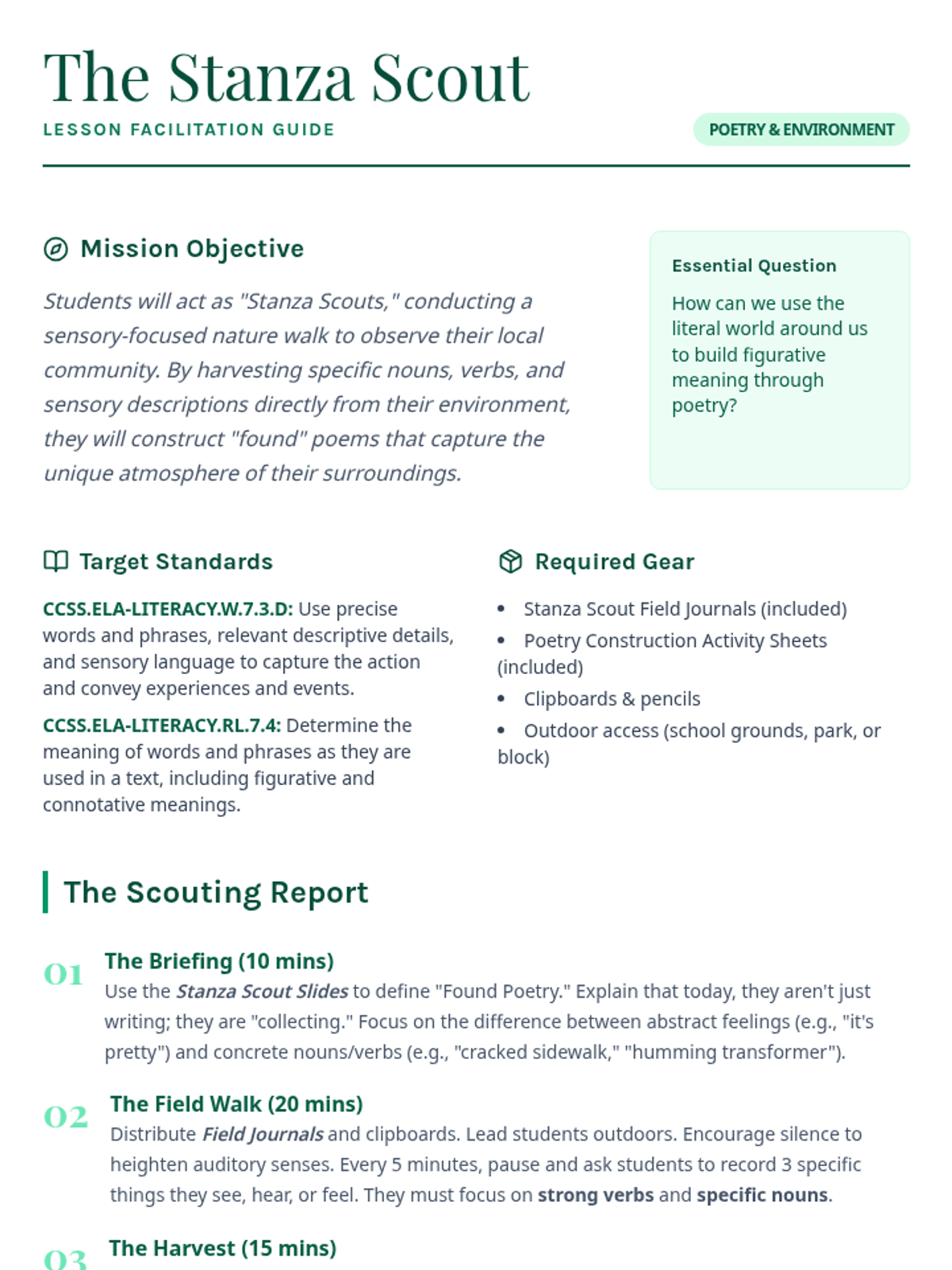 A middle school English Language Arts lesson where students conduct a sensory nature walk to collect 'found' words and transform them into original environmental poetry.