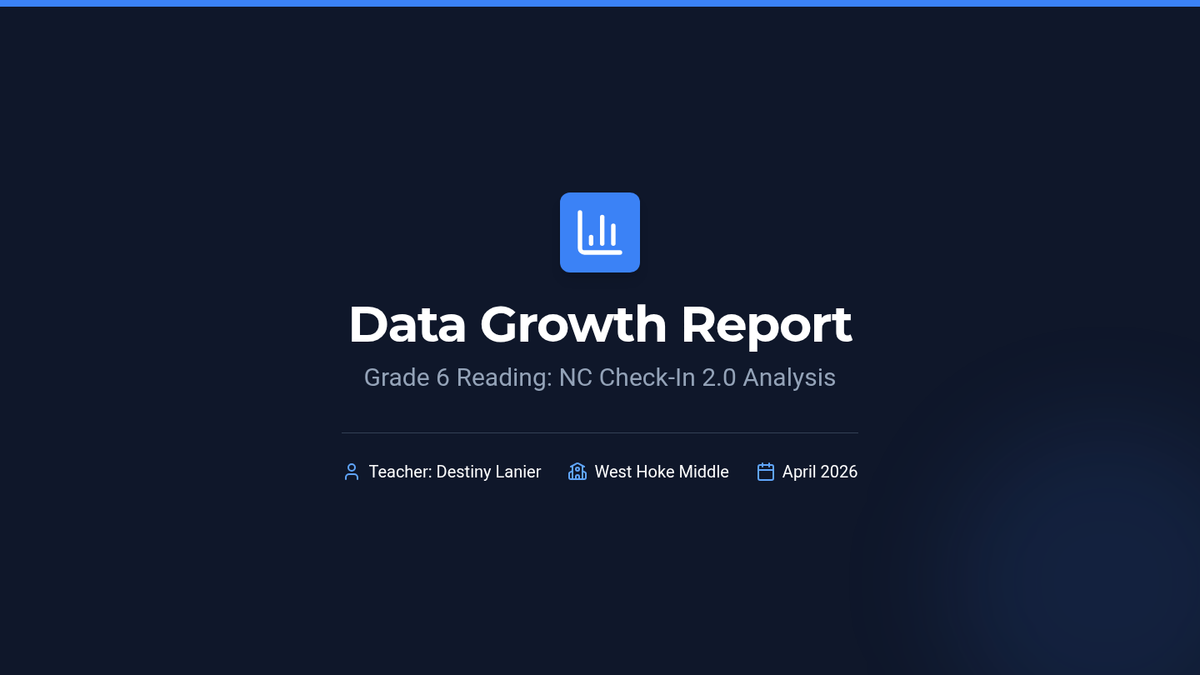 A comprehensive data analysis presentation for administrators, tracking student growth across Grade 6 NC Check-In cycles with a focus on vocabulary, informational text mastery, and overall test trends.
