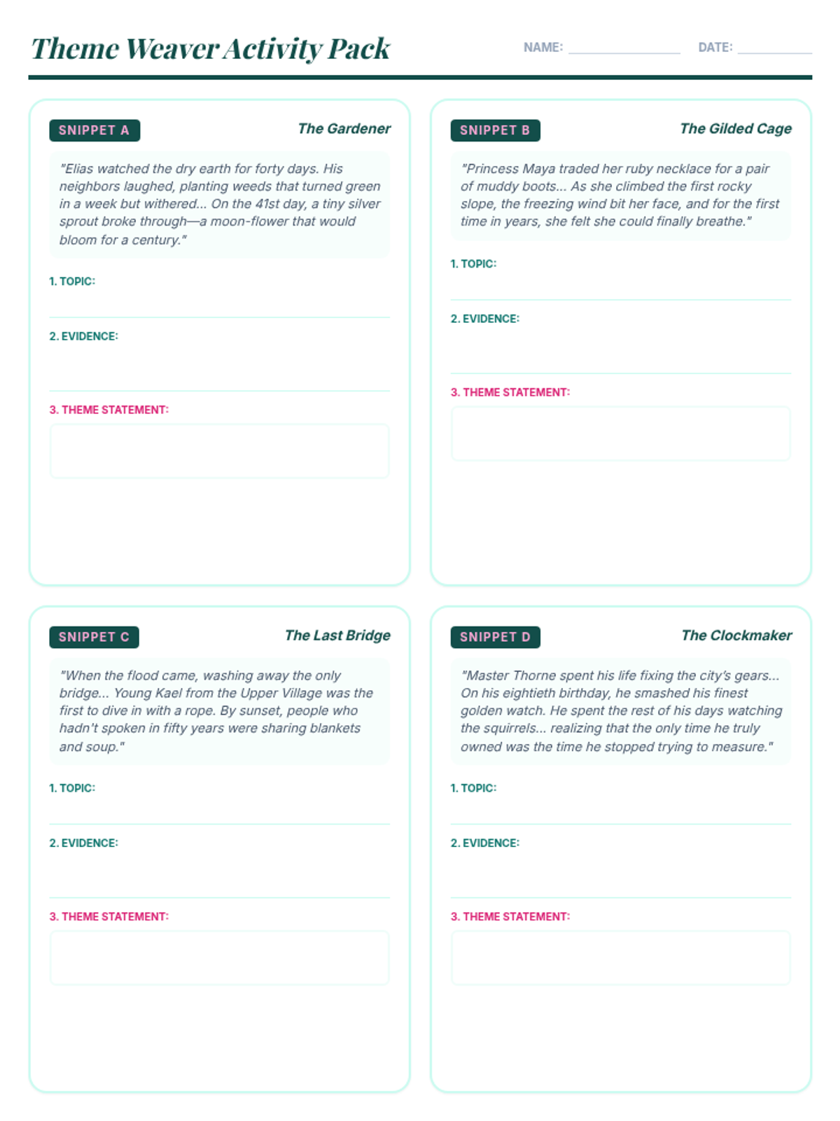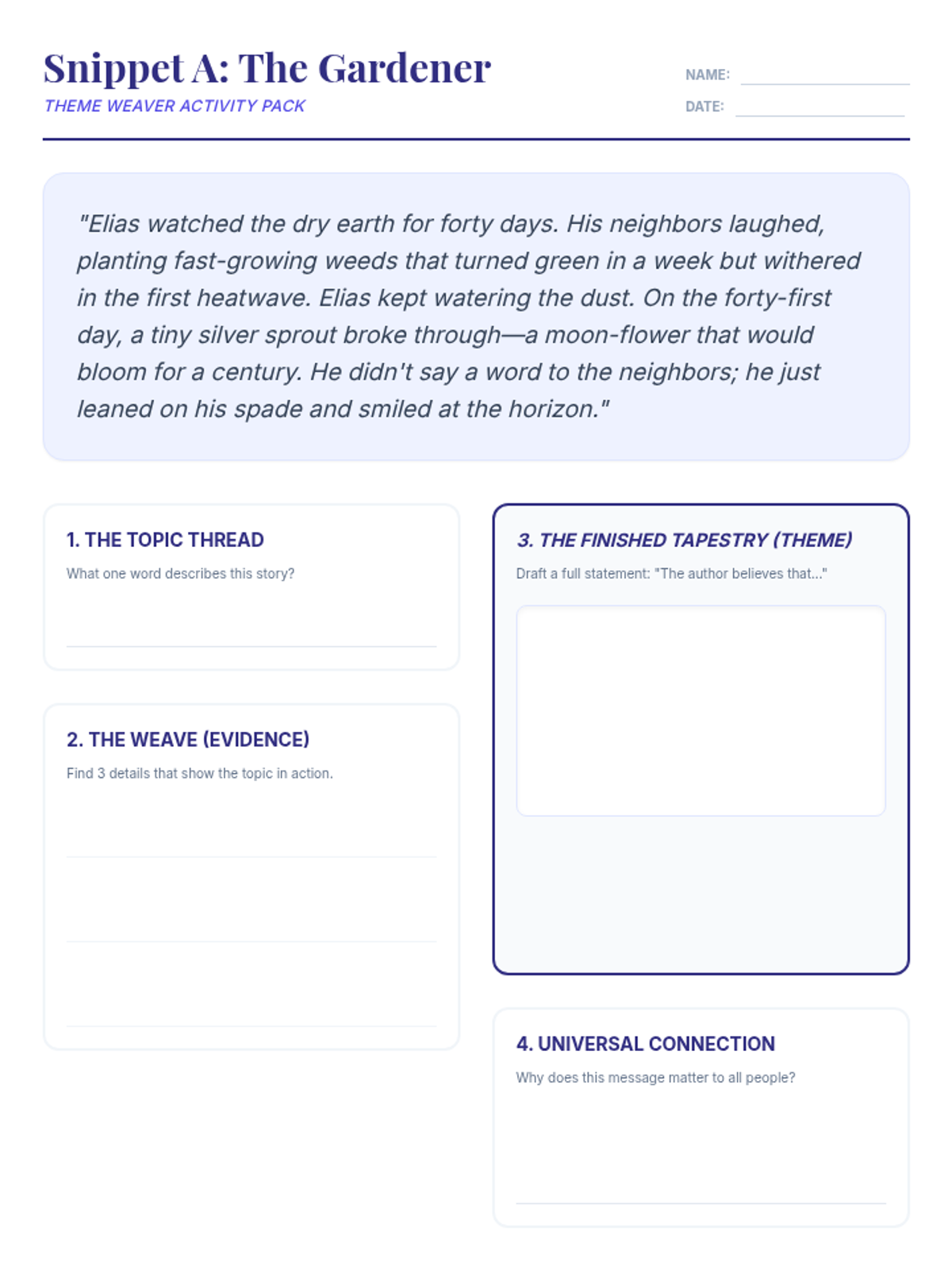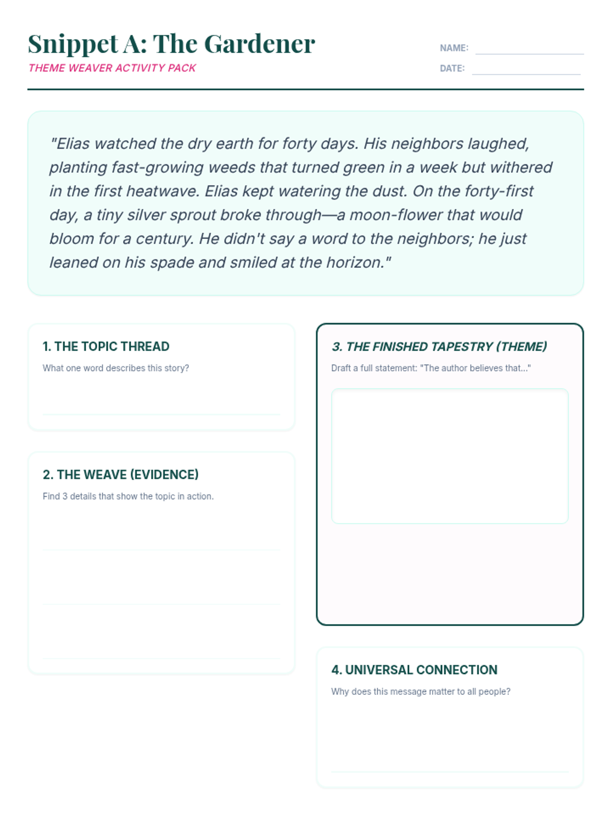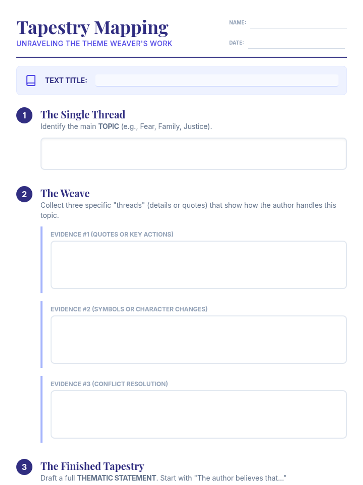 An 8th-grade ELA lesson where students become 'theme weavers' to uncover universal truths in literature. They will learn to distinguish between topic and theme, identify thematic statements, and support their findings with textual evidence.