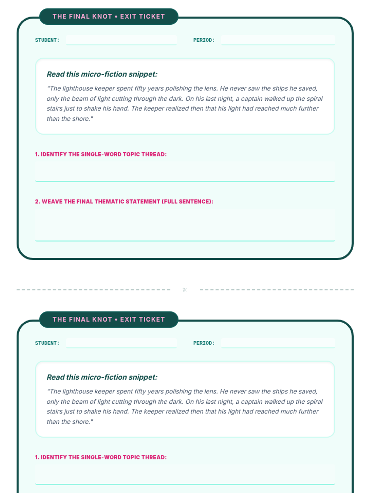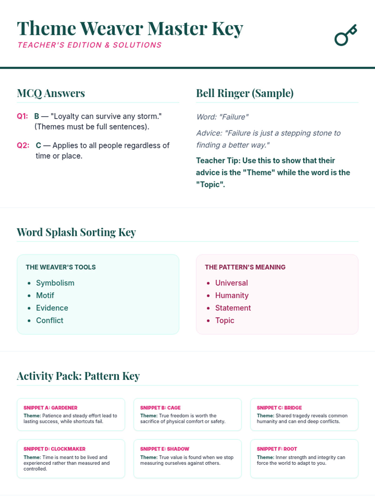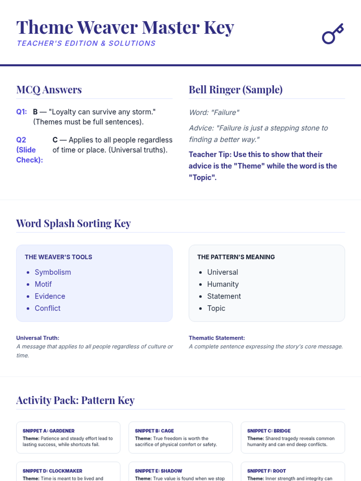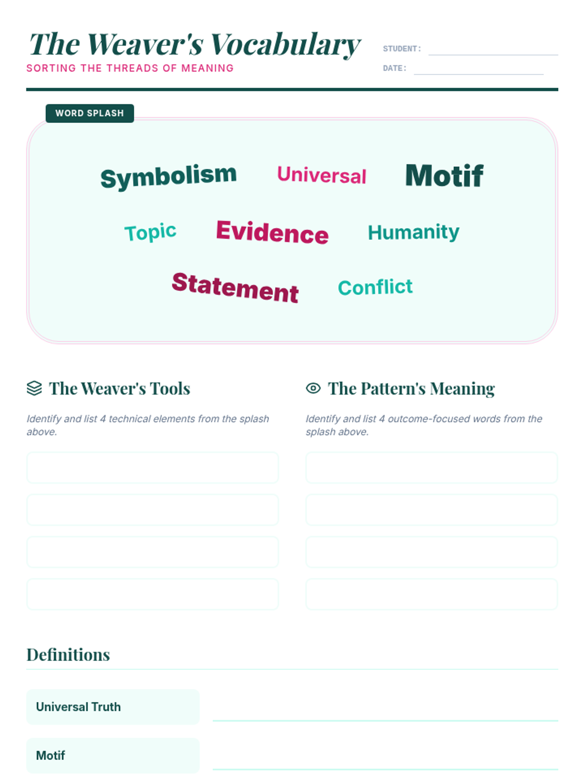 An 8th-grade ELA lesson where students become 'theme weavers' to uncover universal truths in literature. They will learn to distinguish between topic and theme, identify thematic statements, and support their findings with textual evidence.