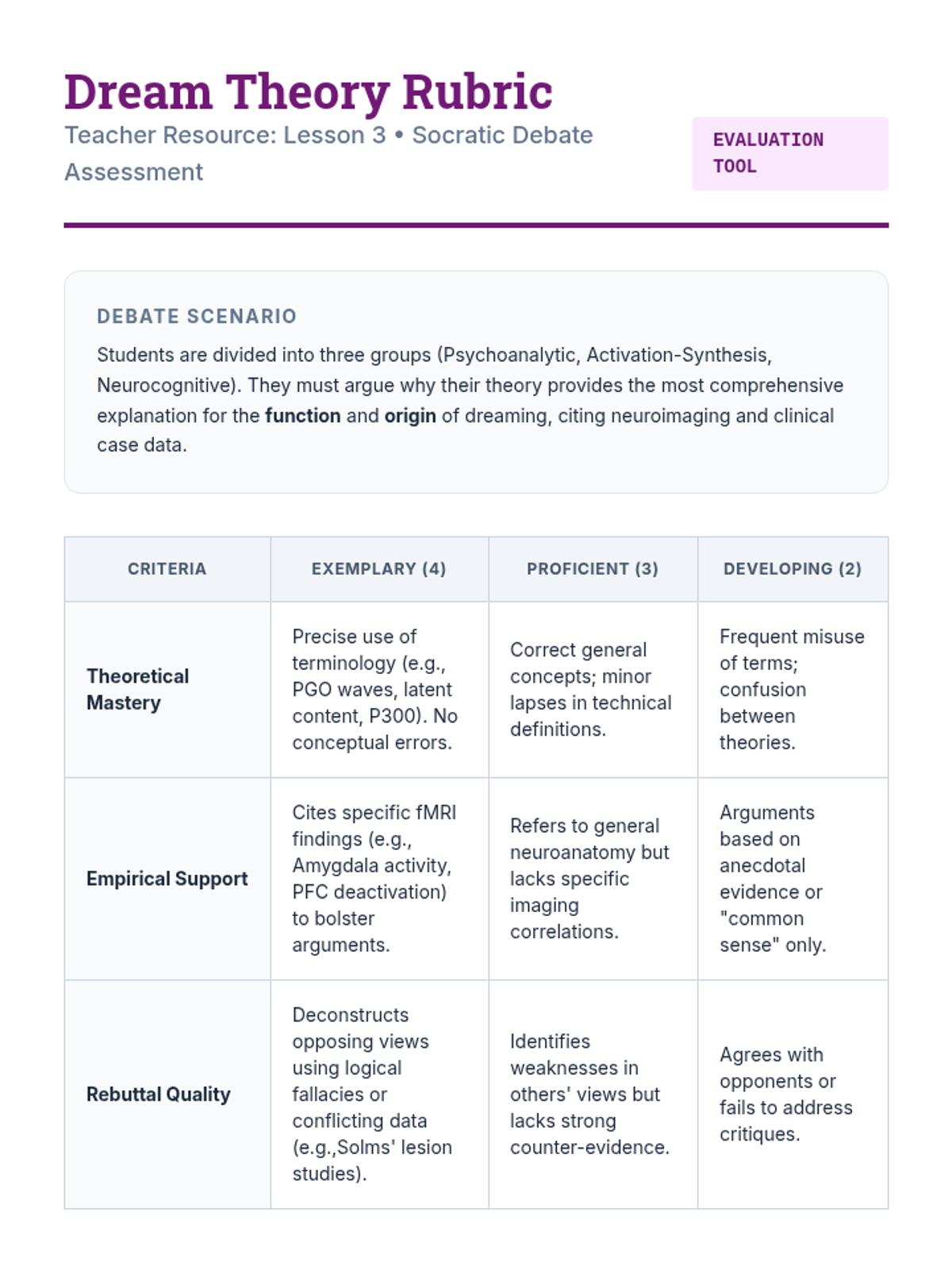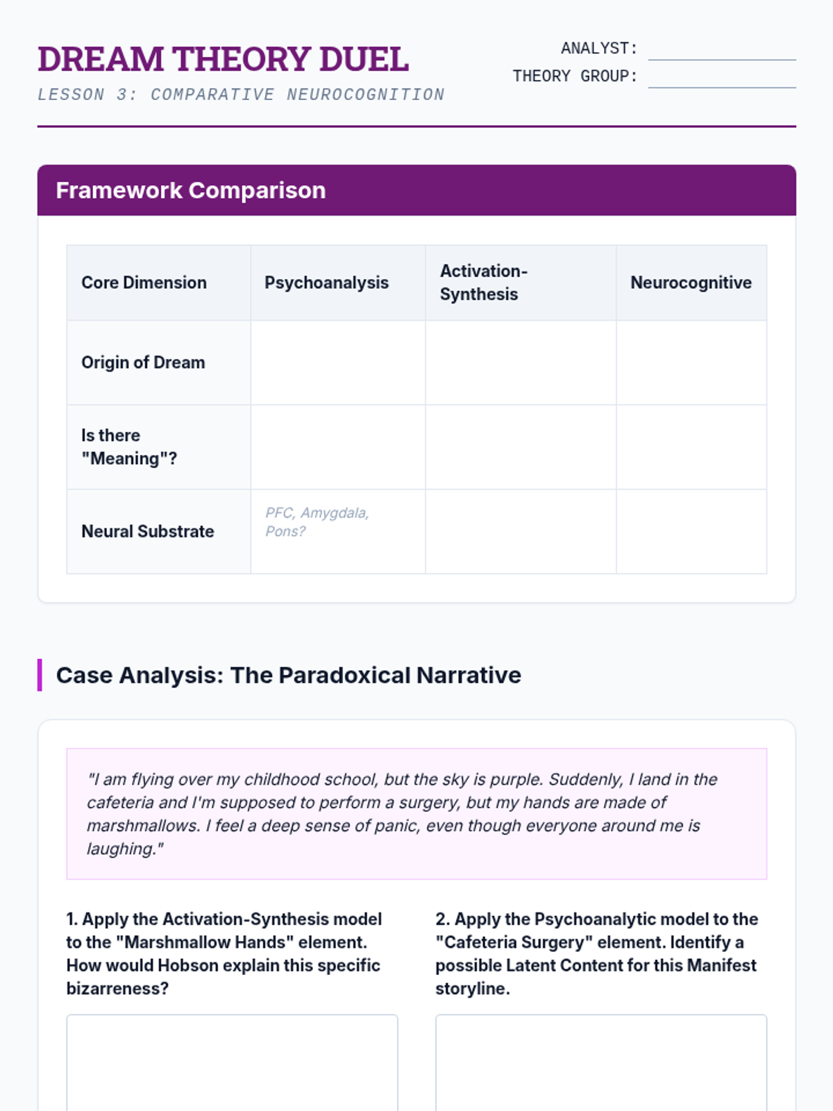 Students compare and contrast major theories of dreaming, including psychoanalytic, activation-synthesis, and neurocognitive perspectives, using contemporary neuroimaging evidence to evaluate the function of dreams.