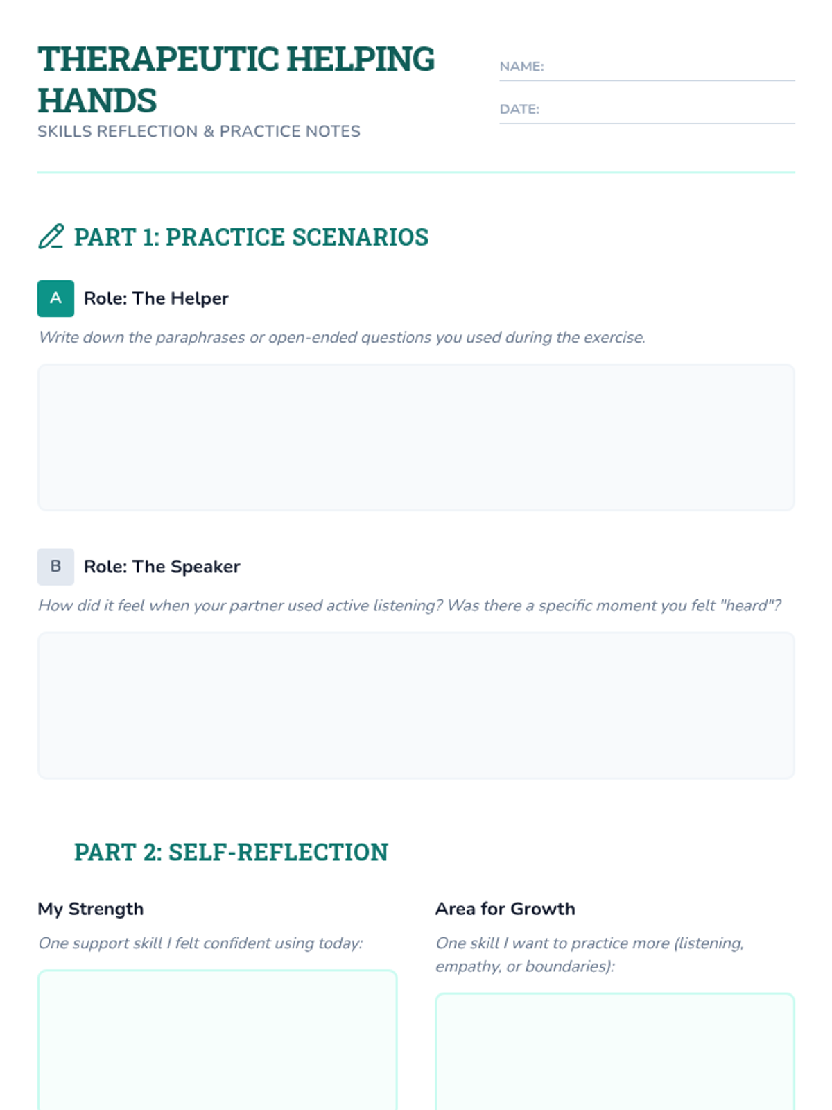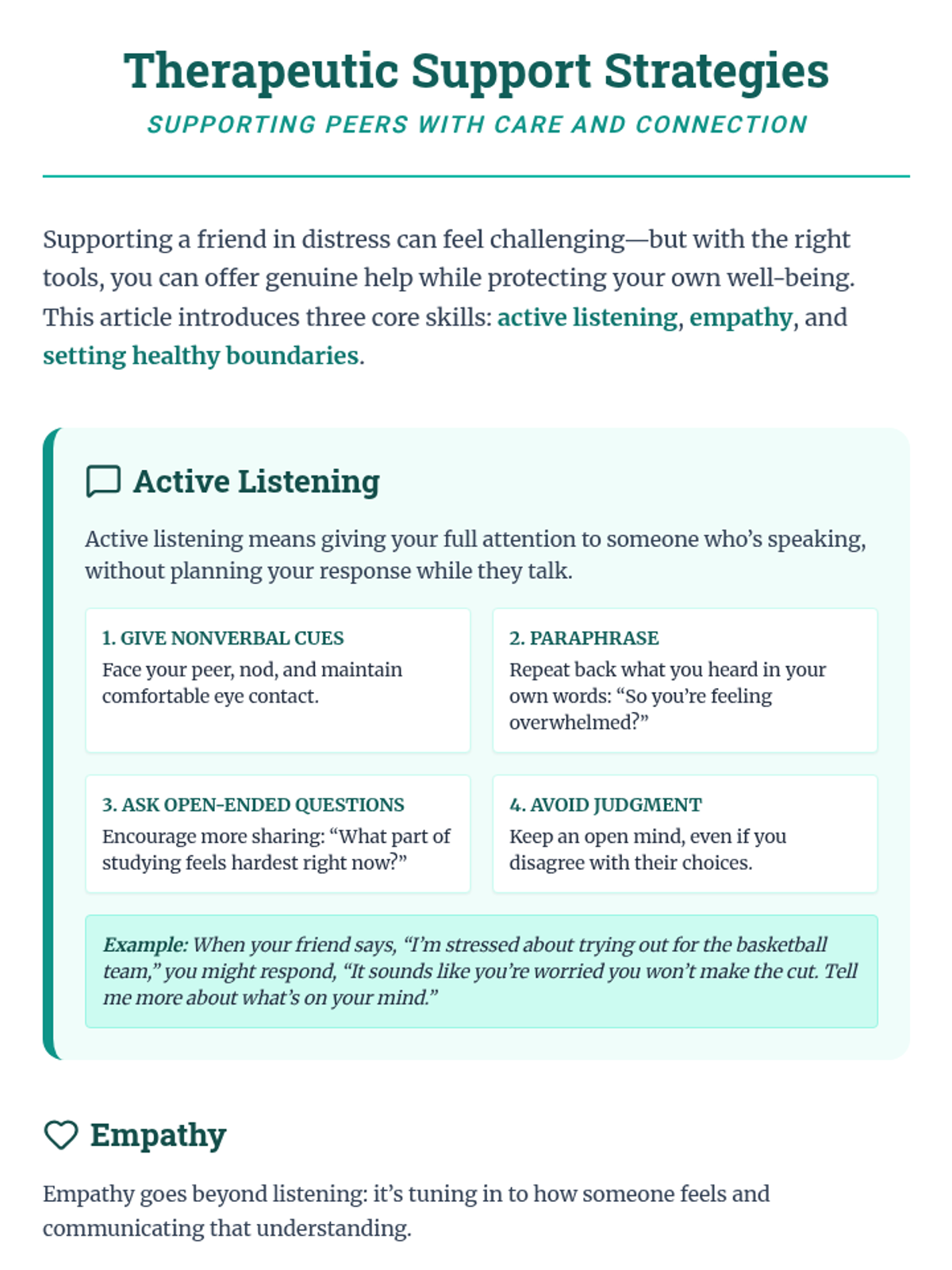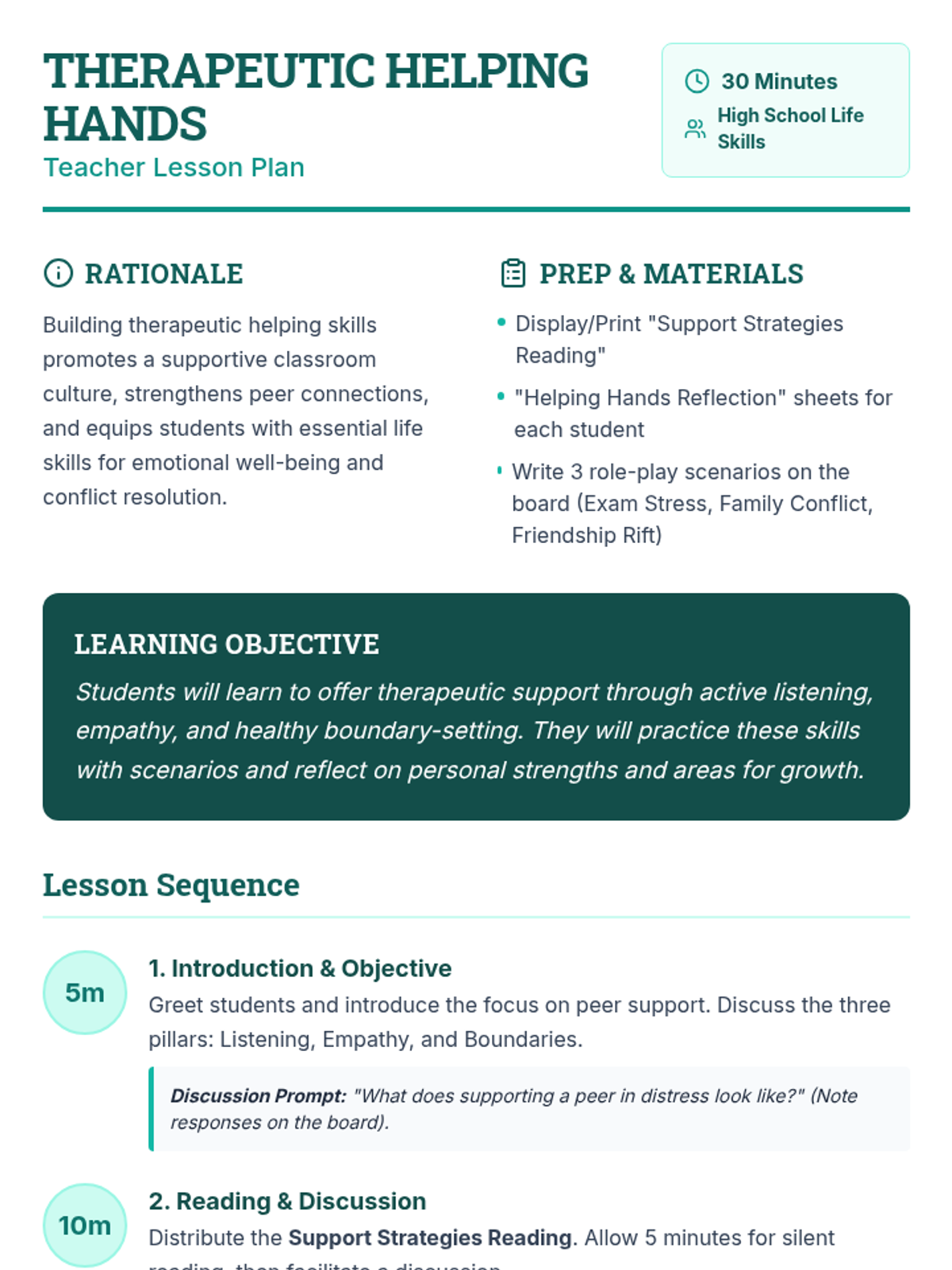 In this 30-minute life skills lesson, students learn practical strategies for offering therapeutic support to peers. This lesson equips students with active listening, empathy, and boundary-setting skills to foster a supportive classroom environment.