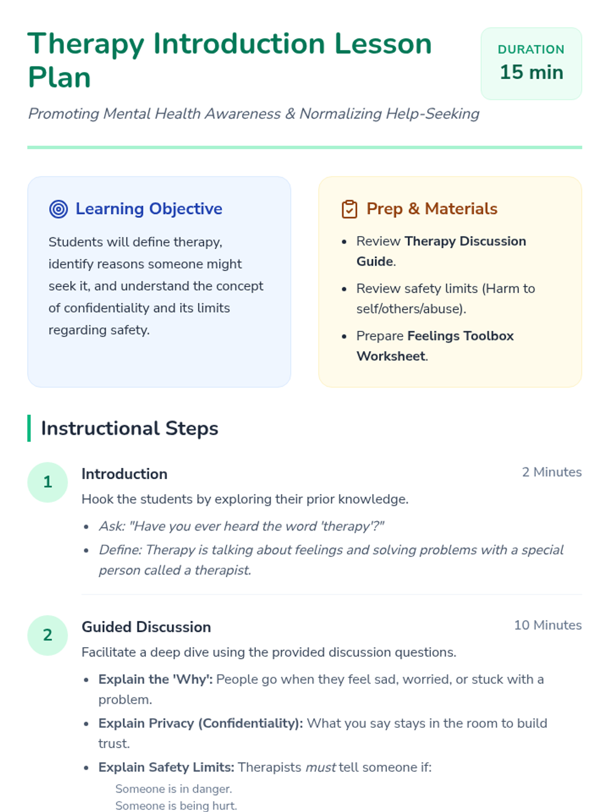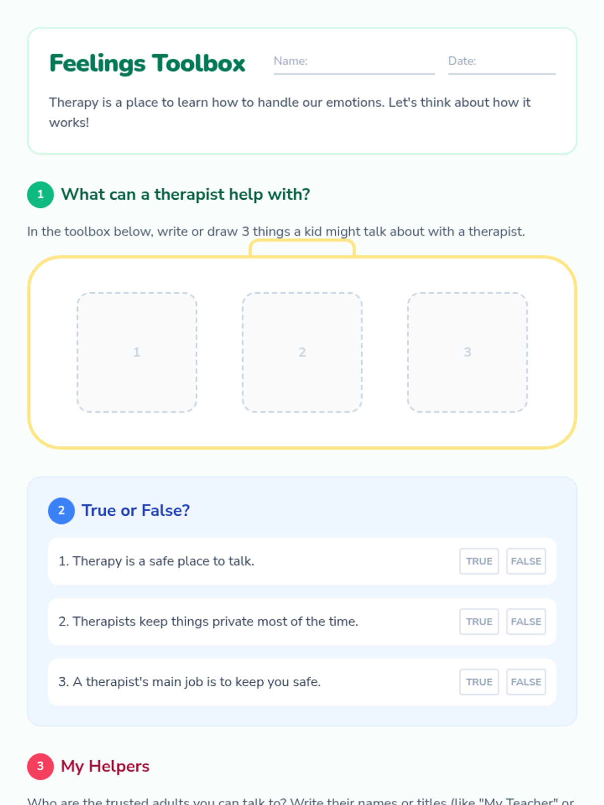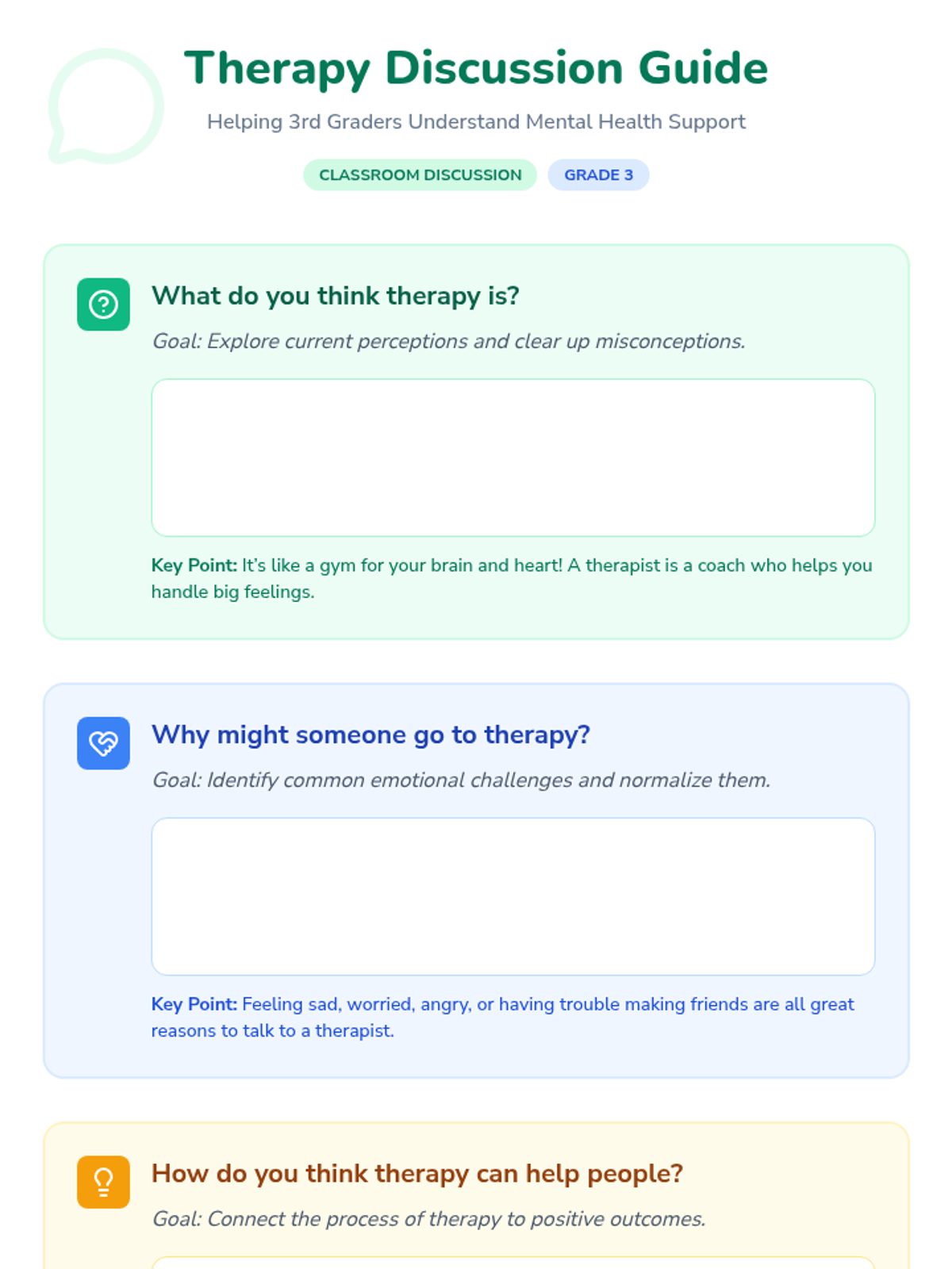 A gentle introduction for 3rd graders to understand what therapy is, why people go, and how it helps, including concepts of privacy and safety.