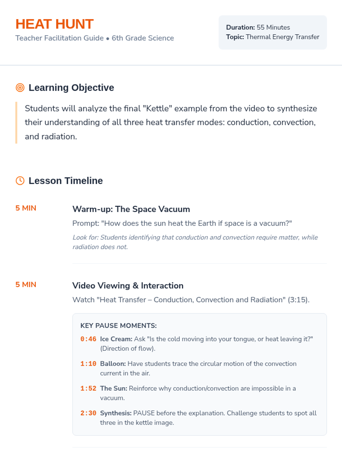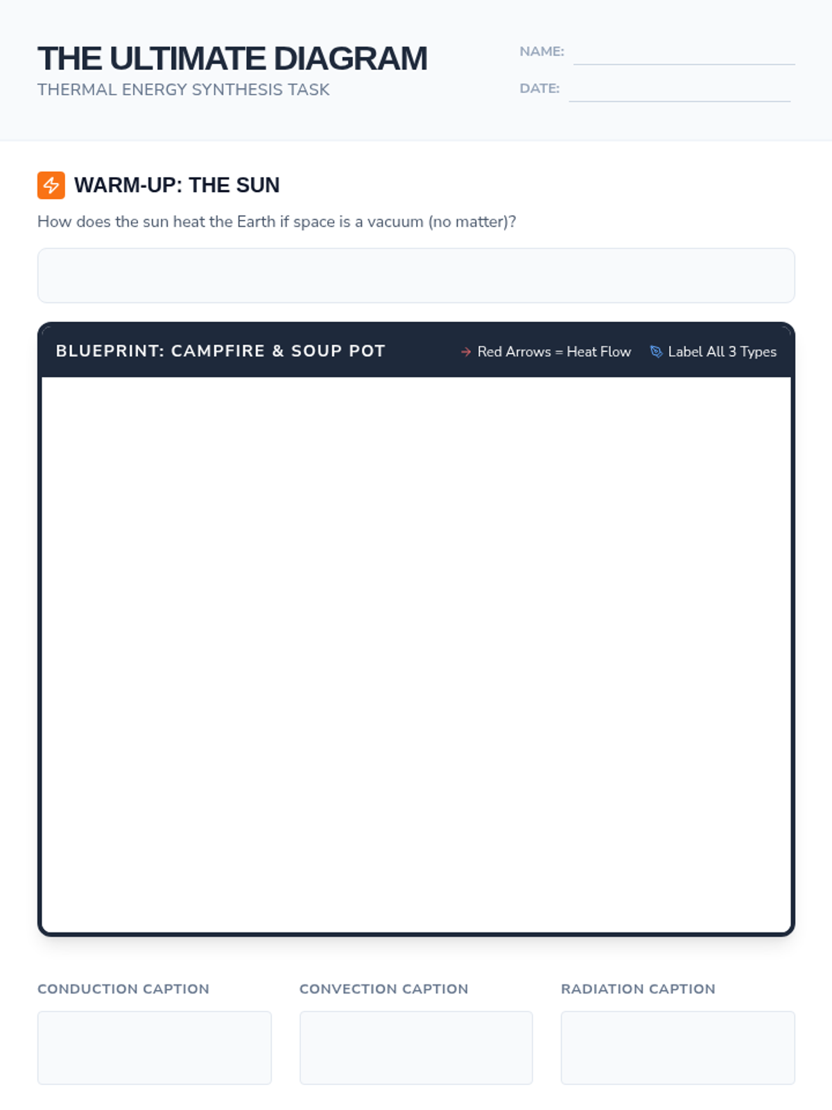 Students will synthesize their understanding of conduction, convection, and radiation by creating a scientific diagram of a campfire heating a pot of soup, using evidence from a video on heat transfer.