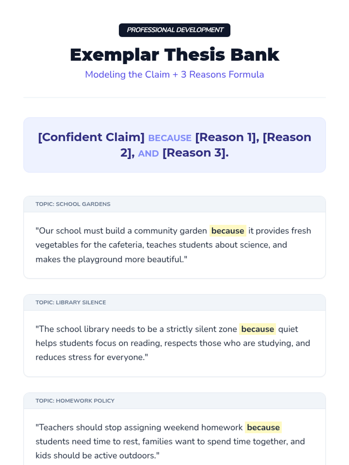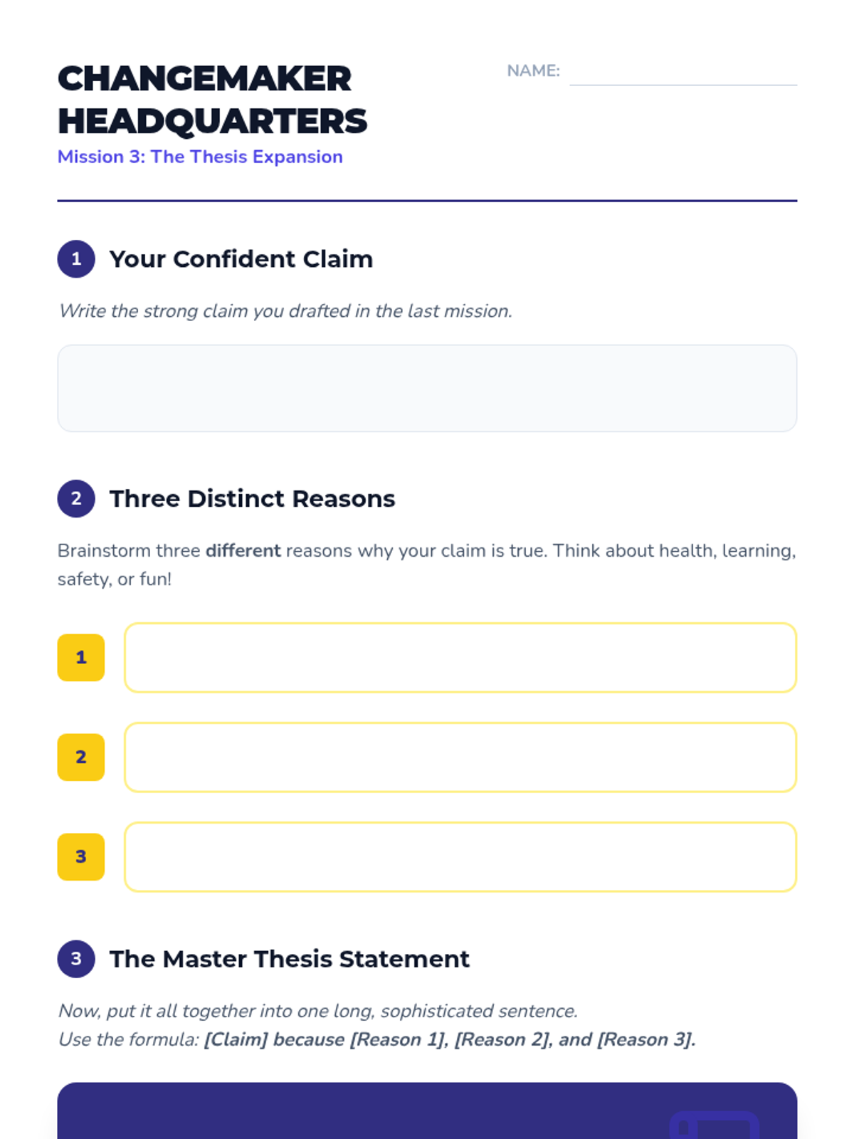 Students expand their claim by adding three supporting reasons using a sophisticated thesis structure.