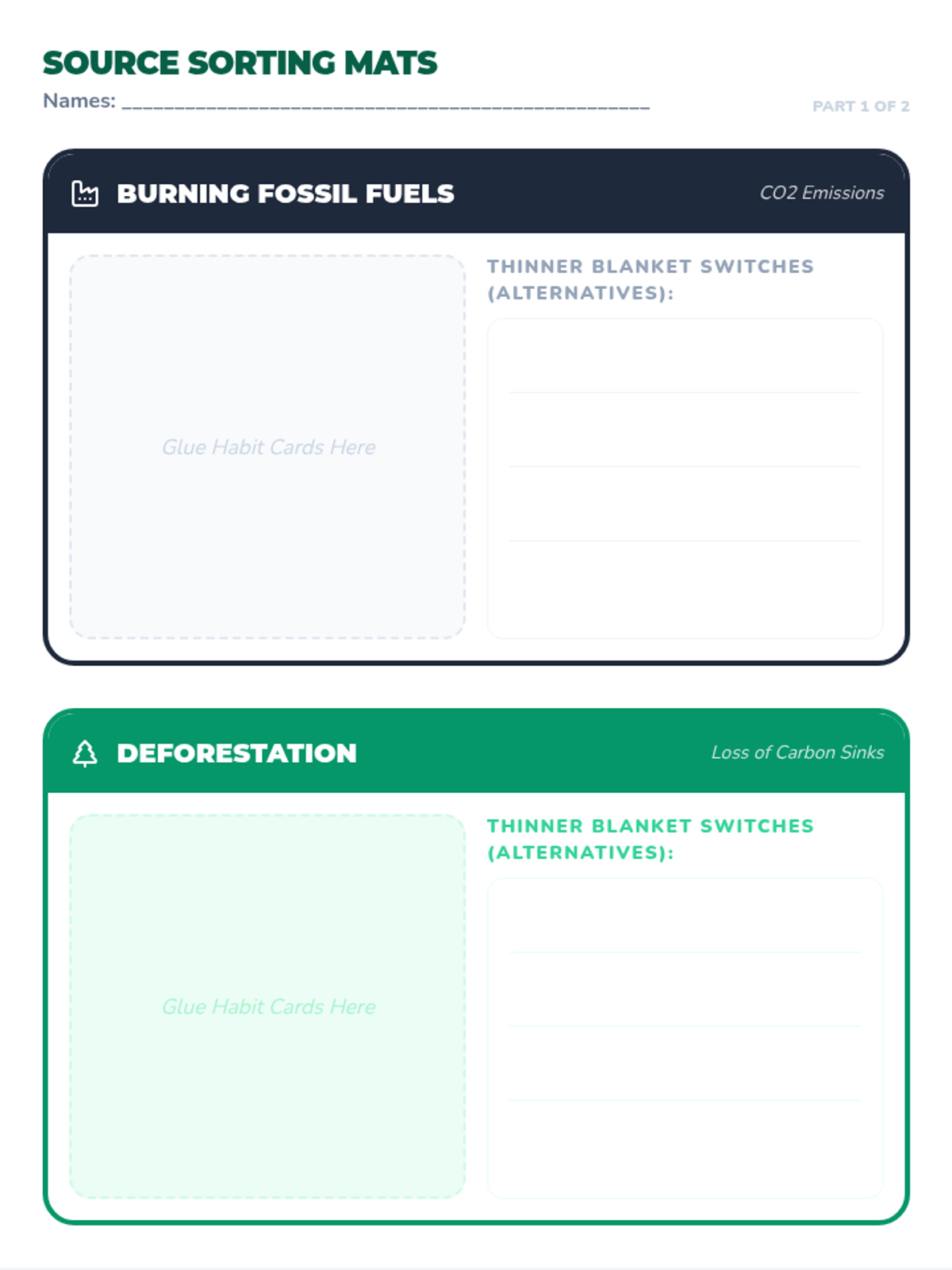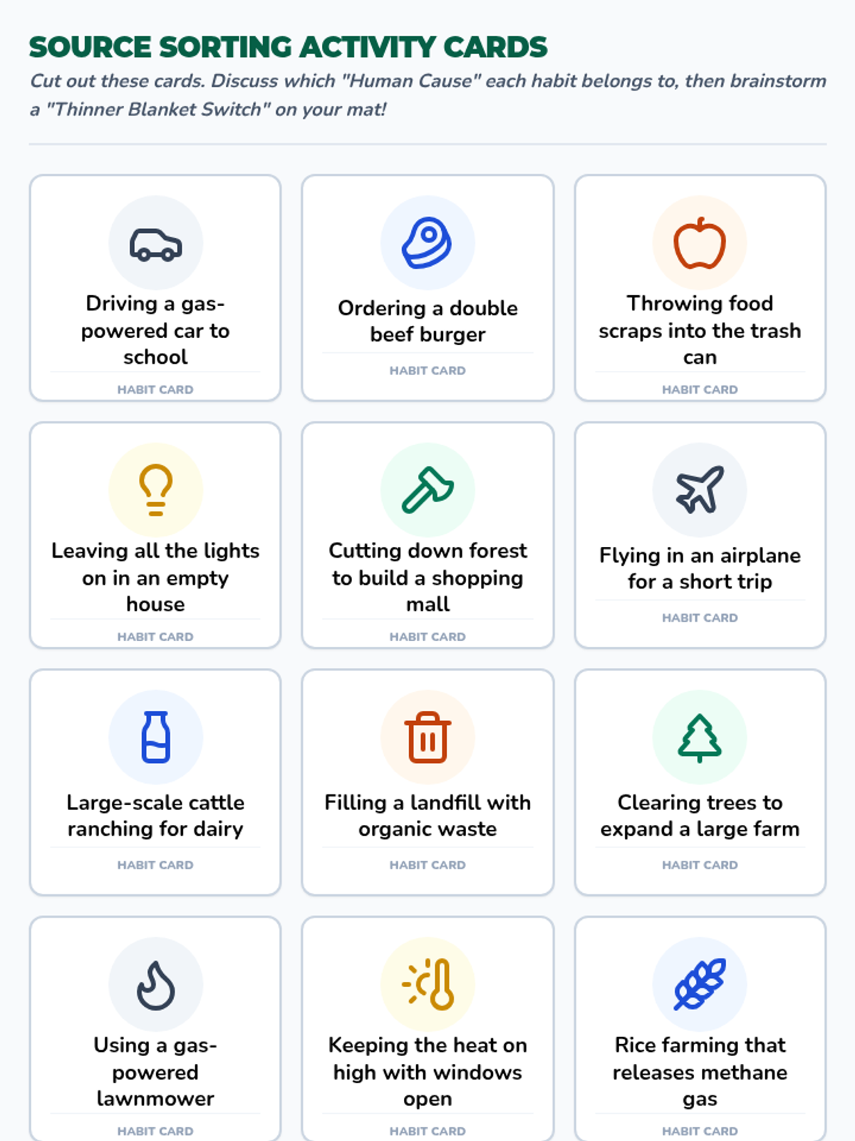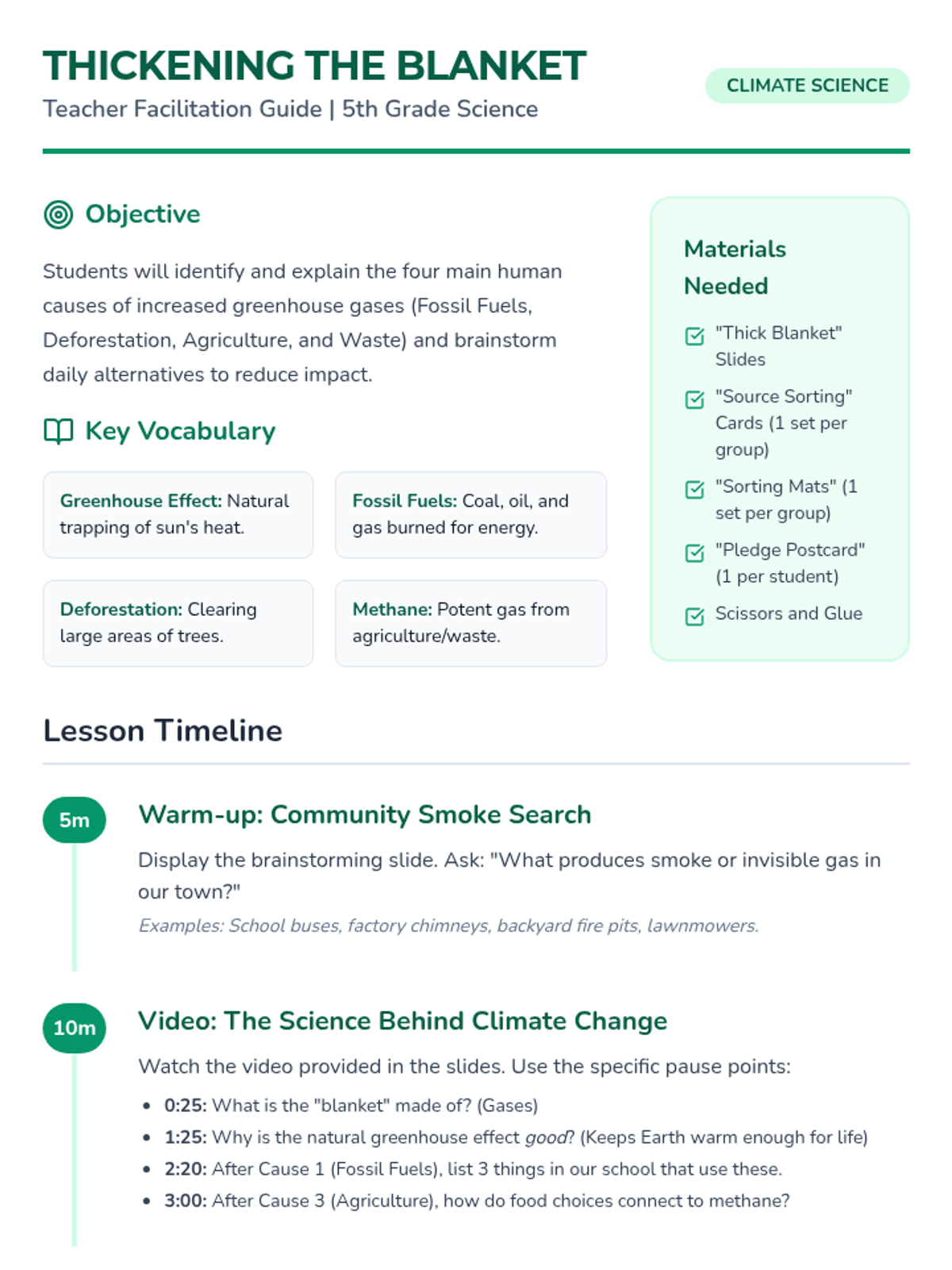 A lesson where students explore the four main human causes of increased greenhouse gases through a video analysis, a sorting activity of daily habits, and a reflective pledge postcard.