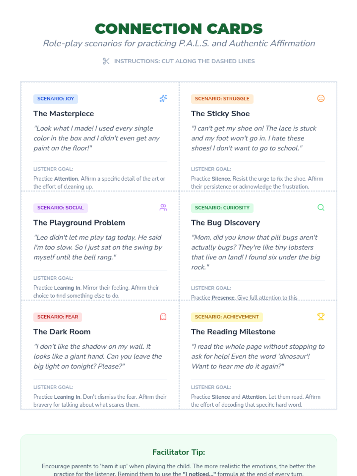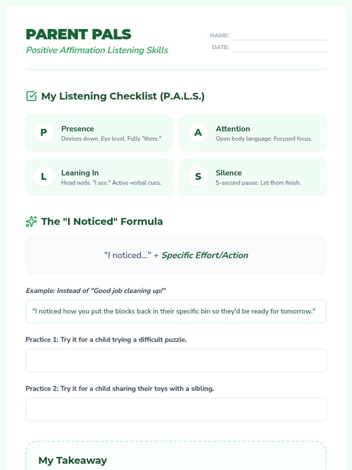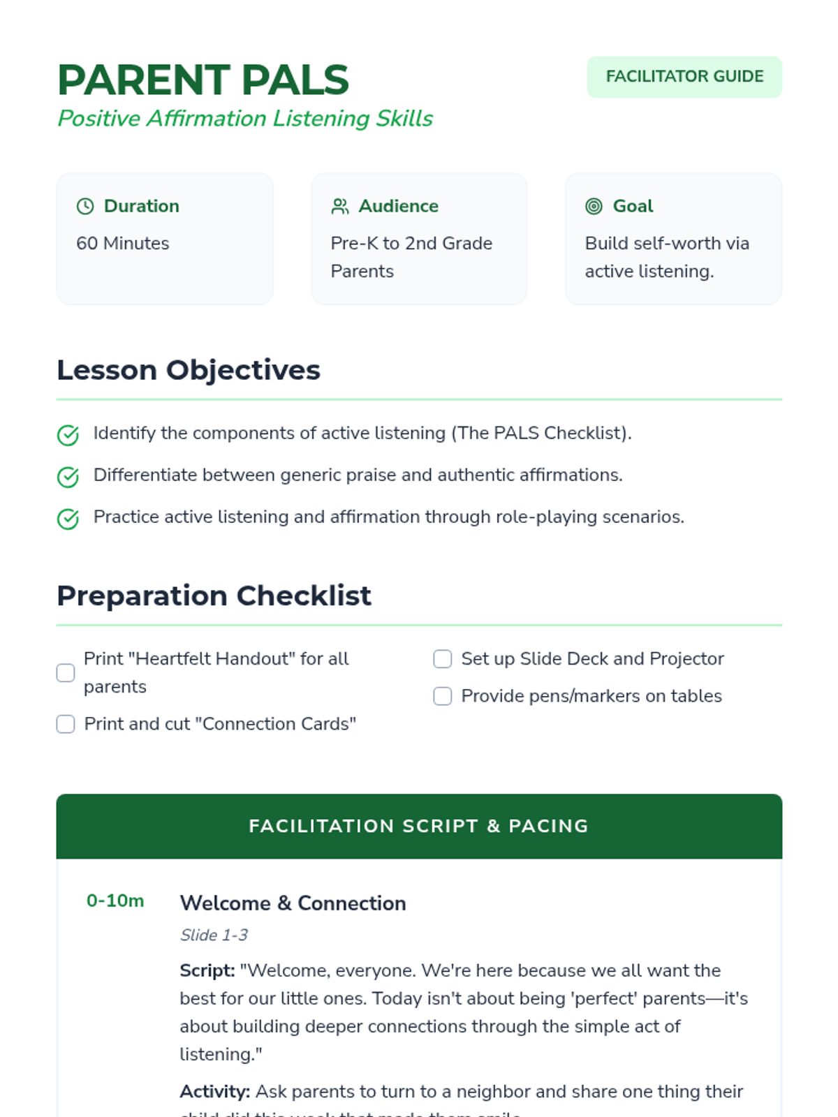 A parent-education lesson focused on active listening and positive affirmation techniques for parents of Pre-K to 2nd-grade students. Parents will learn to strengthen their child's self-worth through practical strategies and role-playing exercises.